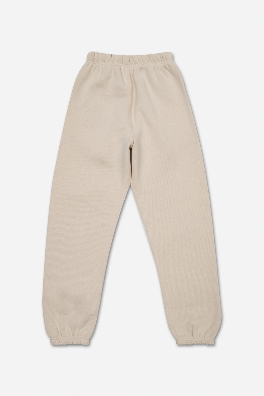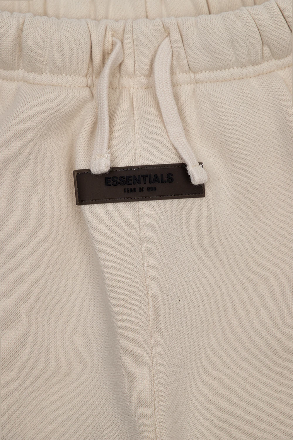 Kremowe spodnie dresowe Fear Of God Essentials Kids. Wykonane z bawełny. W pasie wszyta guma ściągana trokami. Ozdobione naszywką z logo. Dwie wsuwane kieszenie. Długie nogawki zakończone ściągaczem.