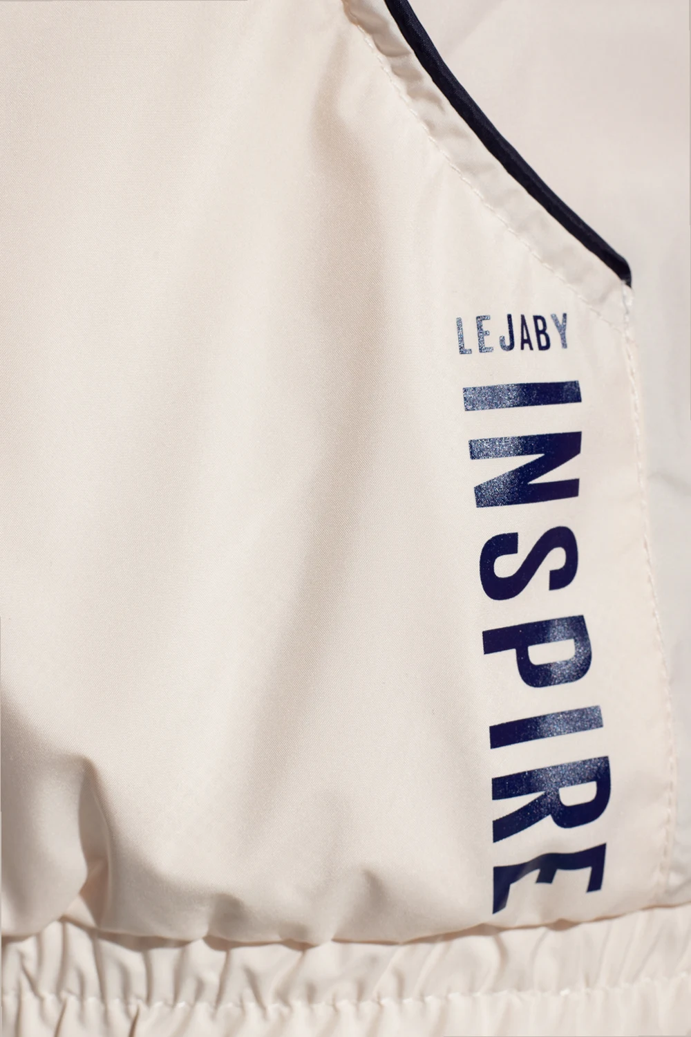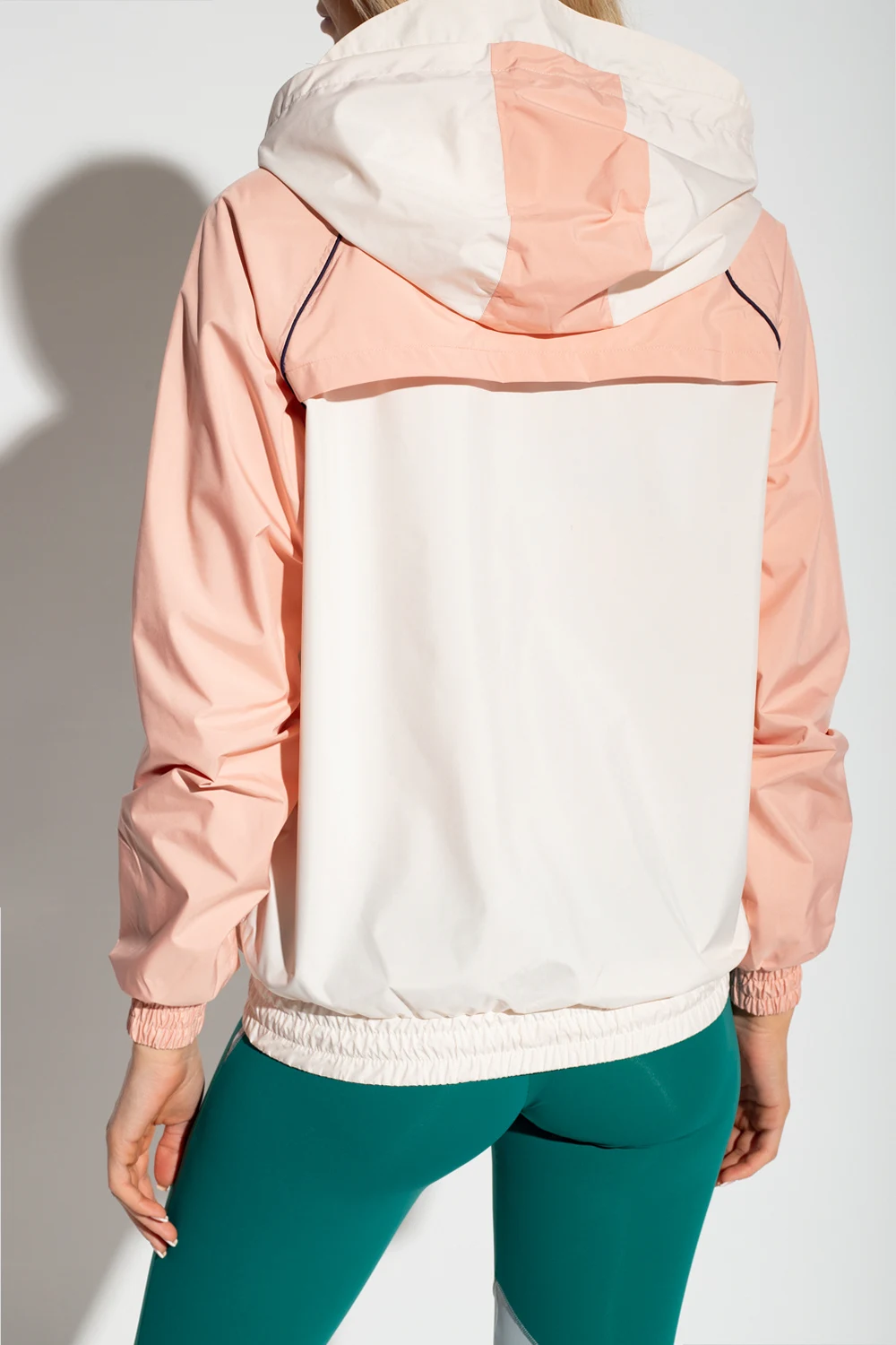 Różowo-kremowa, lekka kurtka przeciwdeszczowa Maison Lejaby. Wykonana z materiału z recyklingu. Z przodu zapinana na krótki zamek. Kaptur ściągany trokami. Ozdobiona nadrukowanym logo w kolorze granatowym. Wykończona czarnymi lamówkami. Wsuwana kieszeń. Długie rękawy i dół zakończone ściągaczem.