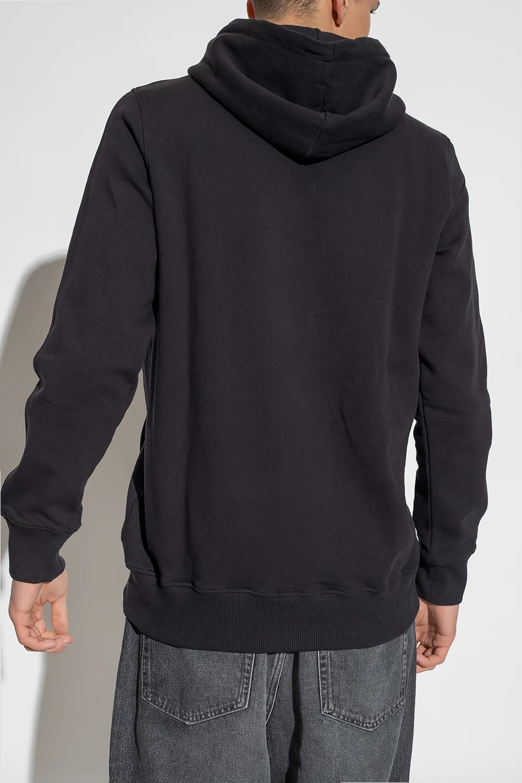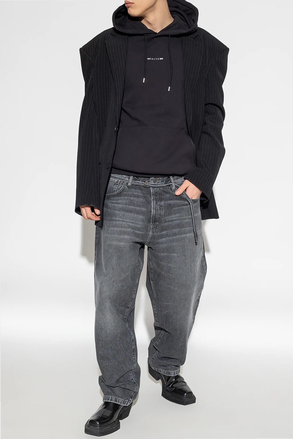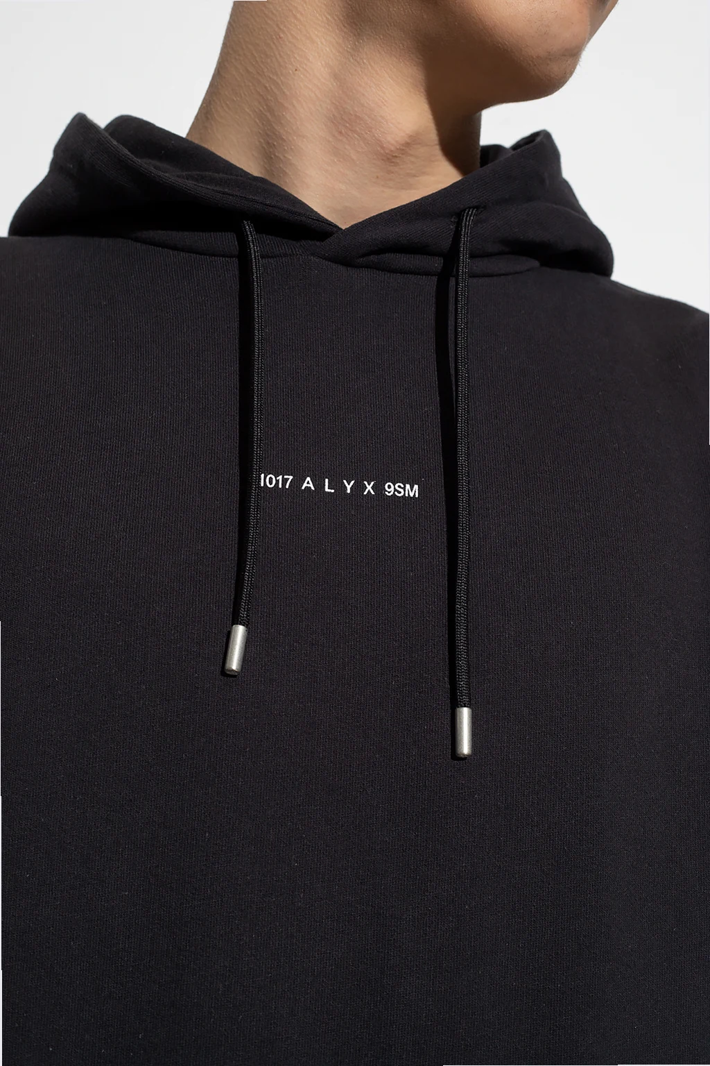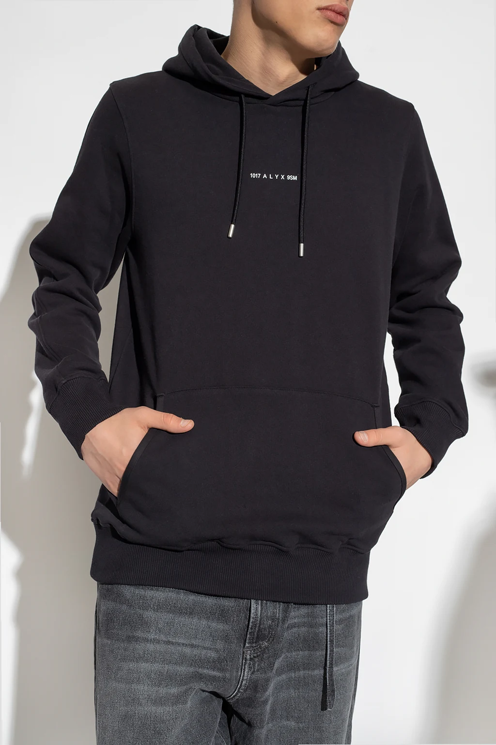 Czarna bluza 1017 ALYX 9SM. Wykonana z bawełny. Kaptur ściągany trokami. Z przodu ozdobiona nadrukowanym logo w kolorze białym. Wsuwana kieszeń. Długie rękawy i dół zakończone ściągaczem.