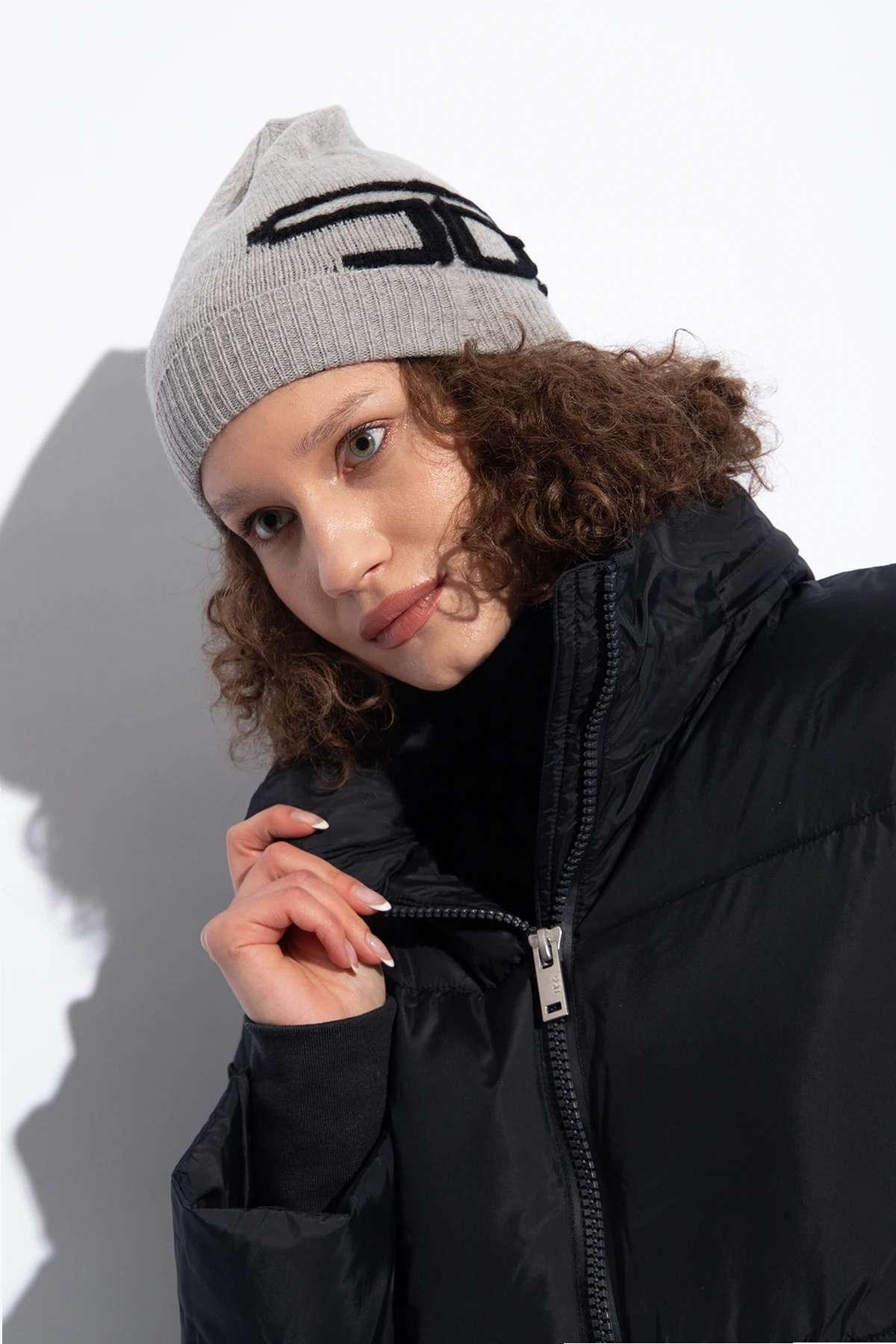 – Gruba czapka beanie z dzianiny z mieszanki wełny w kolorze szarym