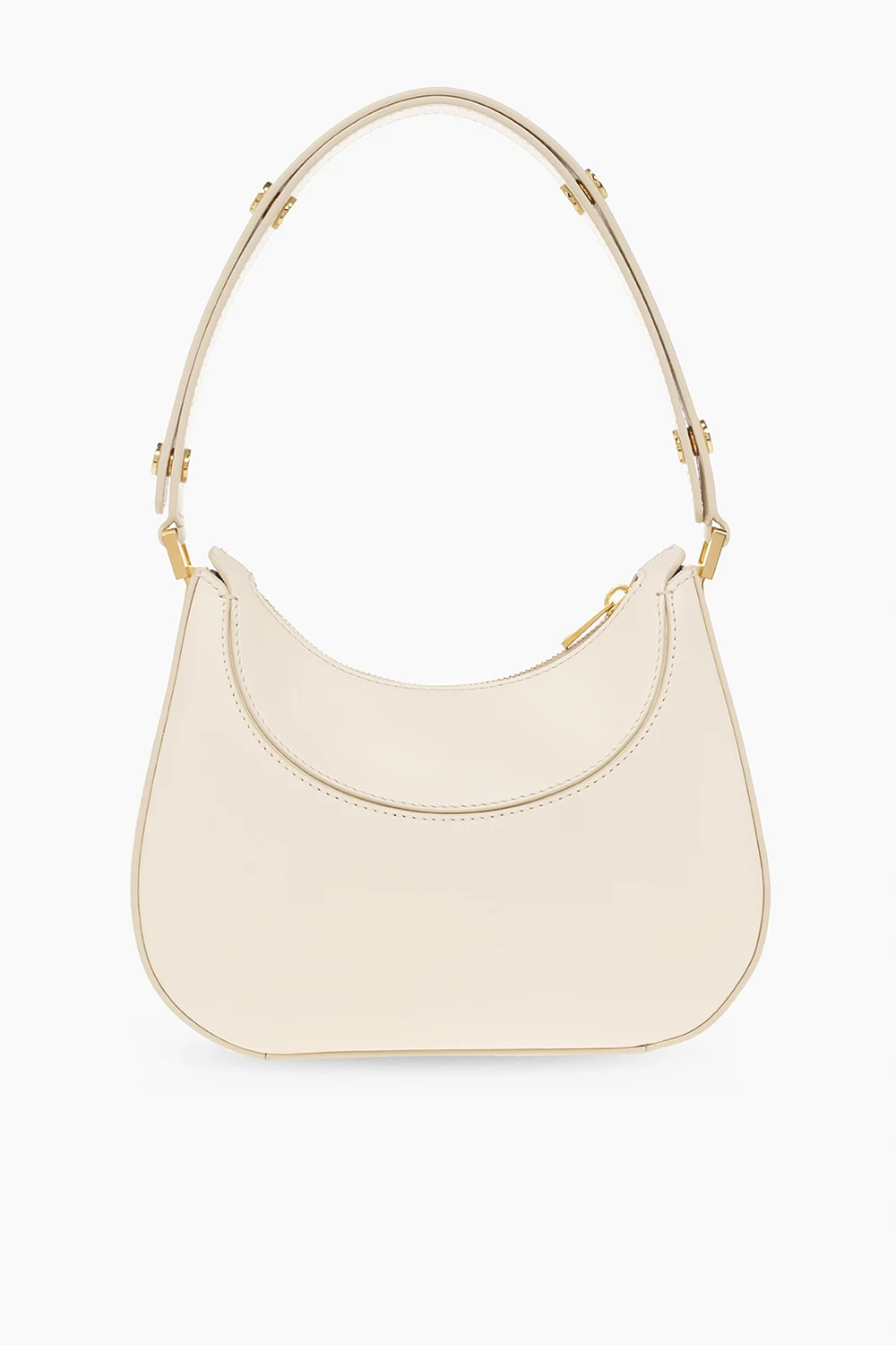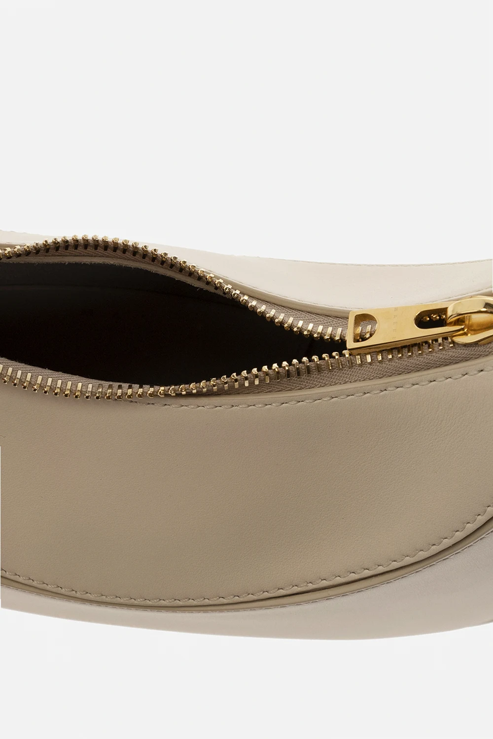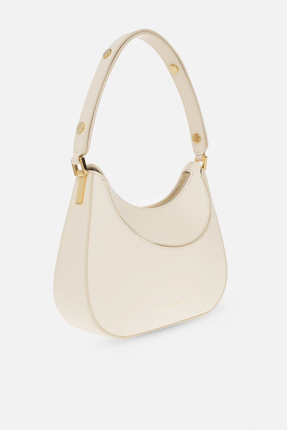 Kremowa torba na ramię, model 'Milano' Marni. Wykonana ze skóry cielęcej. Zamykana na zamek. Ozdobiona nadrukiem z logo. Półokrągła rączka. Odpinany pas na ramię z możliwością regulacji długości. Wewnątrz komora. Metalowe wykończenie w kolorze złotym.