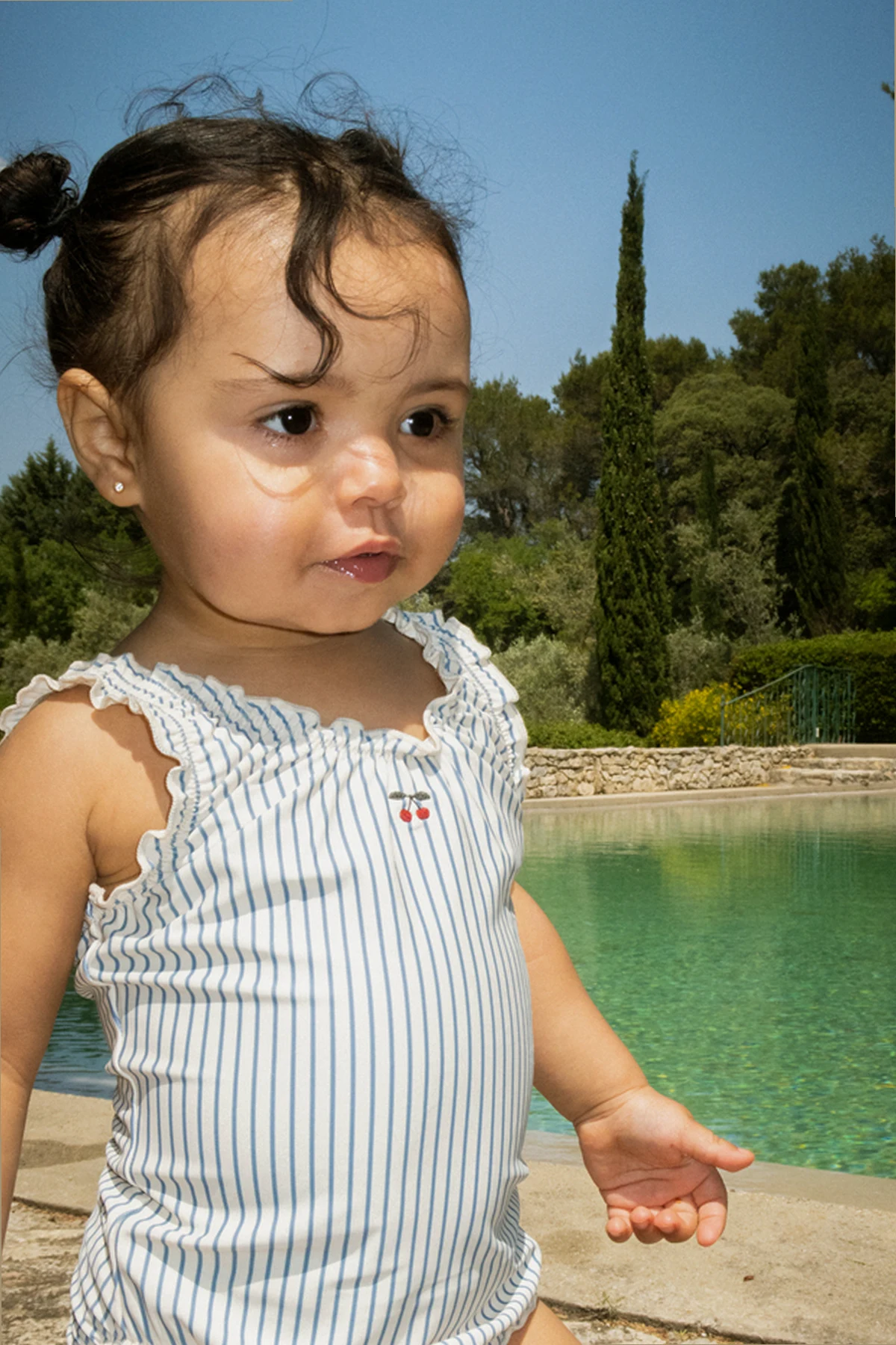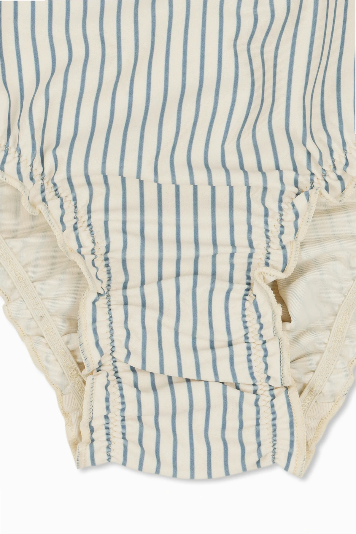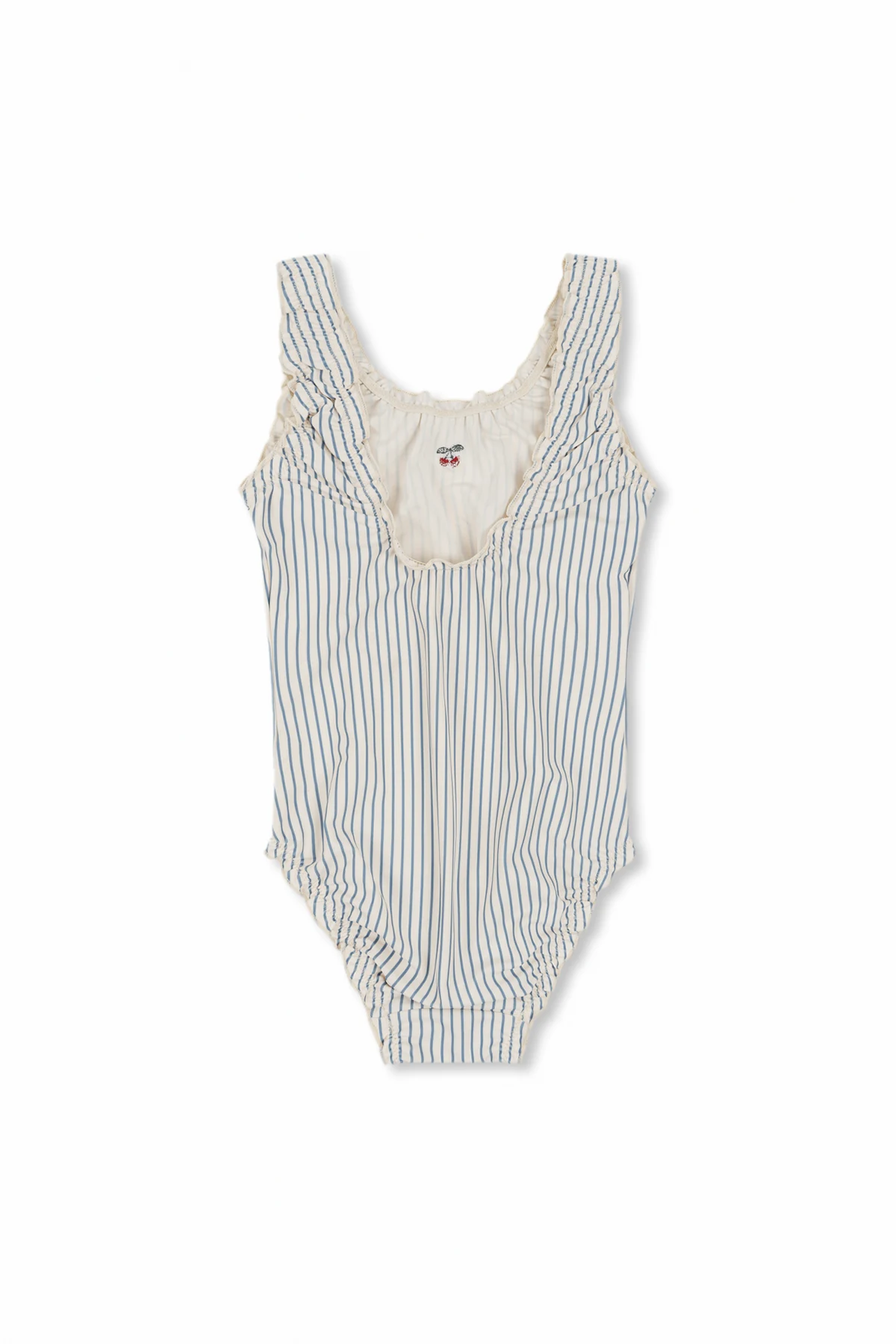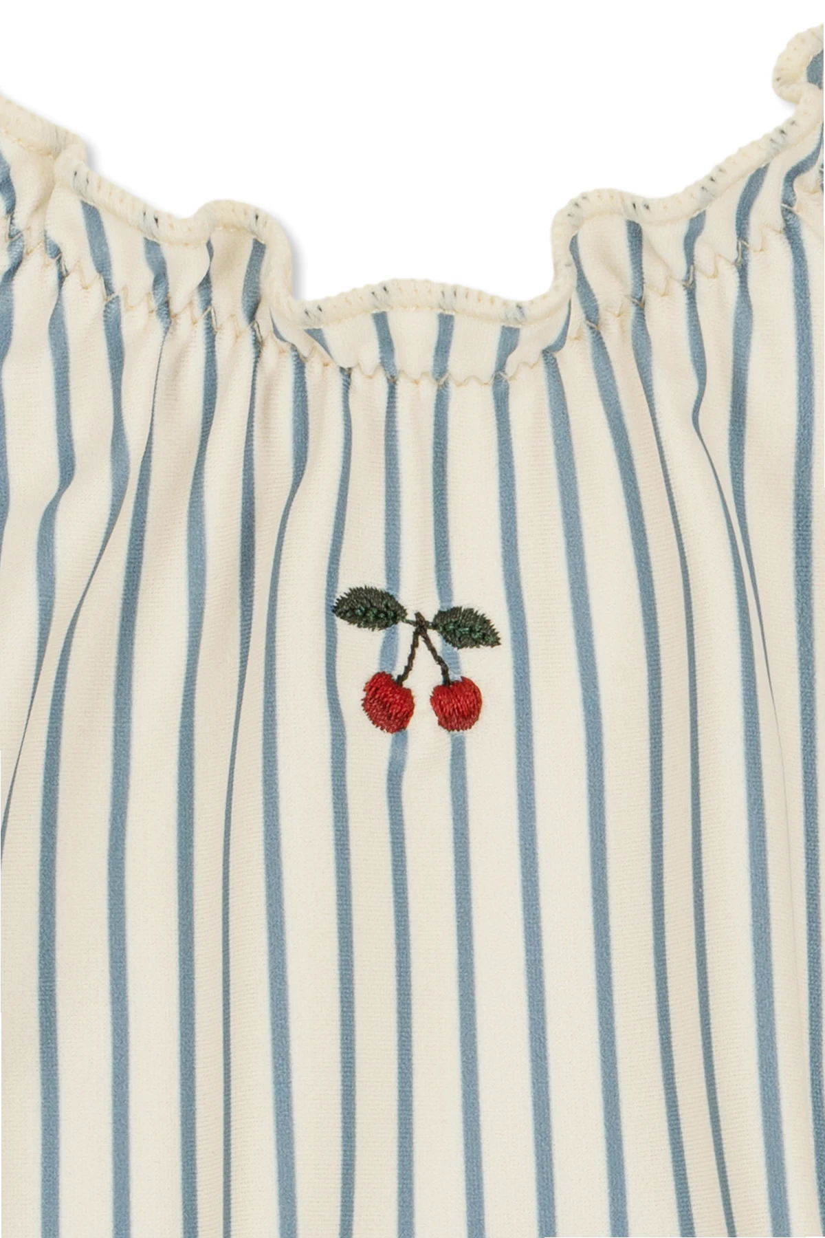 Zachwycający biały kolor tła, przełamany pionowymi, granatowymi paskami, nadaje temu kostiumowi ponadczasowej elegancji. Dodatkowy czar wprowadza delikatna falbanka wzdłuż zaokrąglonego dekoltu oraz urocze, haftowane logo w formie dwóch czerwonych wiśni, co stanowi subtelny, ale wyrazisty akcent.