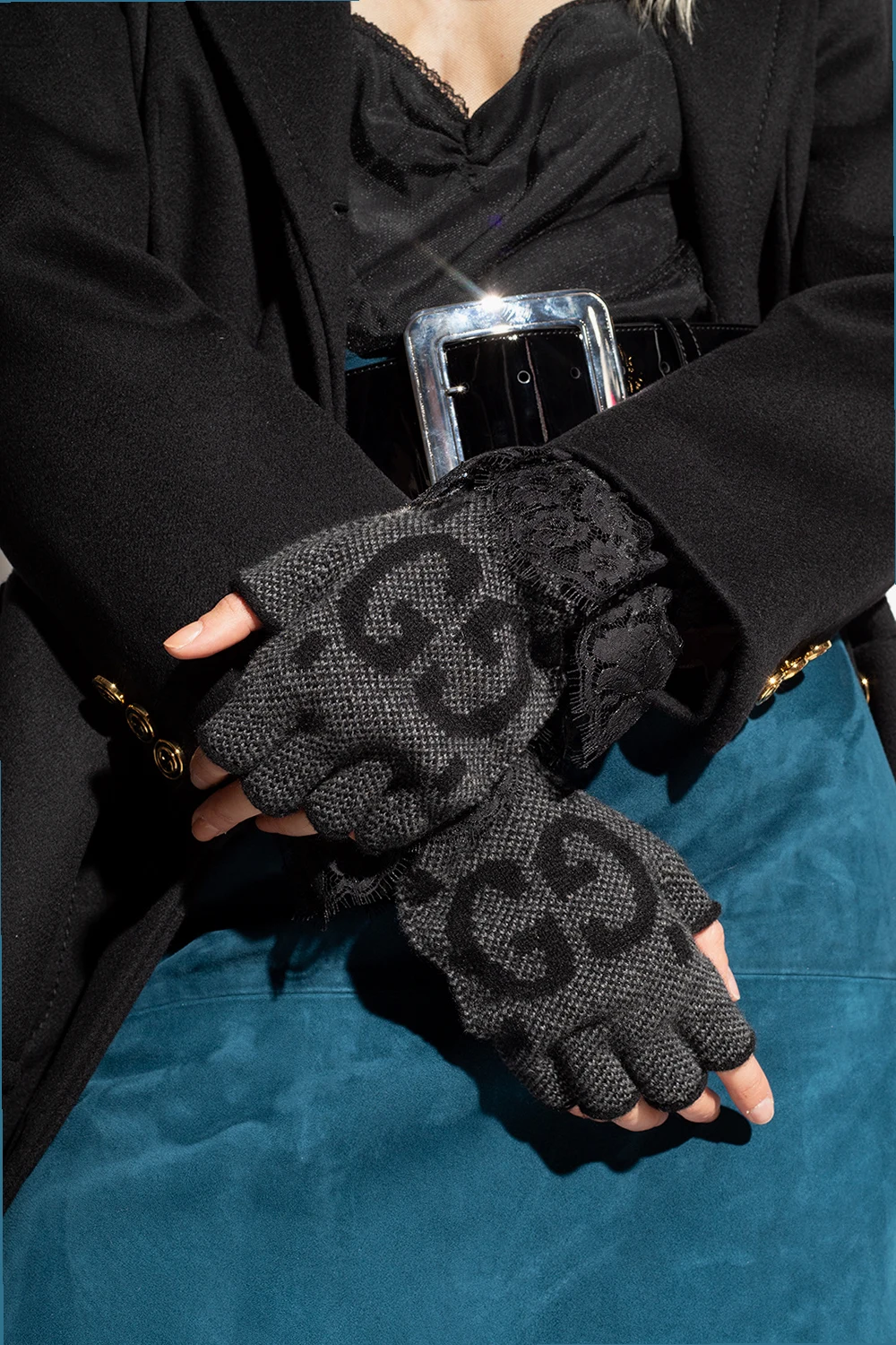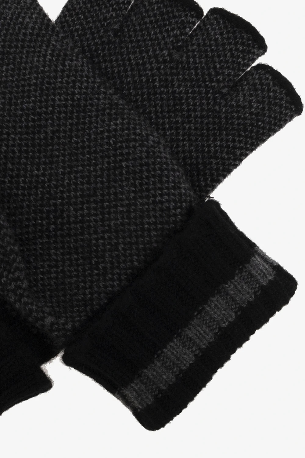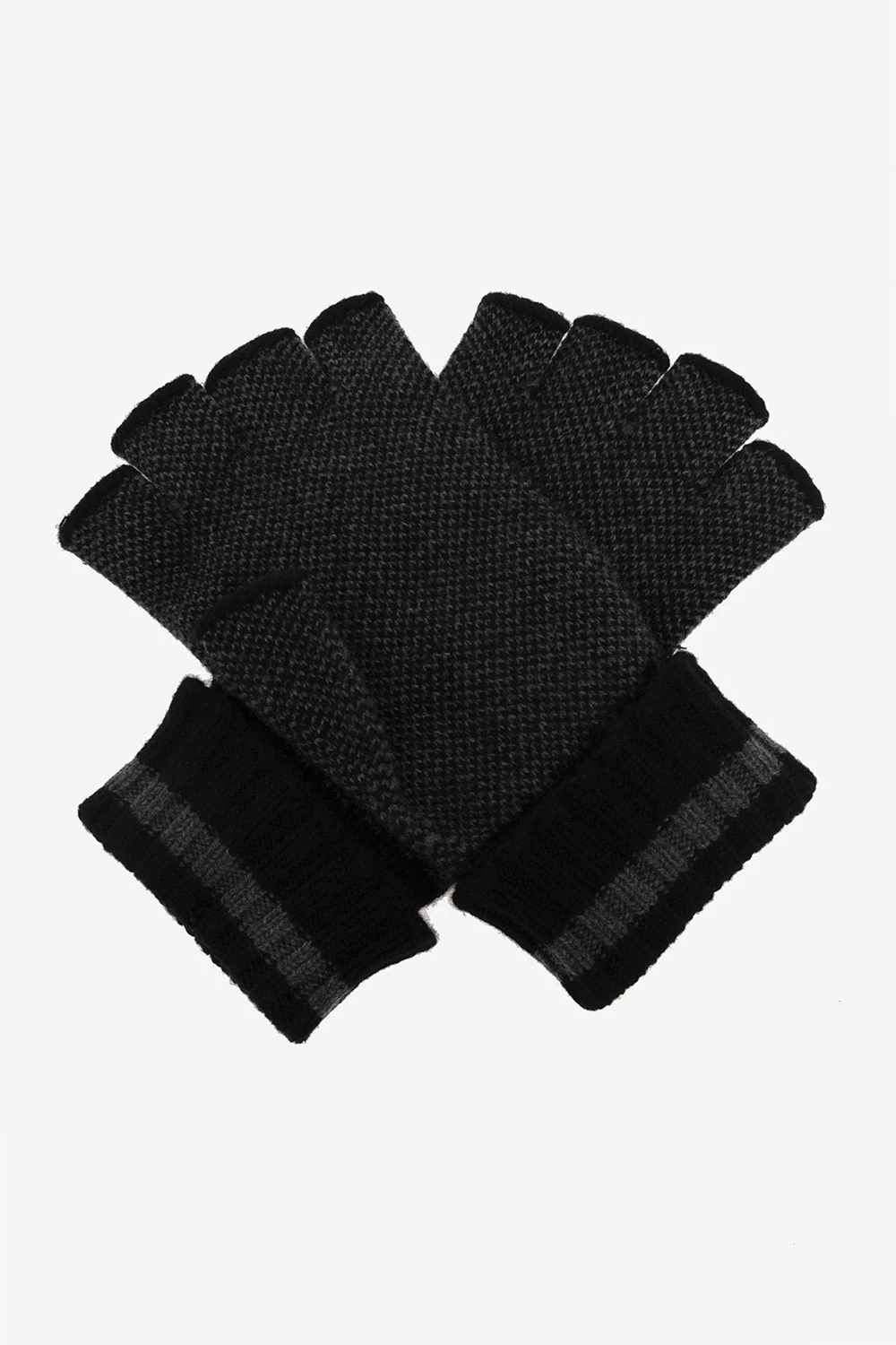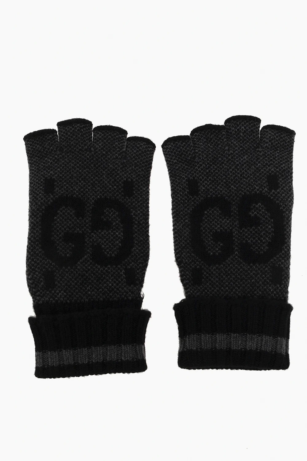 Czarno-szare, kaszmirowe rękawiczki bez palców Gucci. Ozdobione logo.