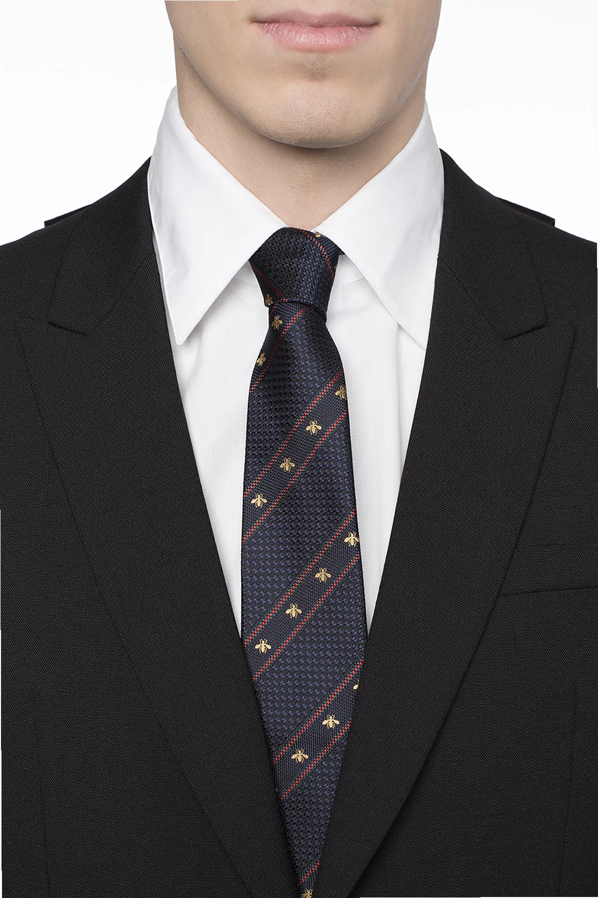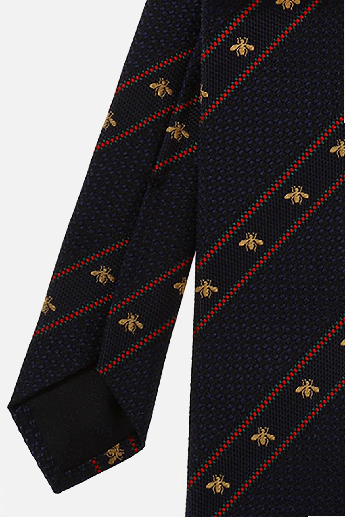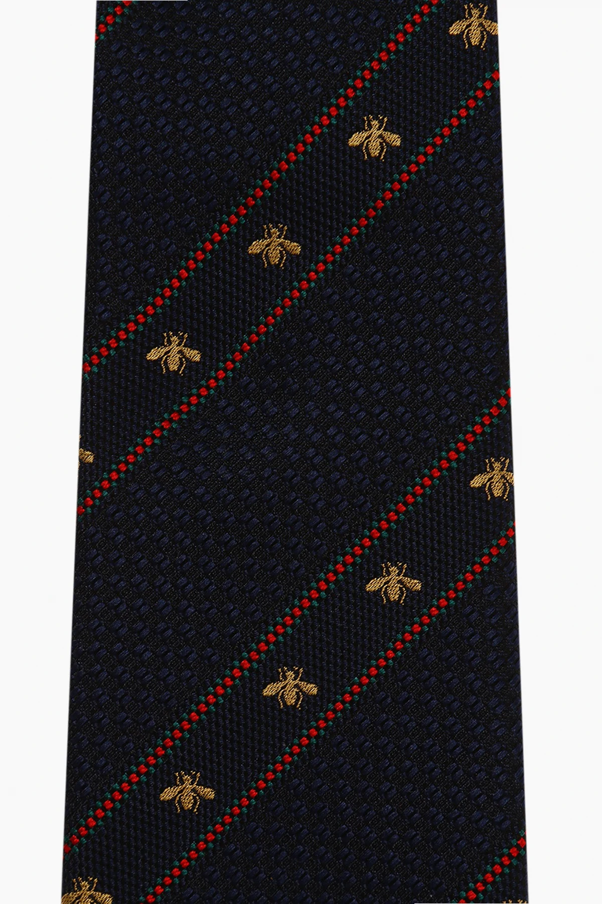 Granatowy, jedwabny, wzorzysty krawat Gucci w bordowe prążki. Ozdobiony charakterystycznym dla marki motywem pszczoły w kolorze złotym.