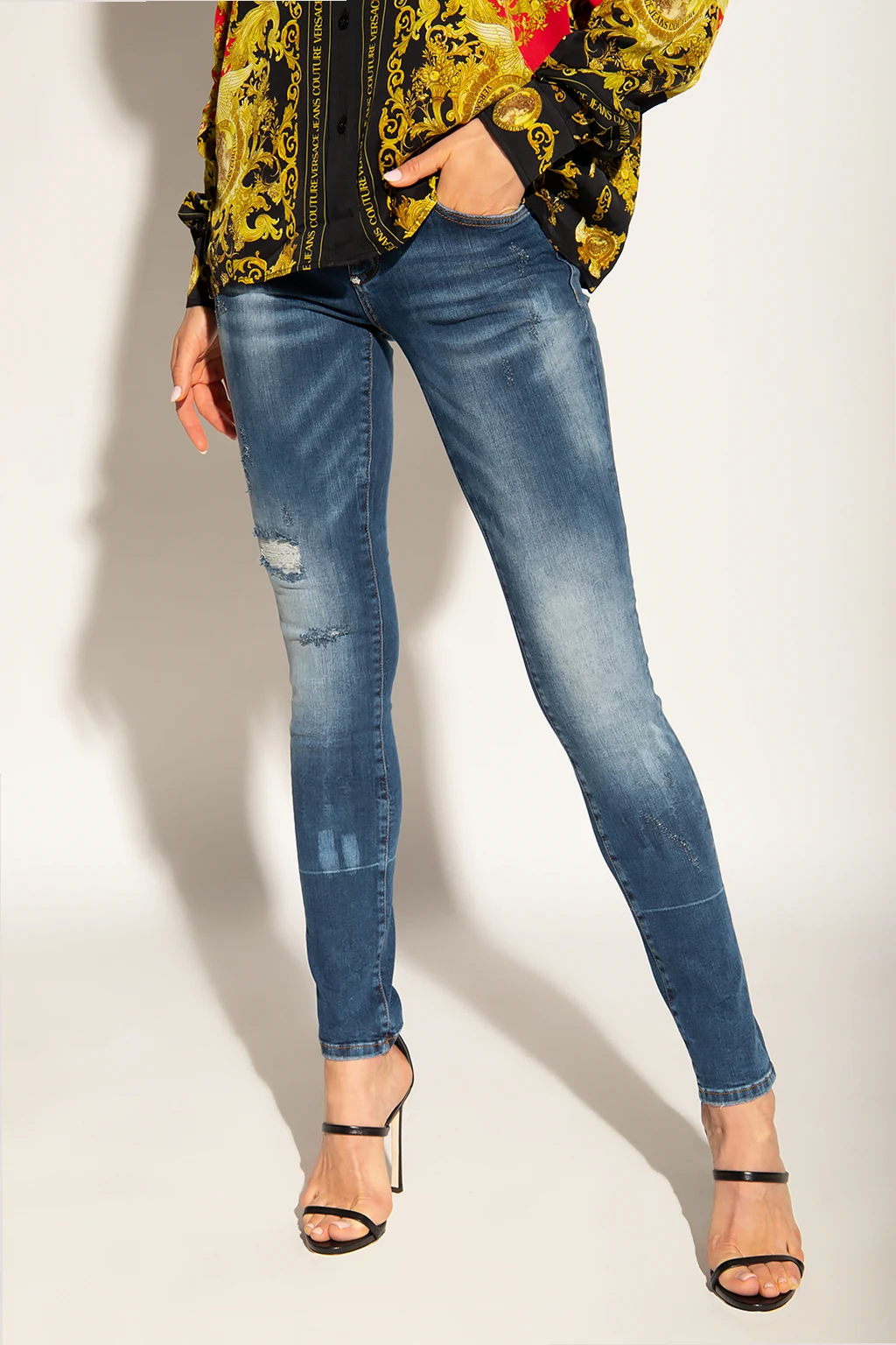 Ciemnoniebieskie jeansy Philipp Plein. Zapinane na zamek oraz guzik. Naszywka z logo. Metalowa zawieszka w formie agrafki w kolorze srebrnym. Dekoracyjne przetarcia. Pięć wsuwanych kieszeni: trzy z przodu oraz dwie z tyłu. Zwężane nogawki.