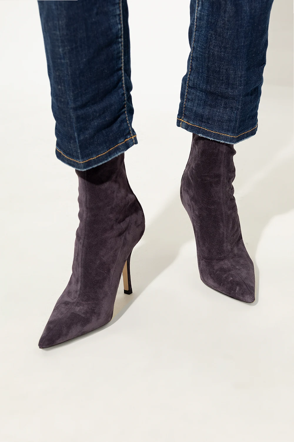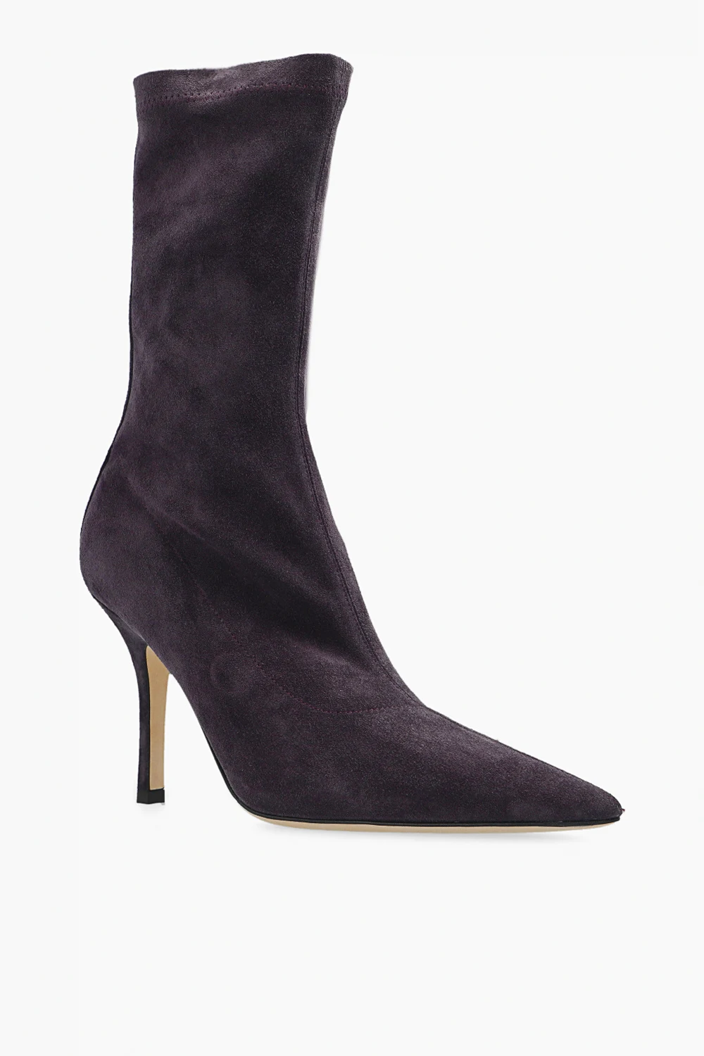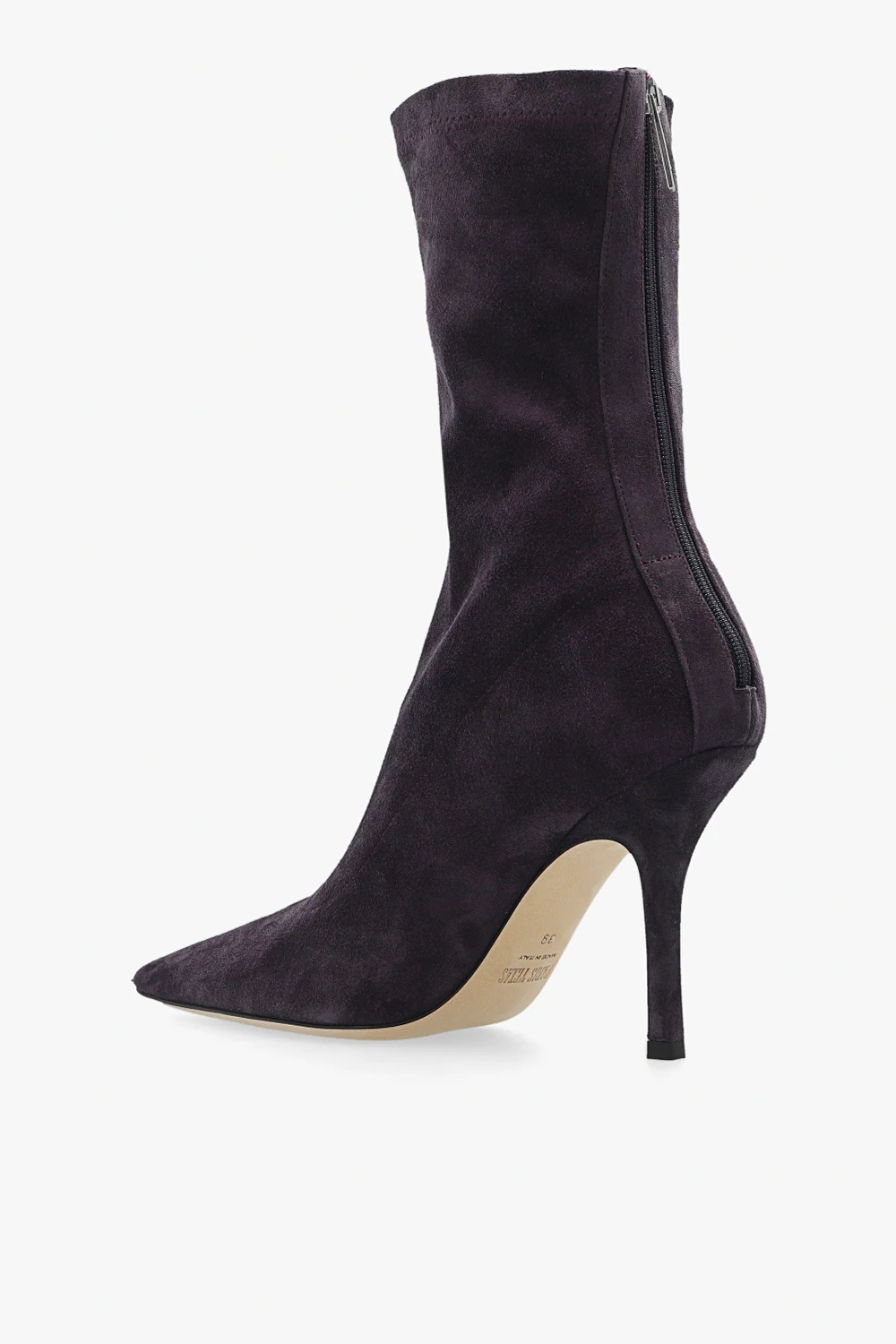 Ciemnofioletowe botki na obcasie Paris Texas. Wykonane z zamszu cielęcego. Z tyłu zapinane na zamek. Nosek w szpic. Jasnobeżowa, skórzana podeszwa.