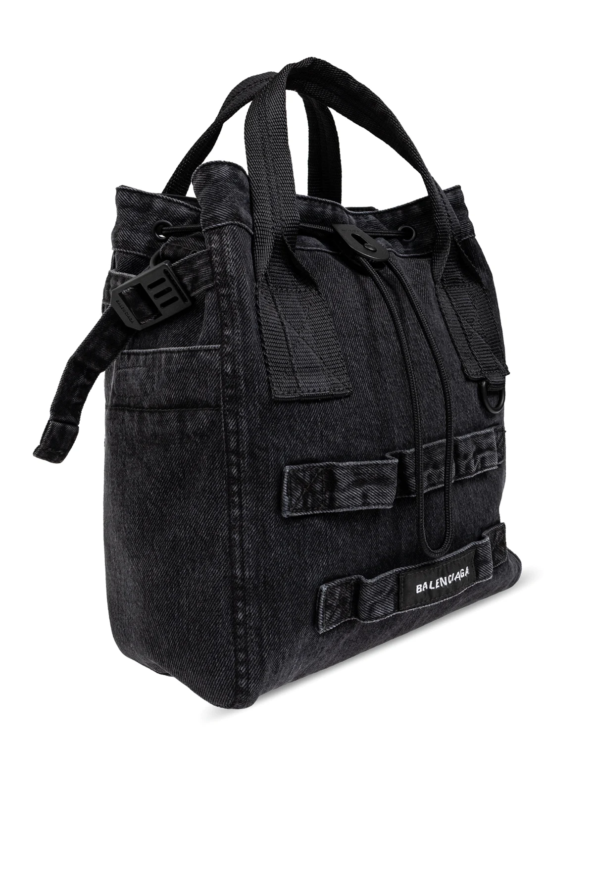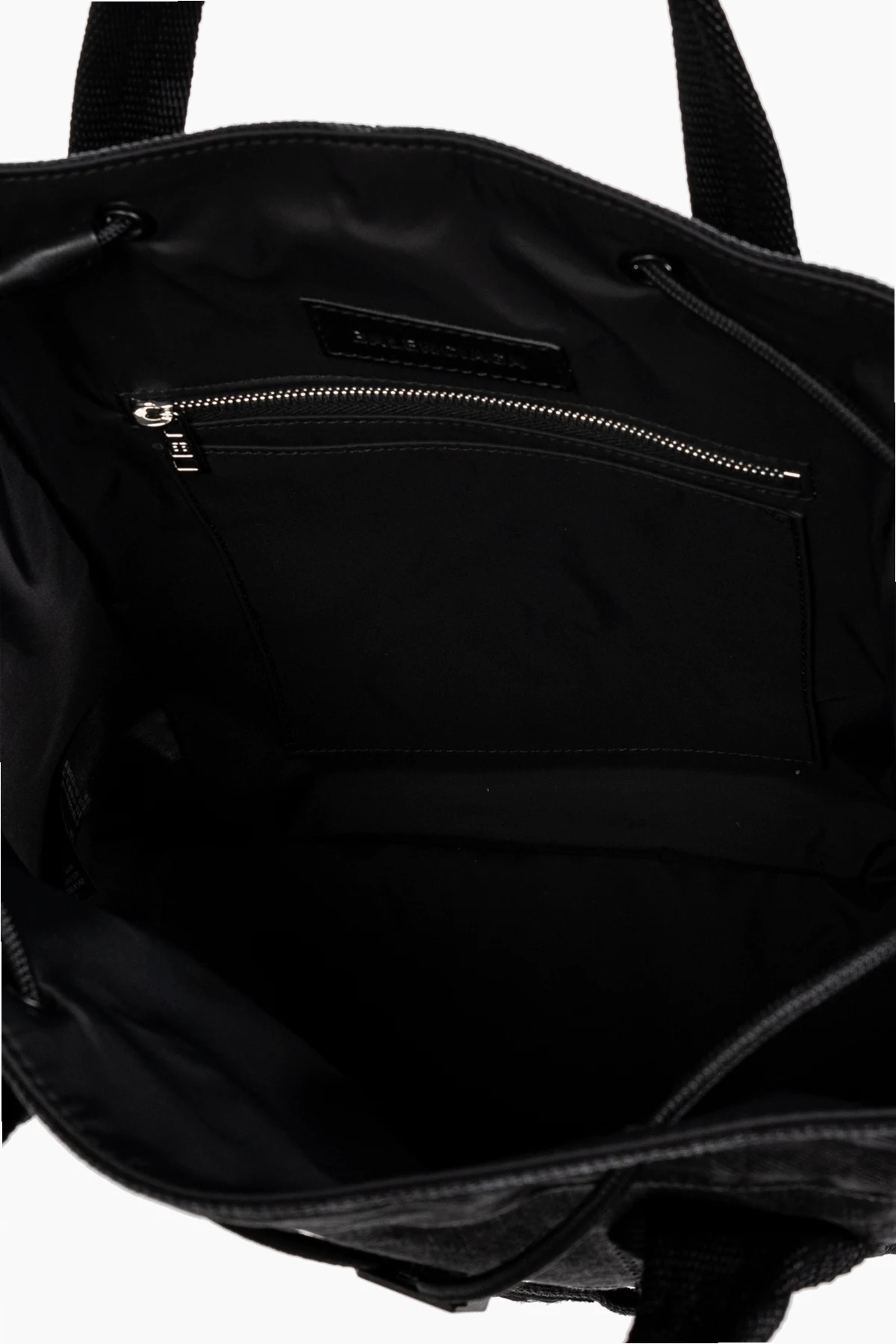 Wnętrze torby wyłożone ciemnym materiałem skrywa przestronną komorę oraz praktyczną kieszeń zamykaną na zamek błyskawiczny. Na przedniej stronie torby umieszczono dyskretne logo "BALENCIAGA" na subtelnej metce, a dodatkowe paski mogą służyć jako uchwyty do mocowania innych przedmiotów.