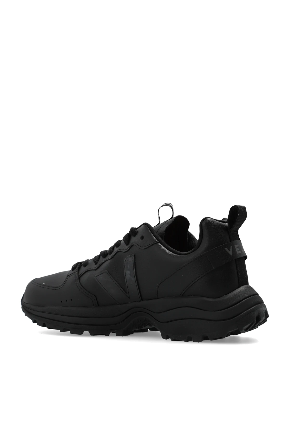 Czarne, sznurowane buty sportowe, model ‘Venturi VC CWL’ Veja. Wykonane z organicznej bawełny pokrytej żywicą poliuretanową z oleju kukurydzianego i rycynowego o fakturze imitującej skórę – C.W.L. (Cotton Worked as Leather). Ozdobione nadrukowanym logo. Charakterystyczna dla marki naszywka. Odblaskowe detale. Wkładka wykonana z trzciny cukrowej, gumy amazońskiej, bawełny organicznej i pochodzącej z recyklingu pianki EVA. Czarna, gumowa podeszwa.