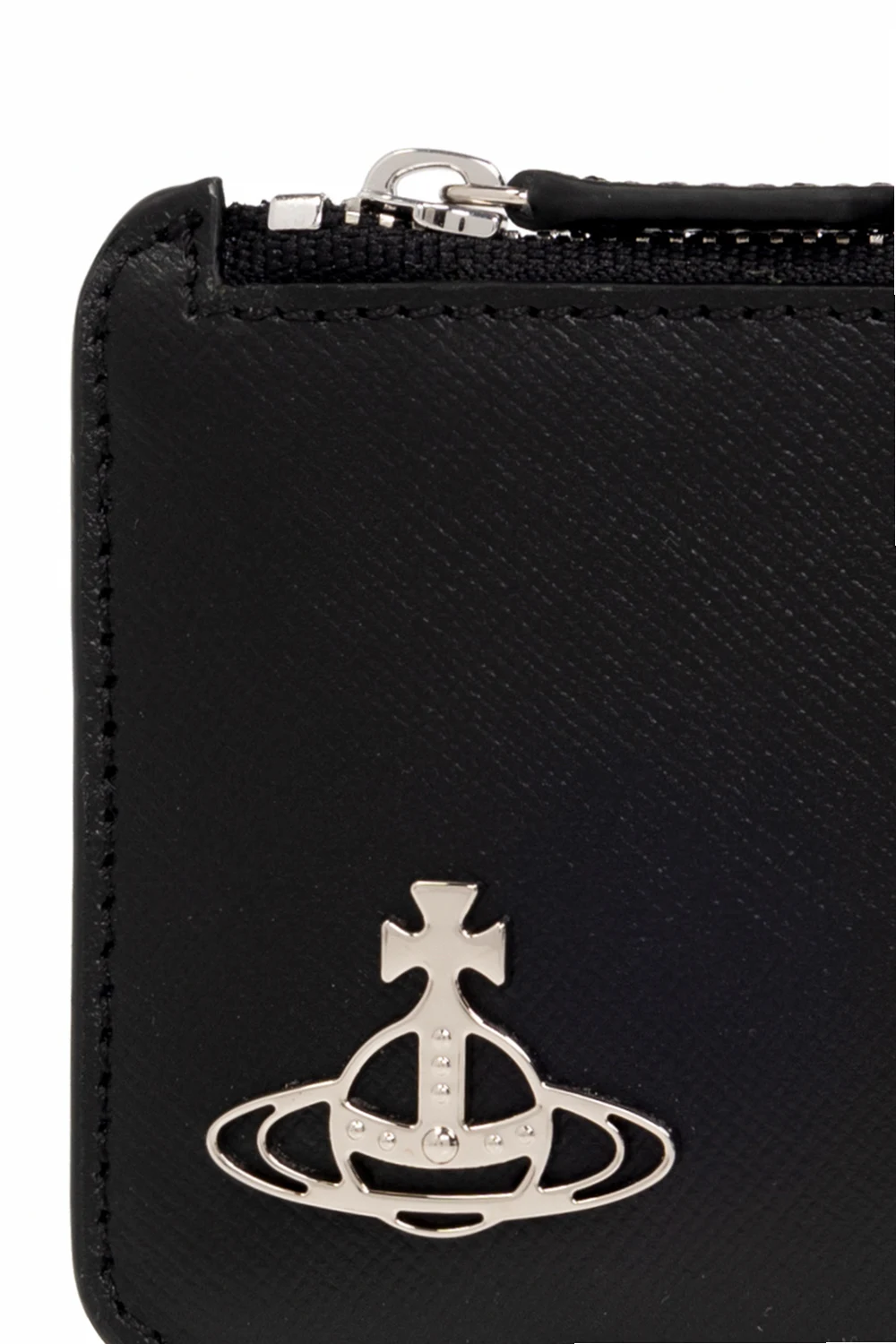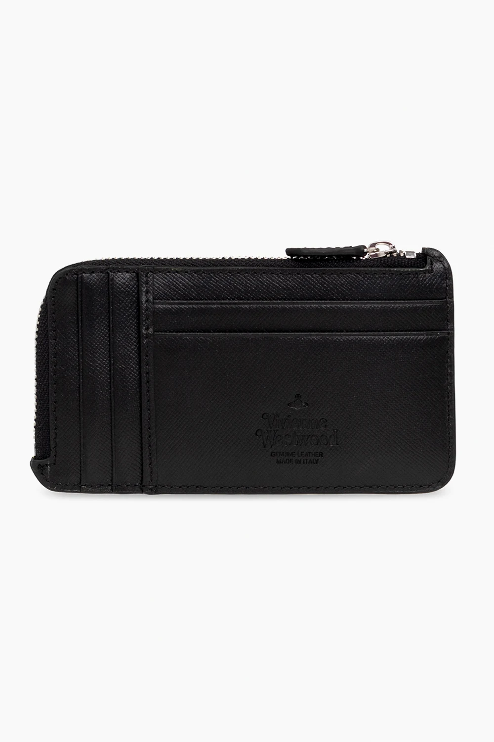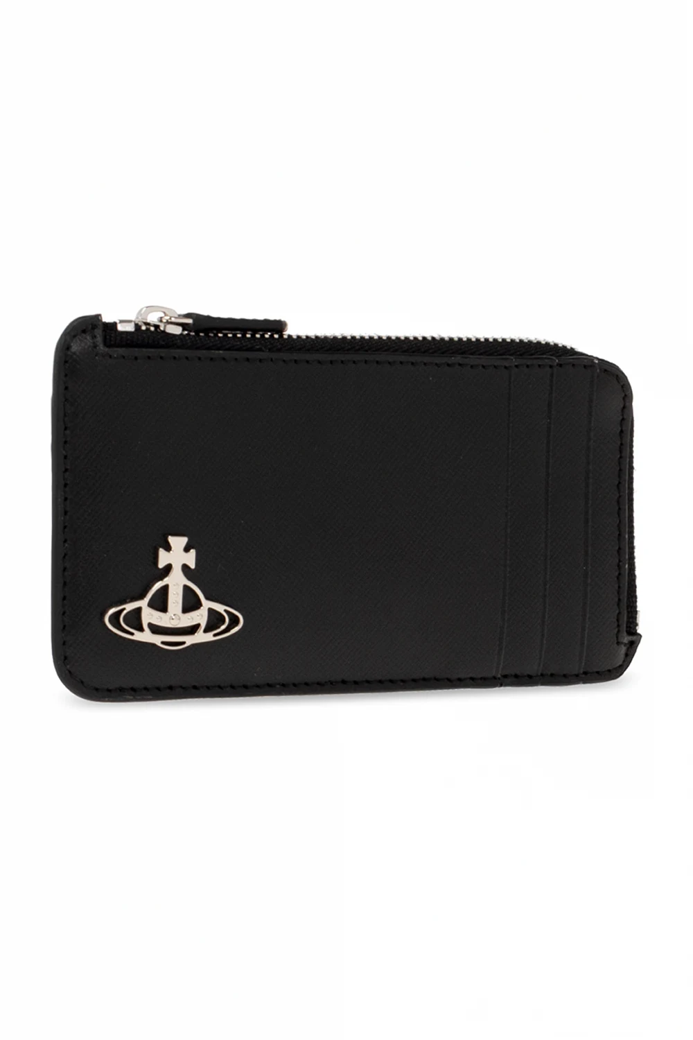 Czarne etui na karty, model ‘Debbie’ Vivienne Westwood. Wykonane z cielęcej skóry. Z przodu aplikacja w kształcie logo i trzy miejsca na karty. Kieszeń zamykana na zamek. Z tyłu pięć miejsc na karty. Metalowe elementy w kolorze srebrnym.