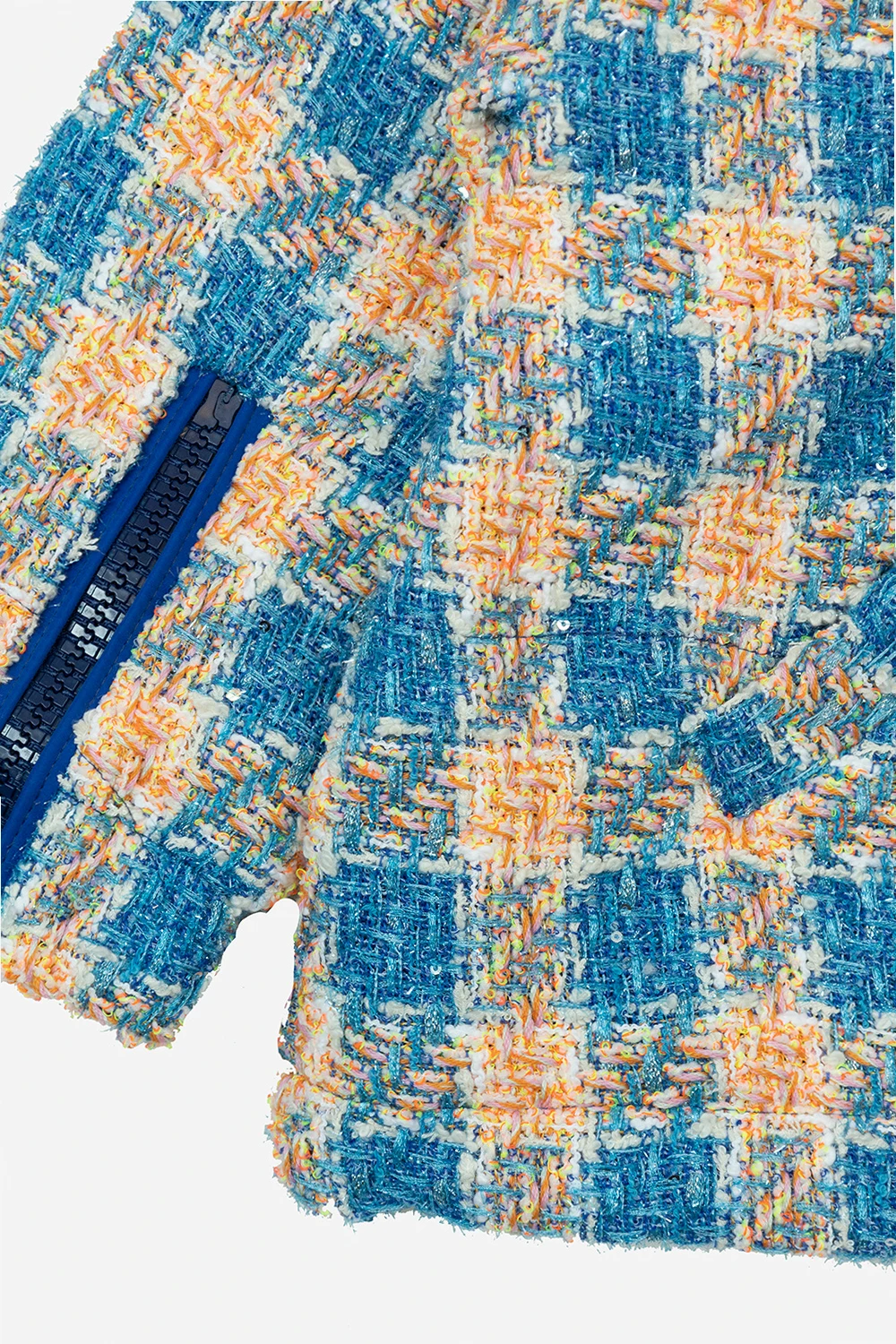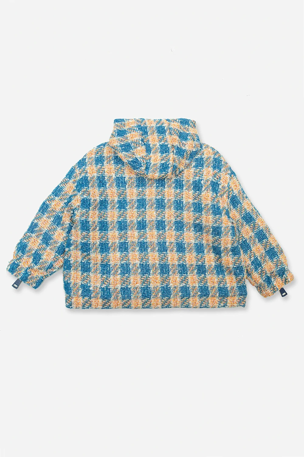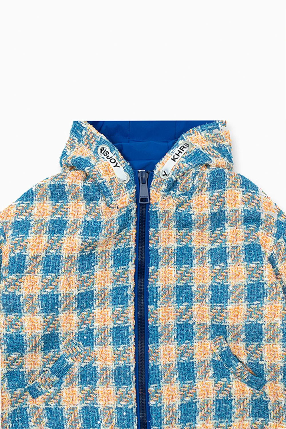 Kolorowa, tweedowa kurtka Khrisjoy Kids. Przód i rękawy z zapięciem na zamek. Kaptur i dół ściągane trokami. Dwie wsuwane kieszenie.