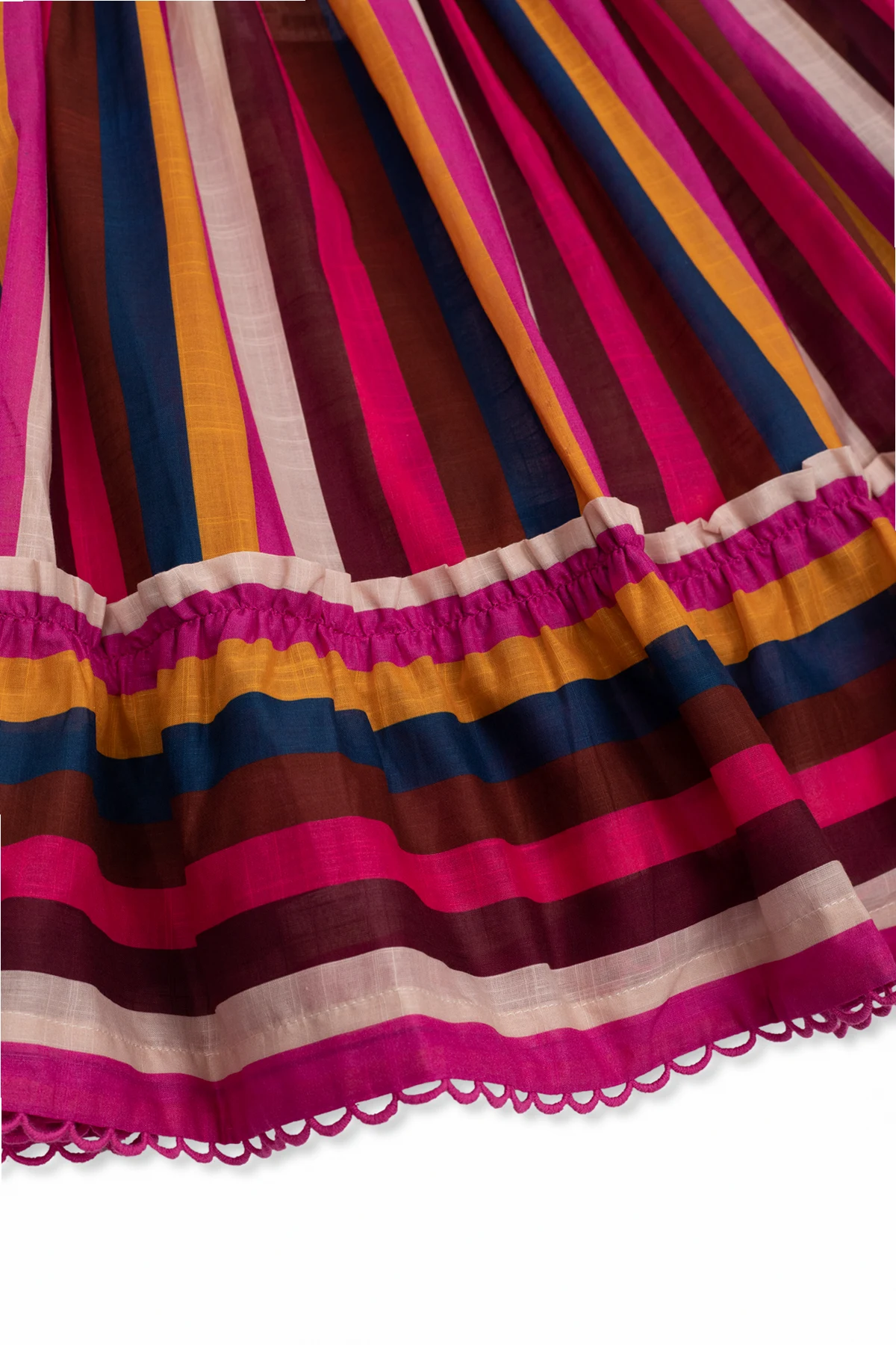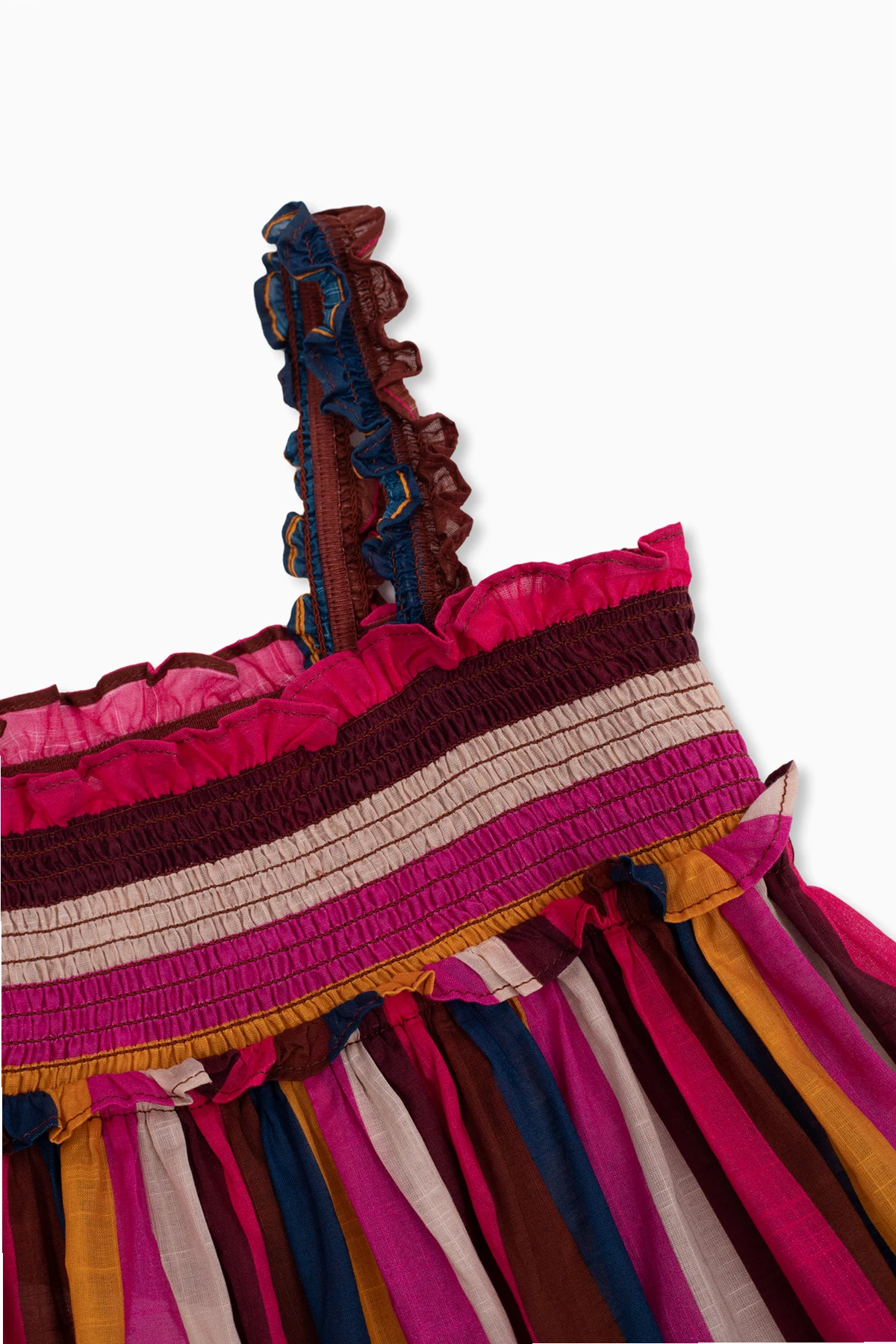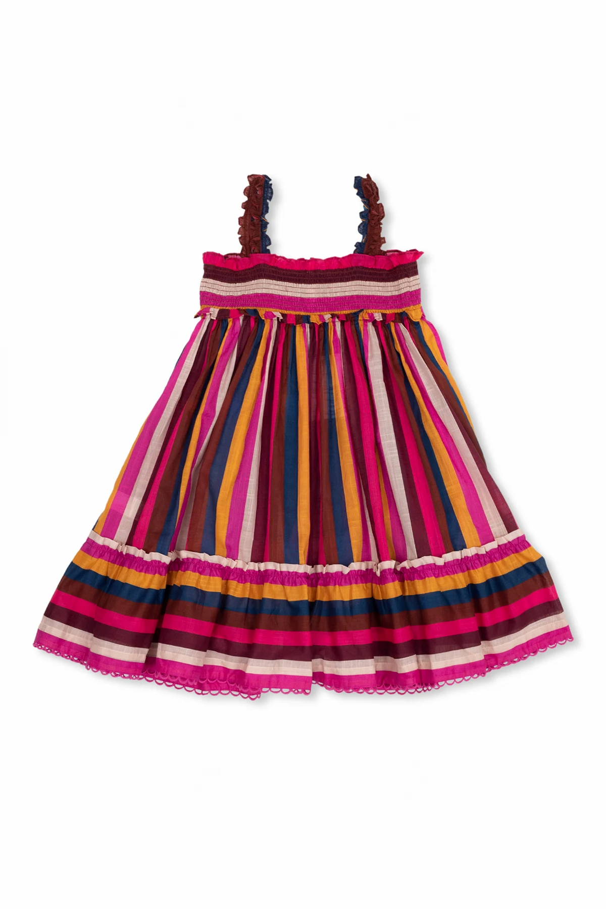 Kolorowa, bawełniana sukienka na ramiączkach Zimmermann Kids. Luźny krój. Ozdobiona wzorem w pasy. Dół zakończony falbaną z dekoracyjnym wykończeniem.
