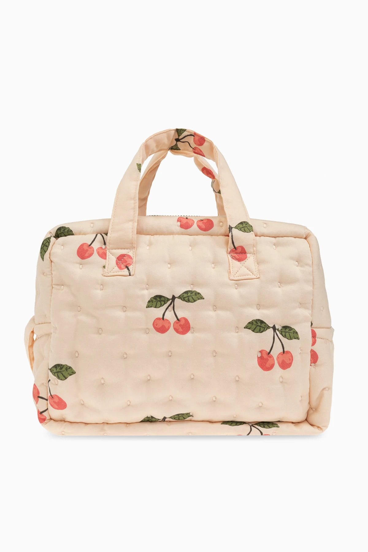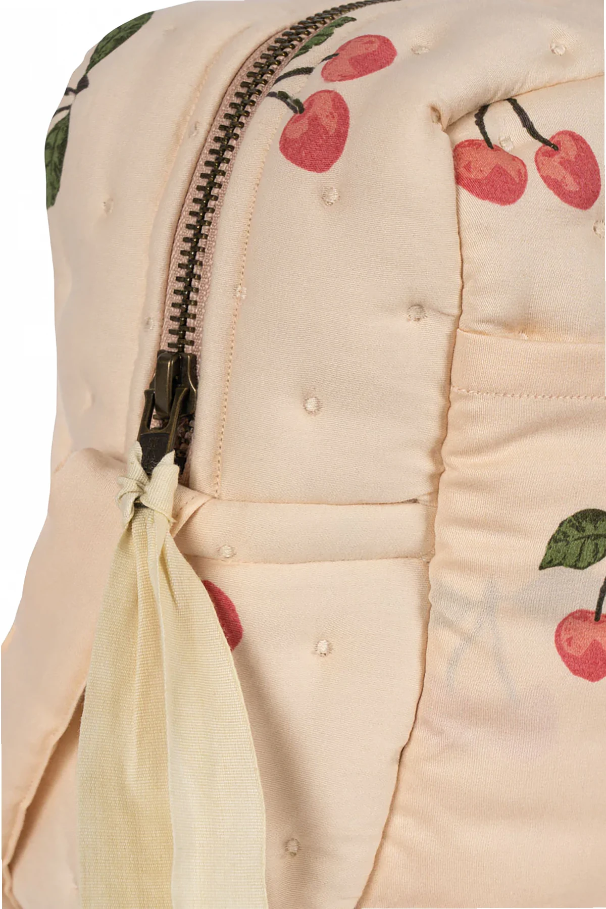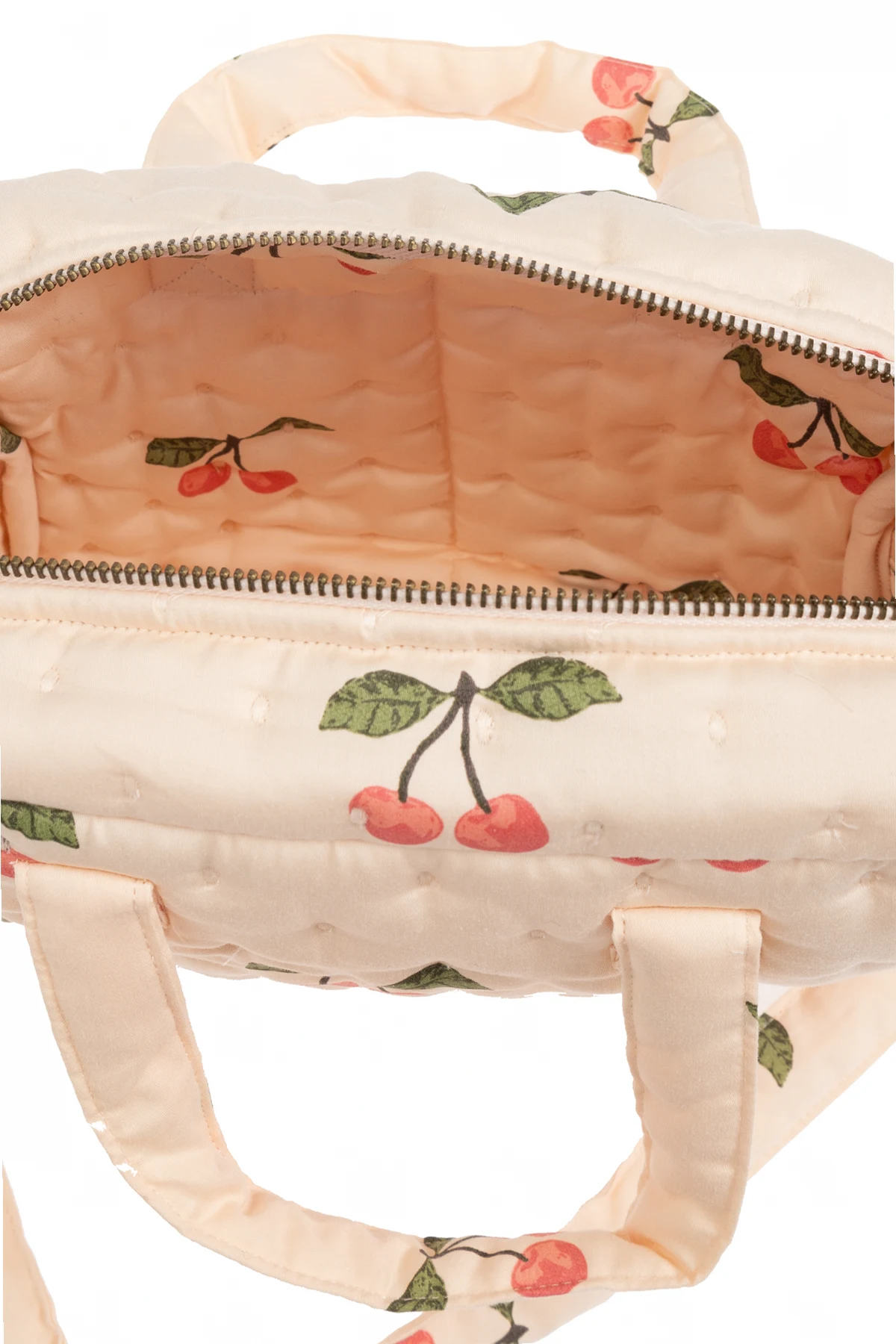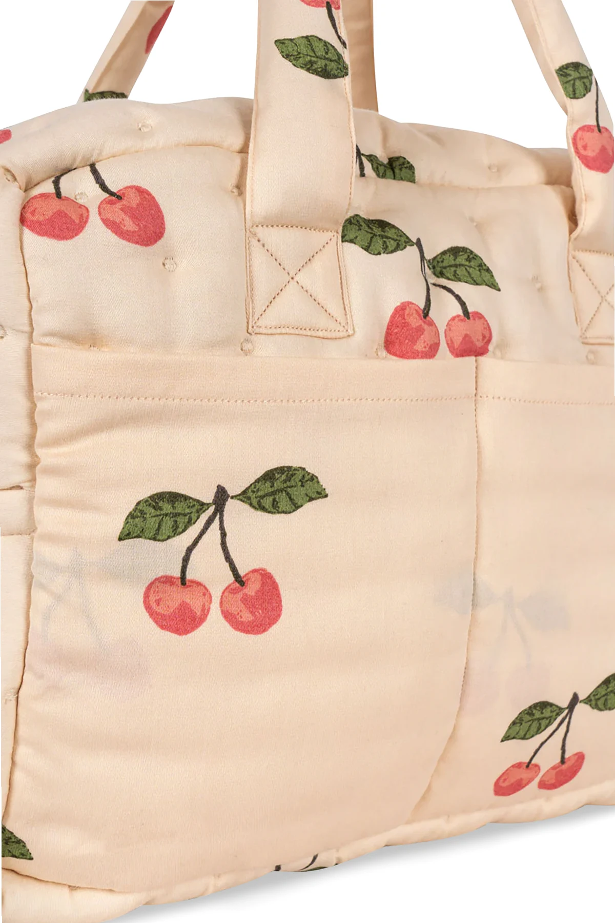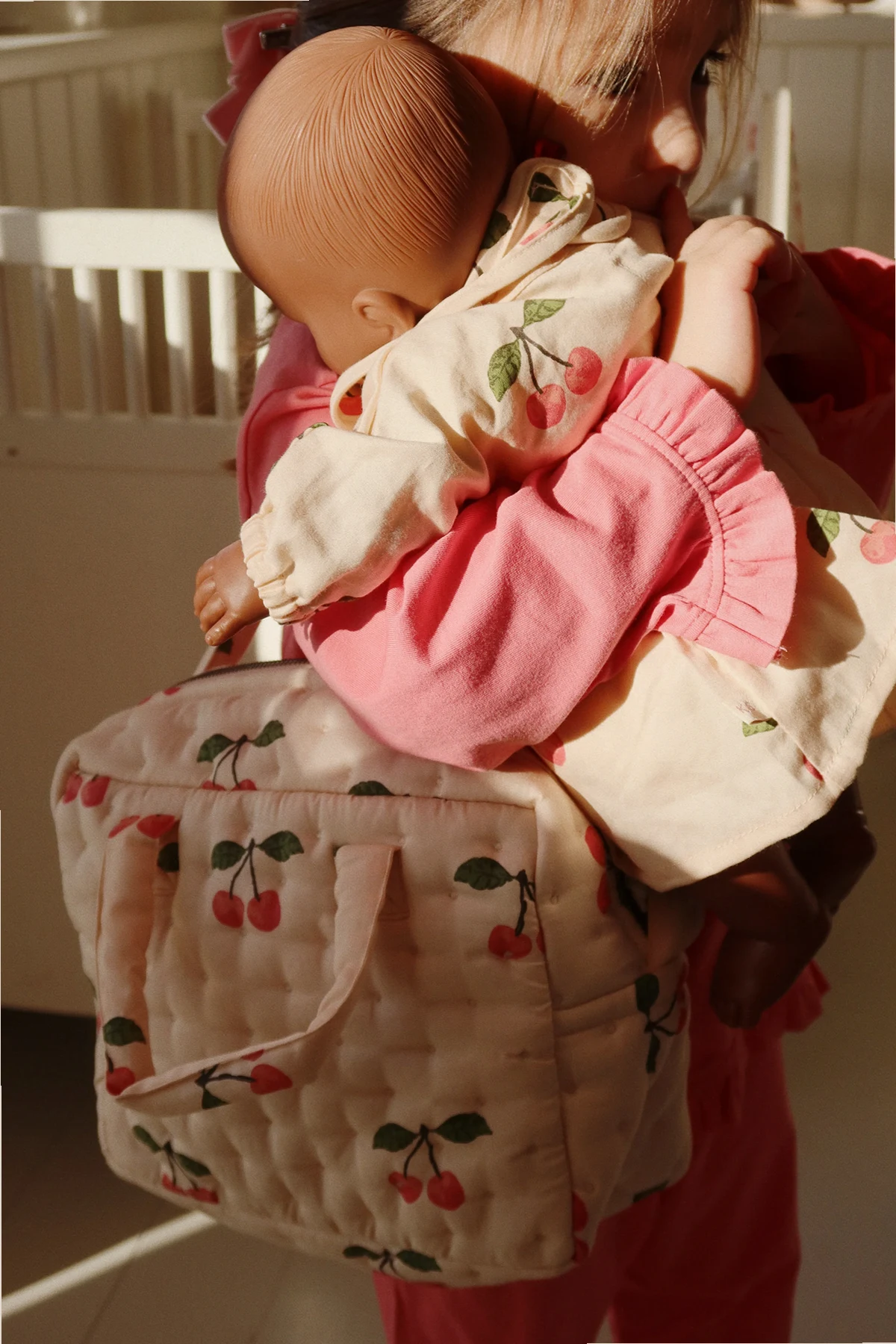 Przedstawiamy torbę do przewijania dla lalek z ekskluzywnej kolekcji duńskiej marki Konges Sløjd . Ta elegancka torba, zachwyca beżowym kolorem z uroczym wzorem czerwonych wiśni i zielonych liści. Wykonana ze 100% bawełny z wypełnieniem z poliestru z recyklingu, łączy niebanalny design z troską o środowisko.