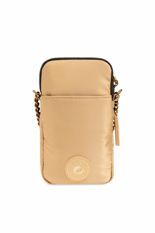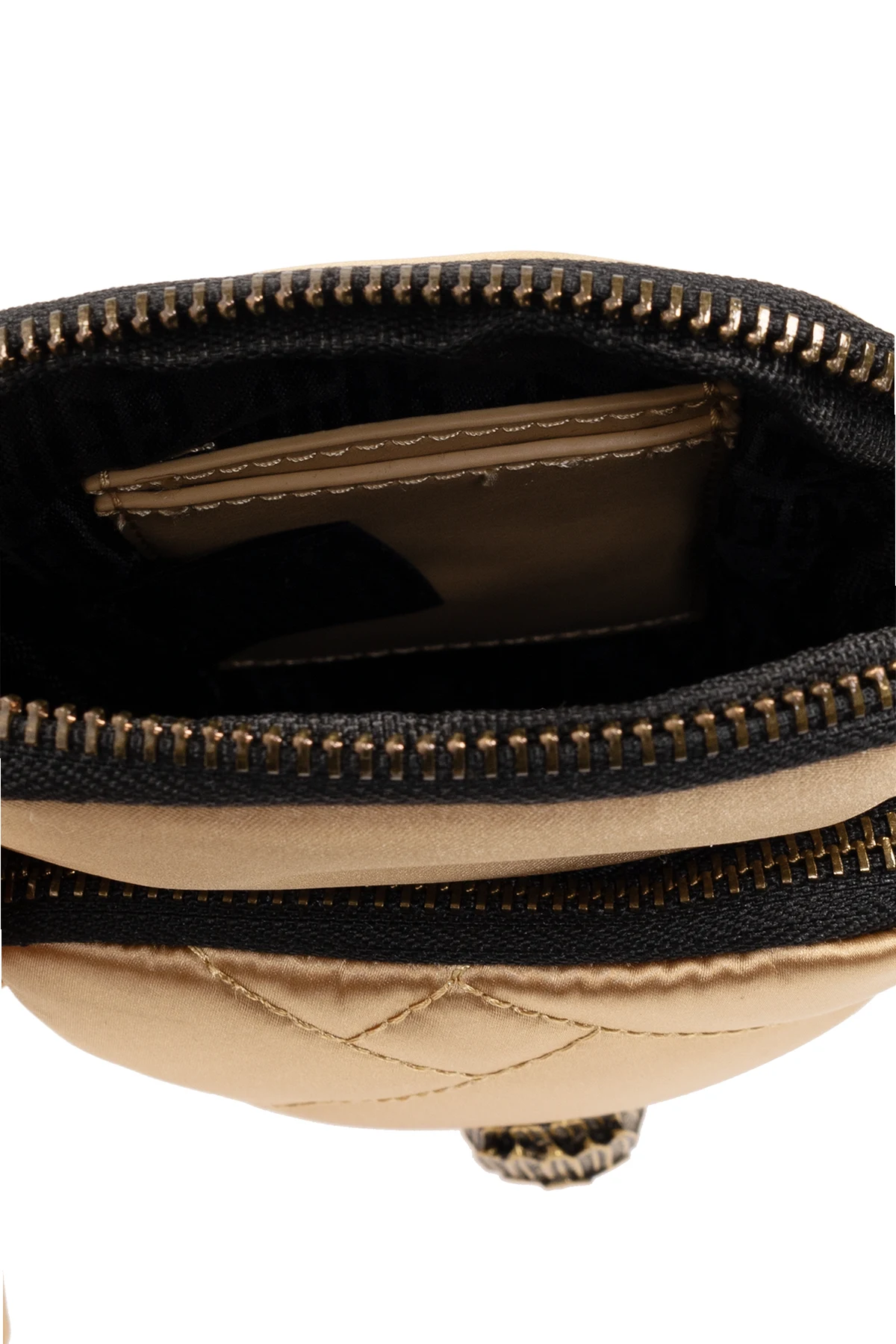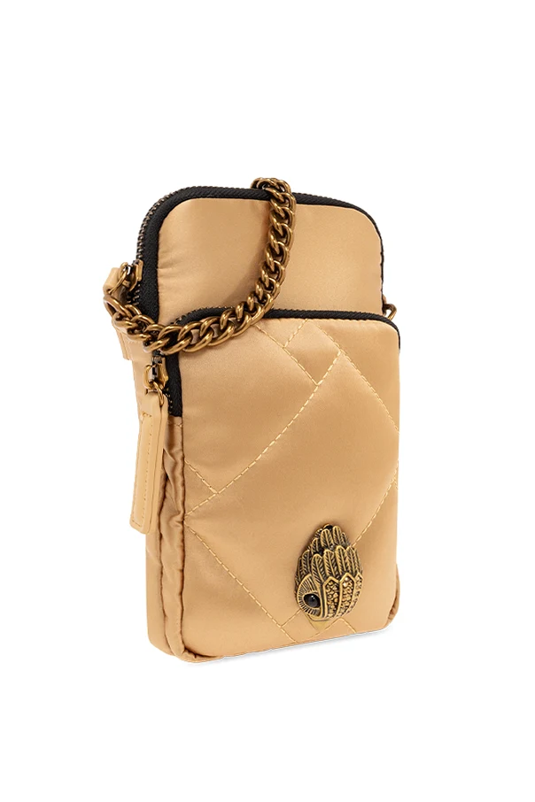 Beżowa, częściowo pikowana torba na ramię Kurt Geiger. Wykonana z materiału z recyklingu. Zamykana na zamek. Z przodu metalowa aplikacja w kształcie charakterystycznej głowy orła wykończonej kryształami oraz kieszeń zamykana na zamek. Z tyłu wsuwana kieszeń i naszywka z logo. Półokrągła rączka w formie łańcucha. Odpinany, regulowany pasek na ramię. Dołączona saszetka zamykana na zamek. Wewnątrz komora i dwa miejsca na kartę. Metalowe elementy w kolorze postarzanego złota.