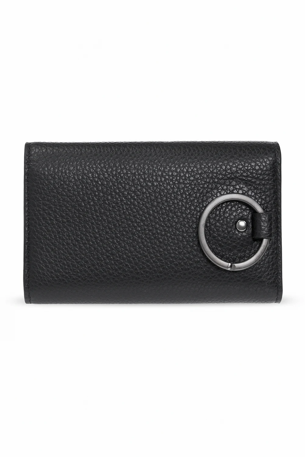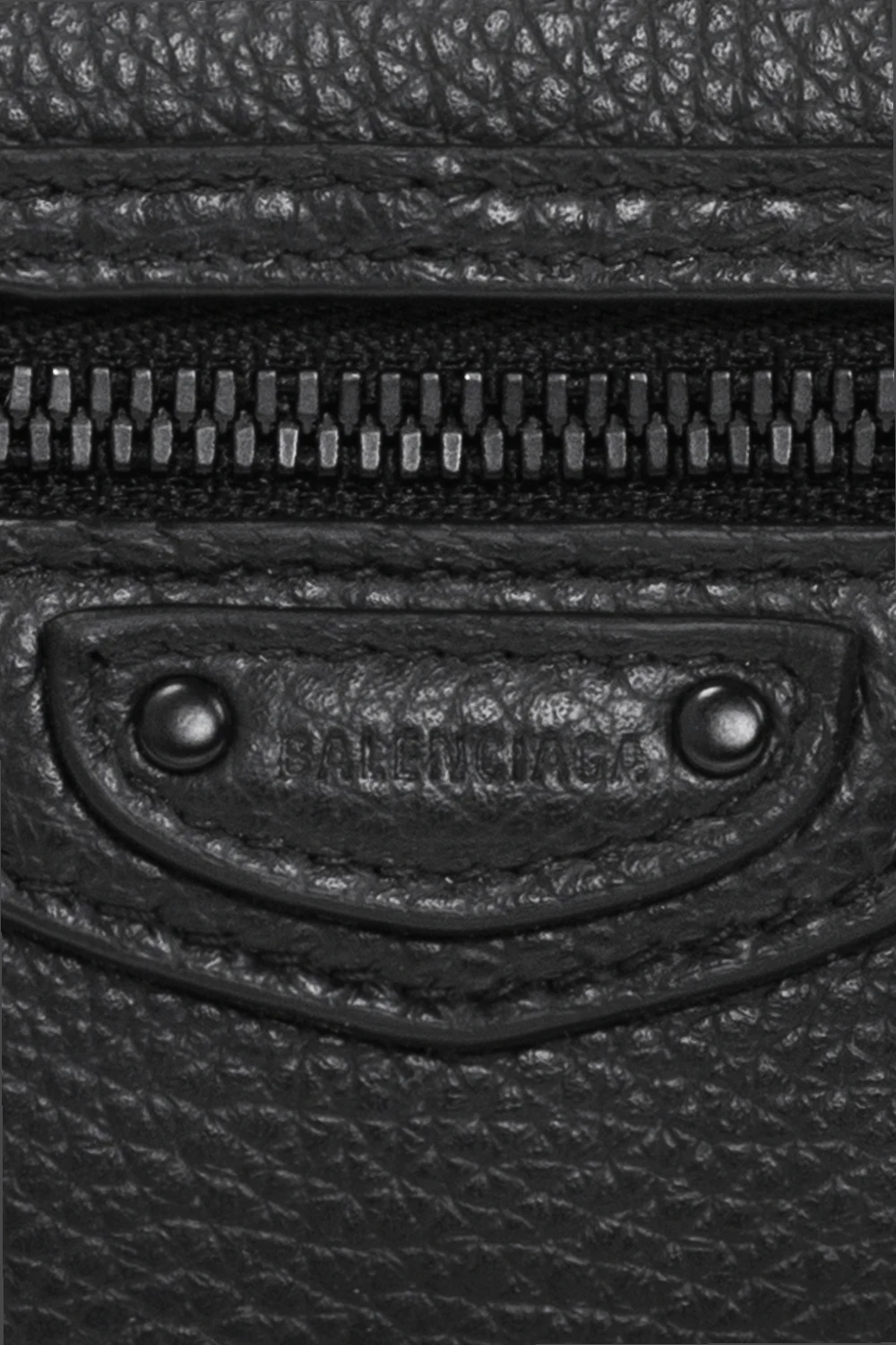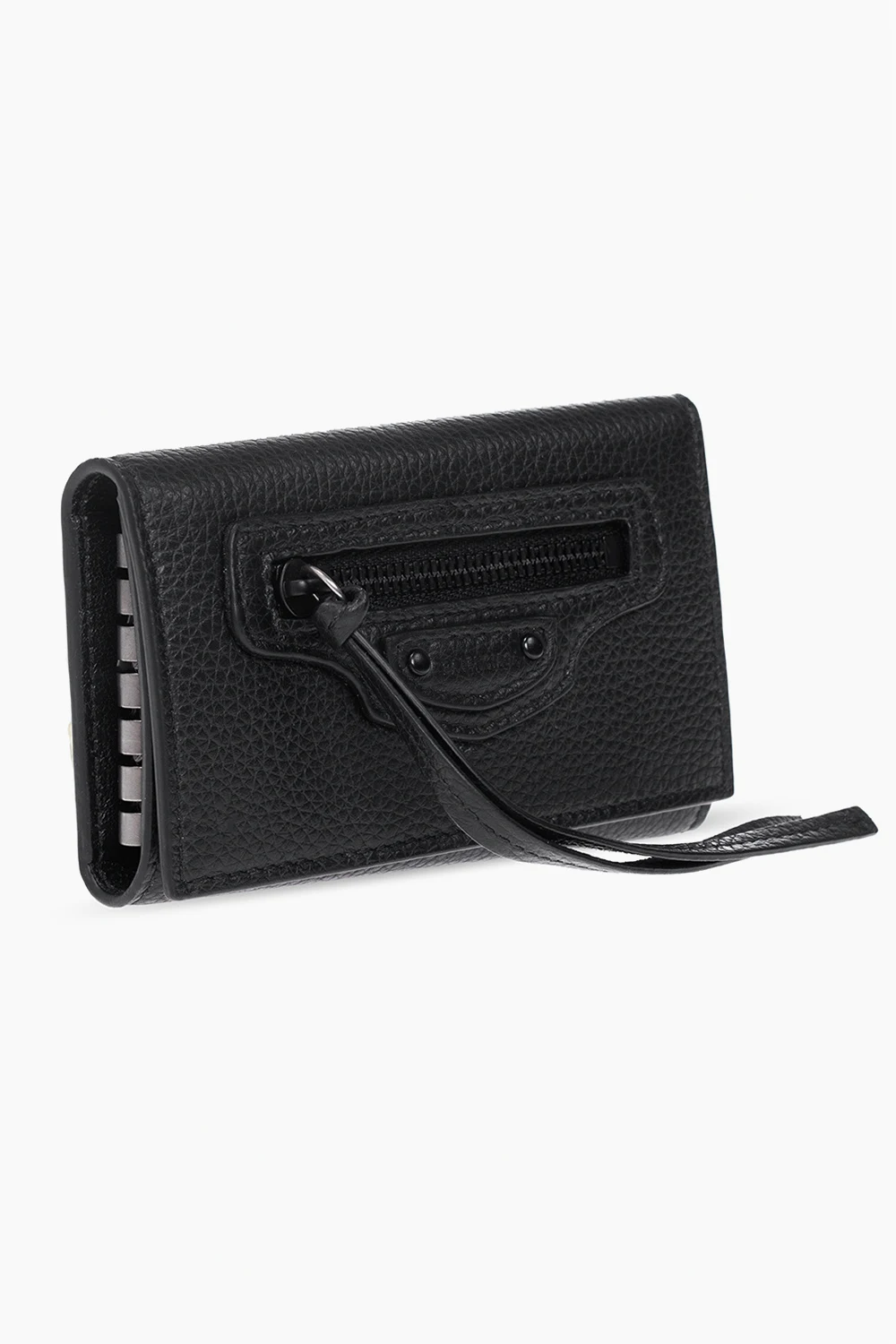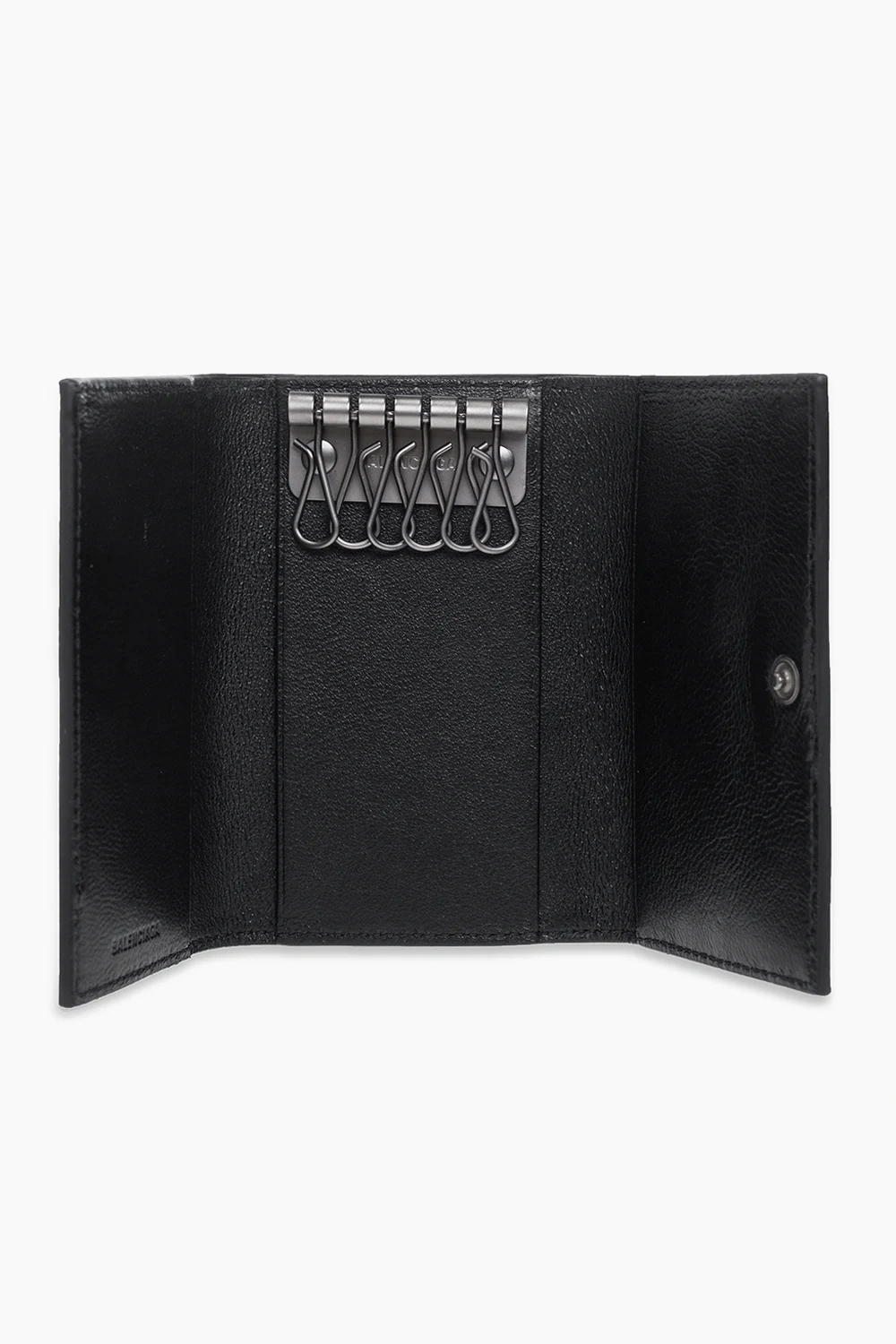 Czarne etui na klucze Balenciaga. Wykonane z cielęcej skóry. Zamykane na zatrzask. Z przodu kieszeń zamykana na zamek i naszywka z wytłoczonym logo. Z tyłu brelok. Wewnątrz trzy wsuwane kieszenie i sześć karabińczyków. Metalowe wykończenie w kolorze czarnym.