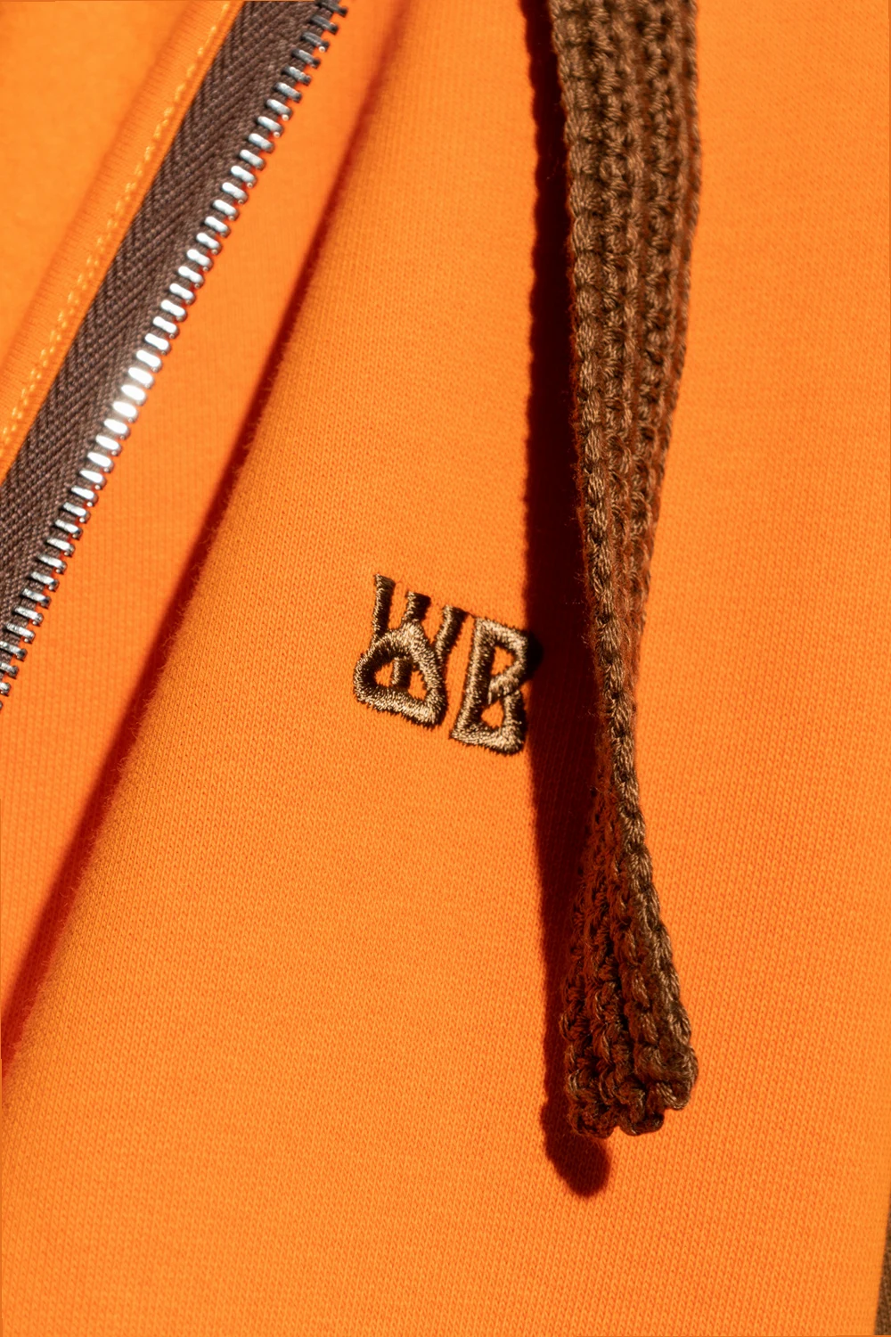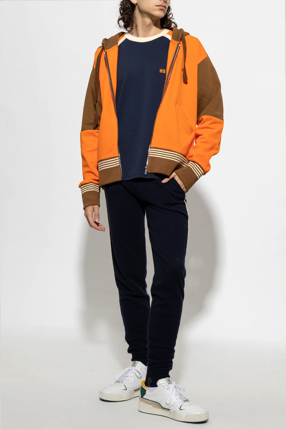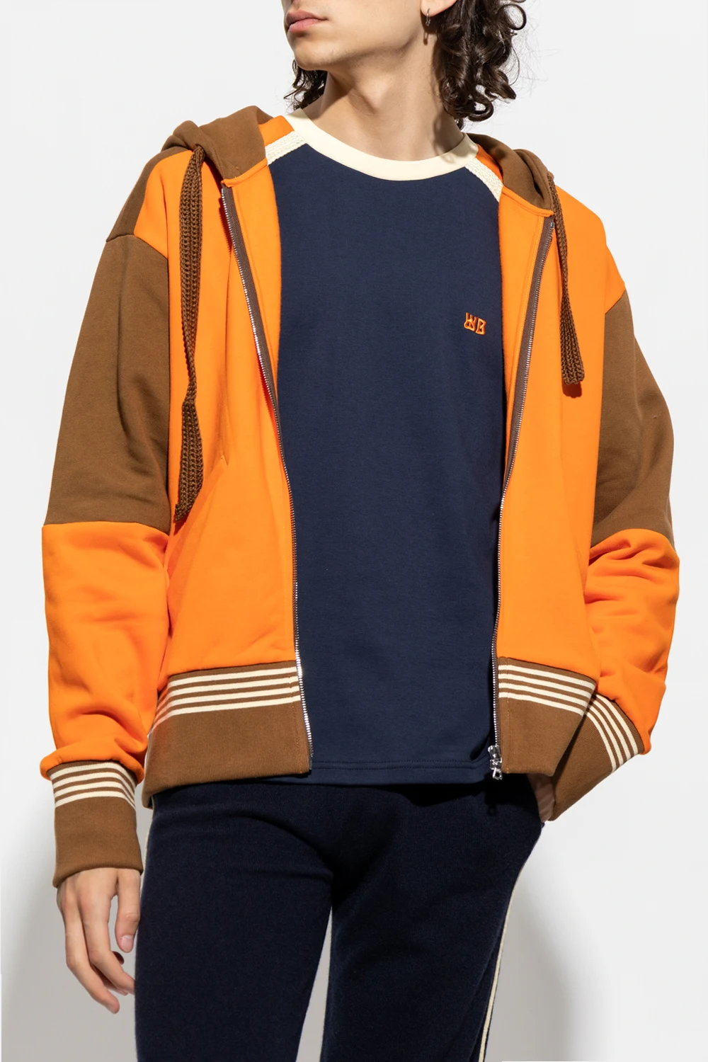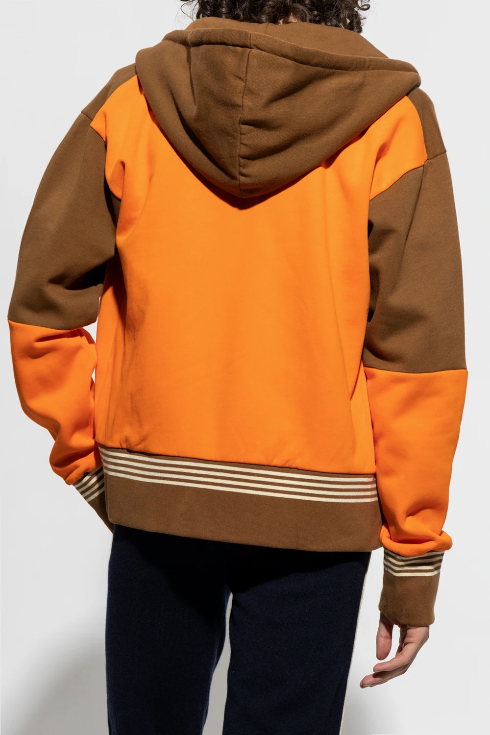 Pomarańczowo-brązowa bluza, model ‘Sunday’ Wales Bonner. Wykonana z bawełny organicznej. Kaptur ściągany trokami. Z przodu wyszyte logo. Dwie wsuwane kieszenie. Długie rękawy i dół zakończone ściągaczem ozdobiony kremowym wzorem w paski.