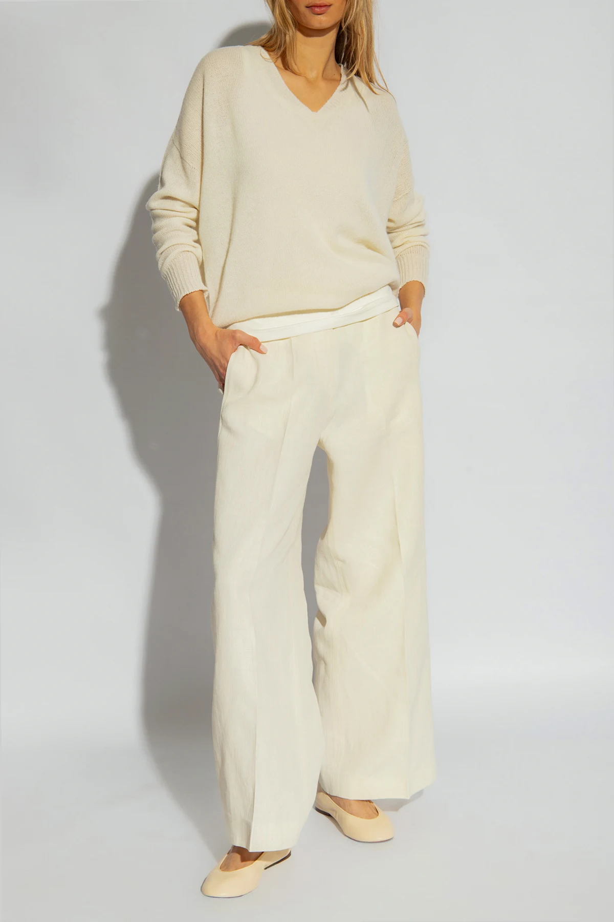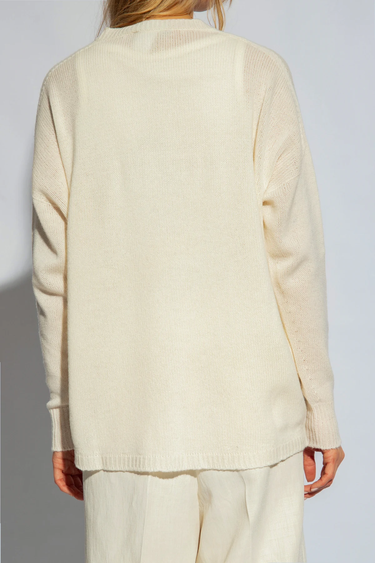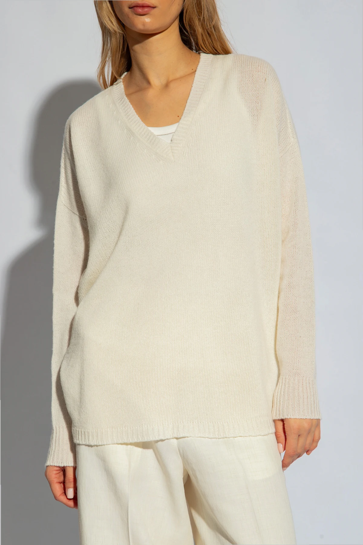 Biały sweter Fabiana Filippi. Wykonany z kaszmiru. Dekolt w serek, długie rękawy oraz dół wykończone ściągaczem.