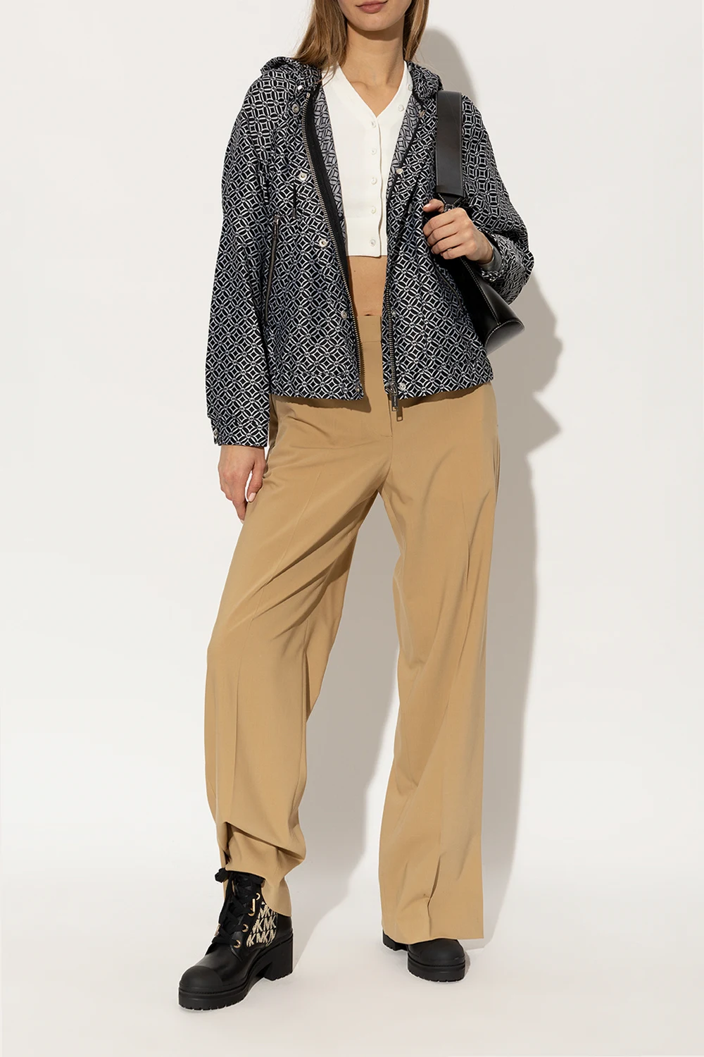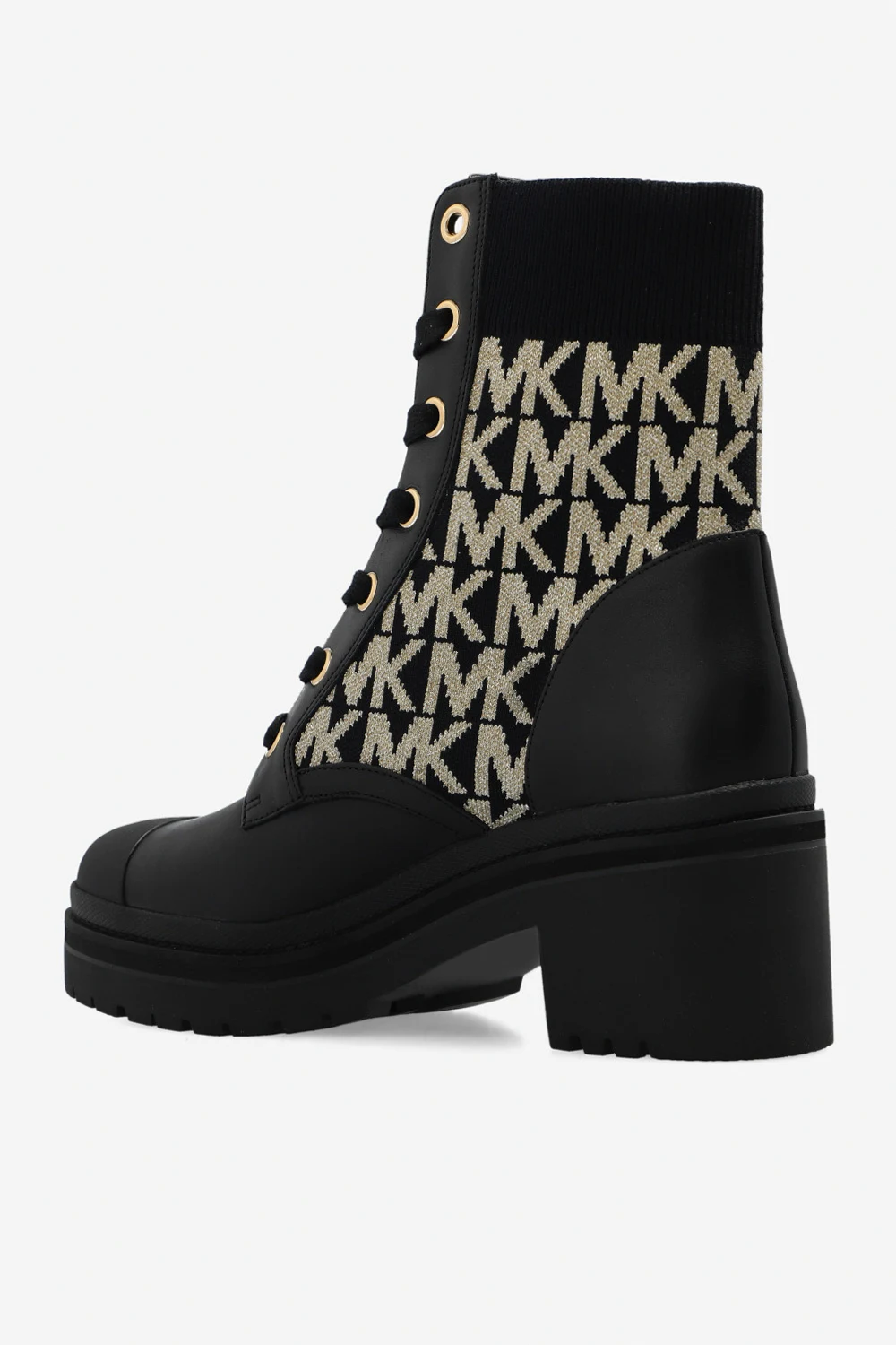 Czarne, sznurowane botki na obcasie, model ‘Brea’ Michael Michael Kors. Wykonane ze skóry i materiału. Ozdobione wzorem z monogramem w kolorze złotym, wykończonym lureksową nicią. Czarna, gumowa podeszwa.