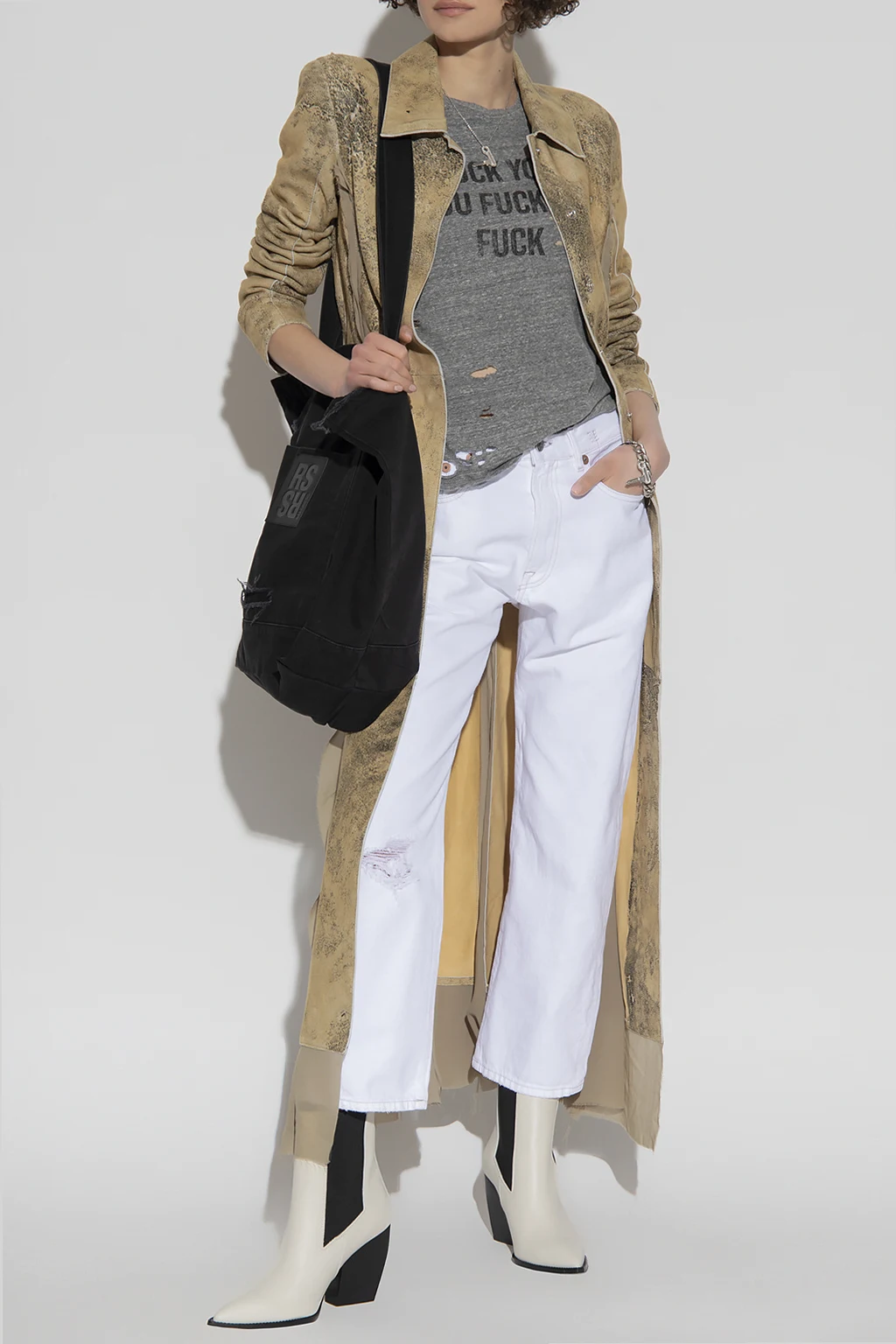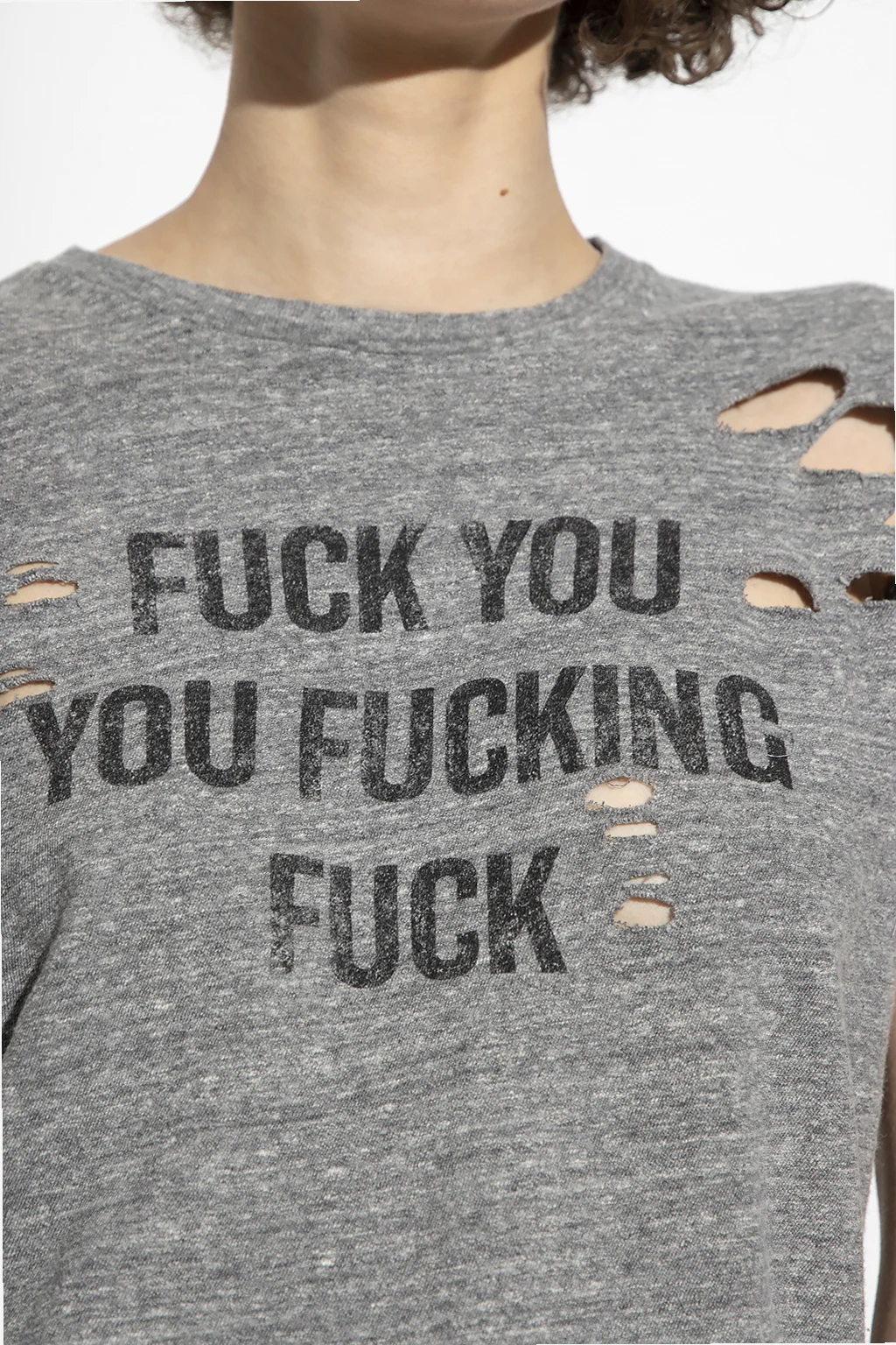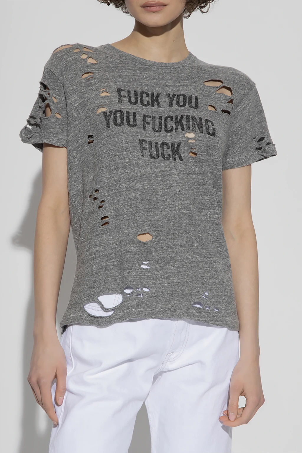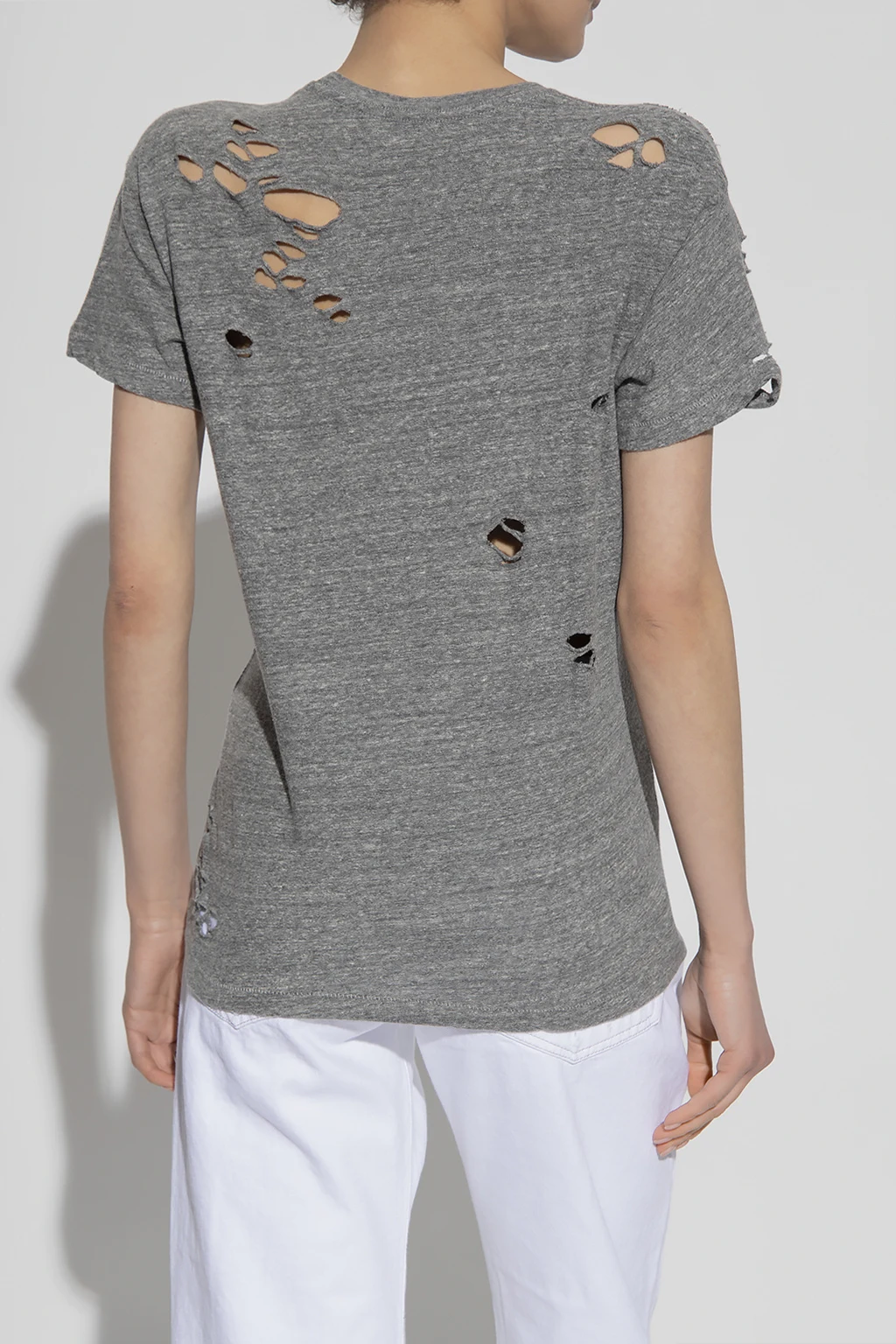 Szary t-shirt R13. Wykonany z bawełny. Ozdobiony wzorem z logo. Okrągły dekolt wykończony ściągaczem. Efekt ‘vintage’. Krótkie rękawy.