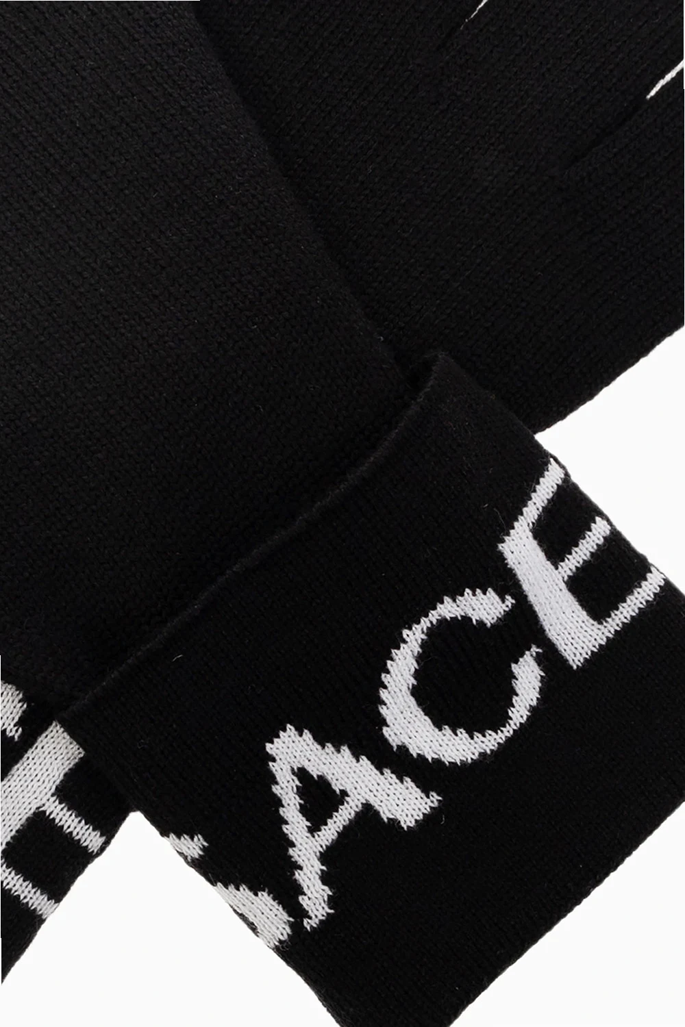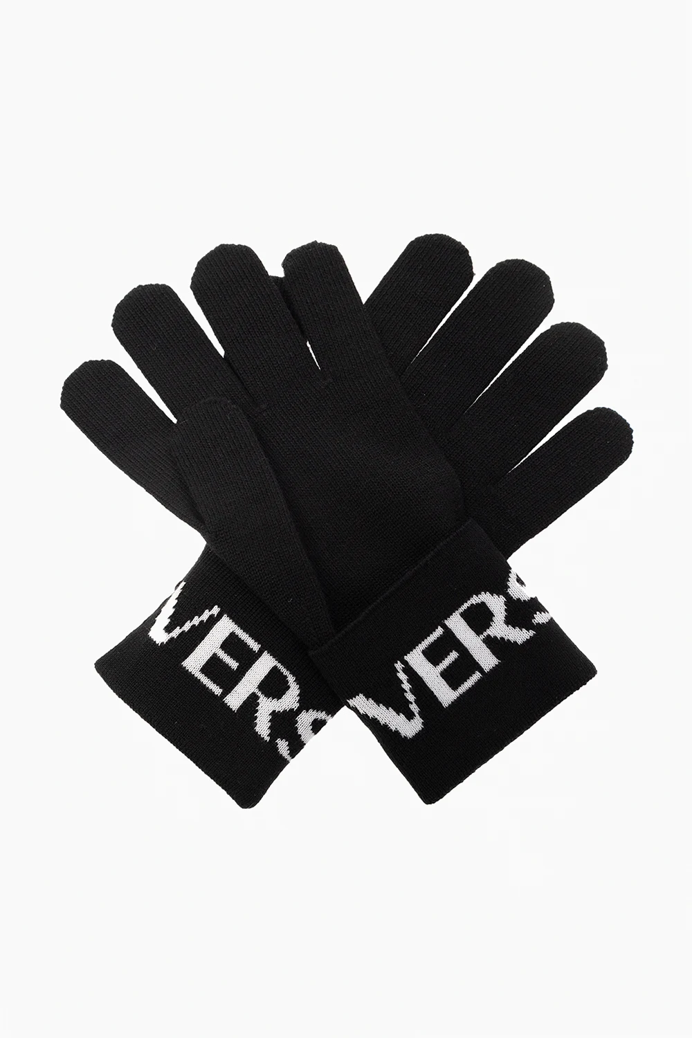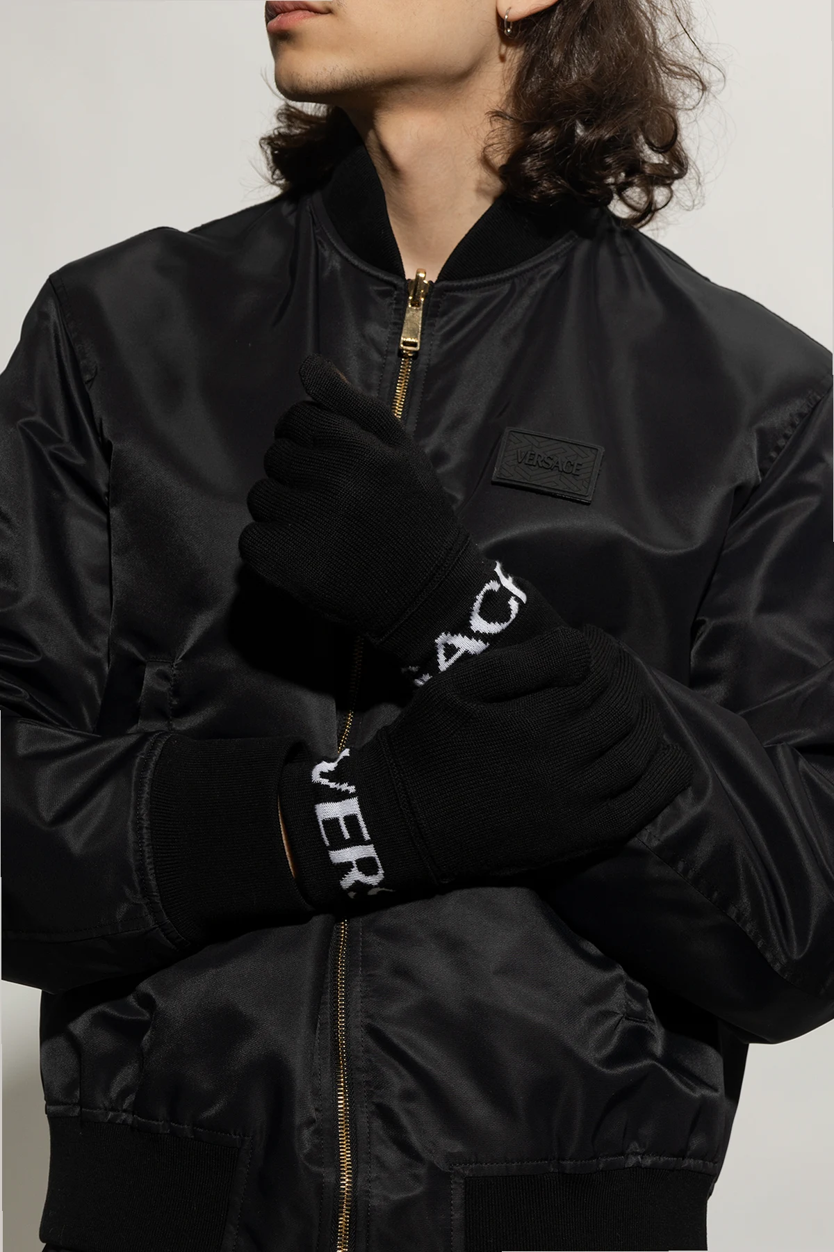 Czarne rękawice Versace. Wykonane z wełny z domieszką bawełny. Ozdobione wyszytym białym logo.
