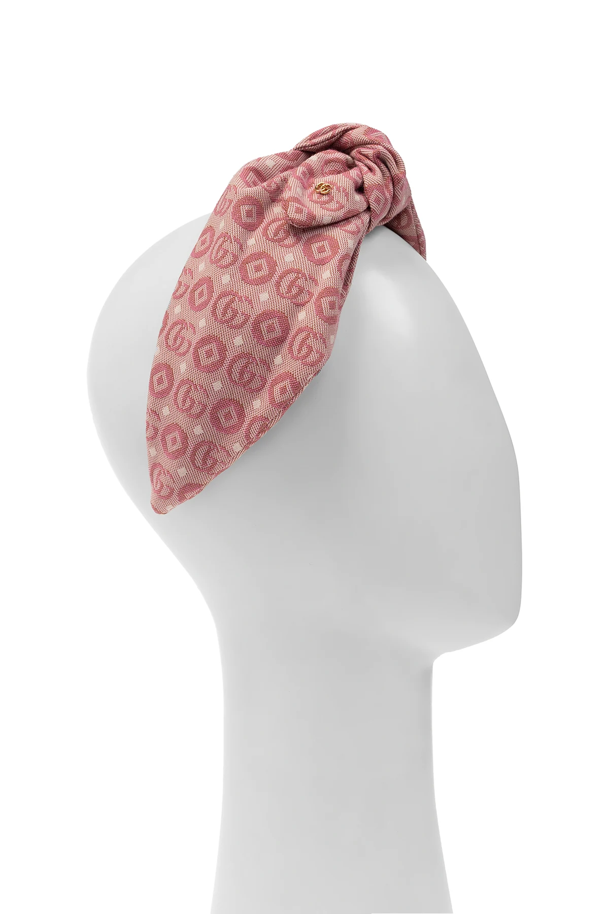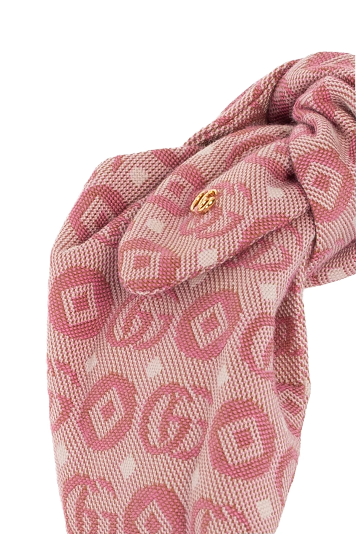 Różowa opaska na głowę Gucci Kids. Wykonana z materiału ozdobionego dekoracyjnym wzorem z logo ‘GG’. Metalowa aplikacja w kolorze złotym w kształcie logo.