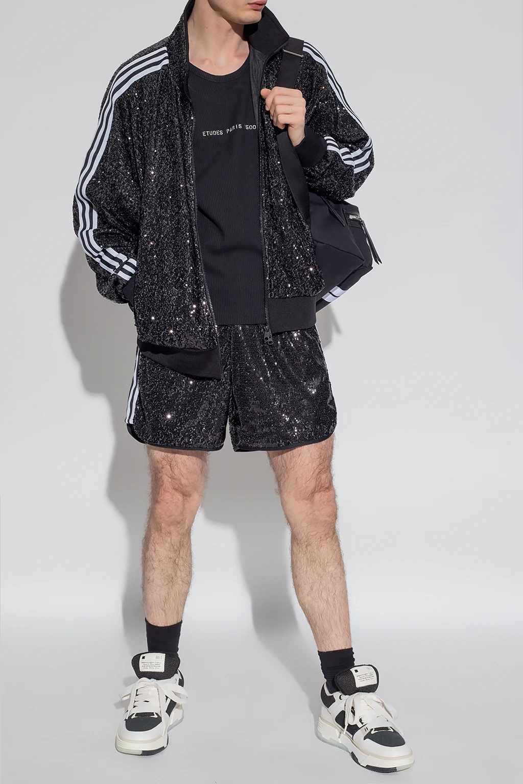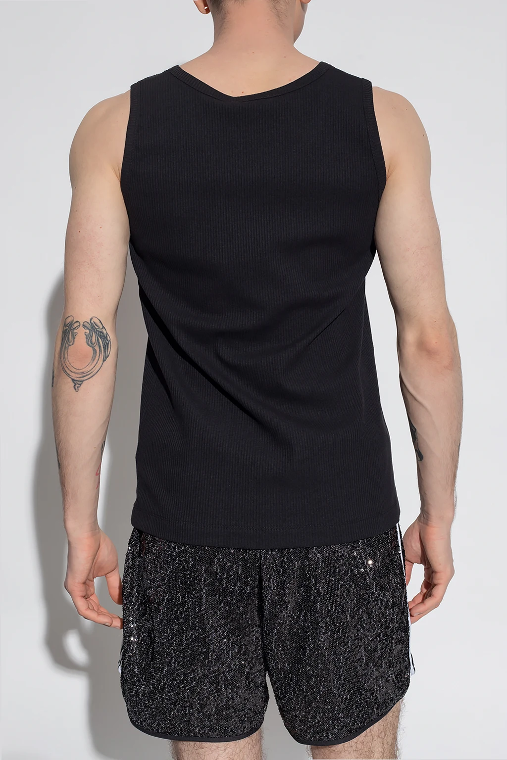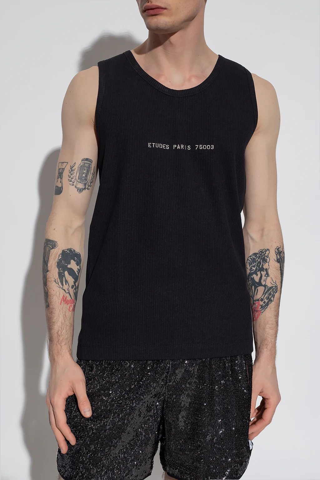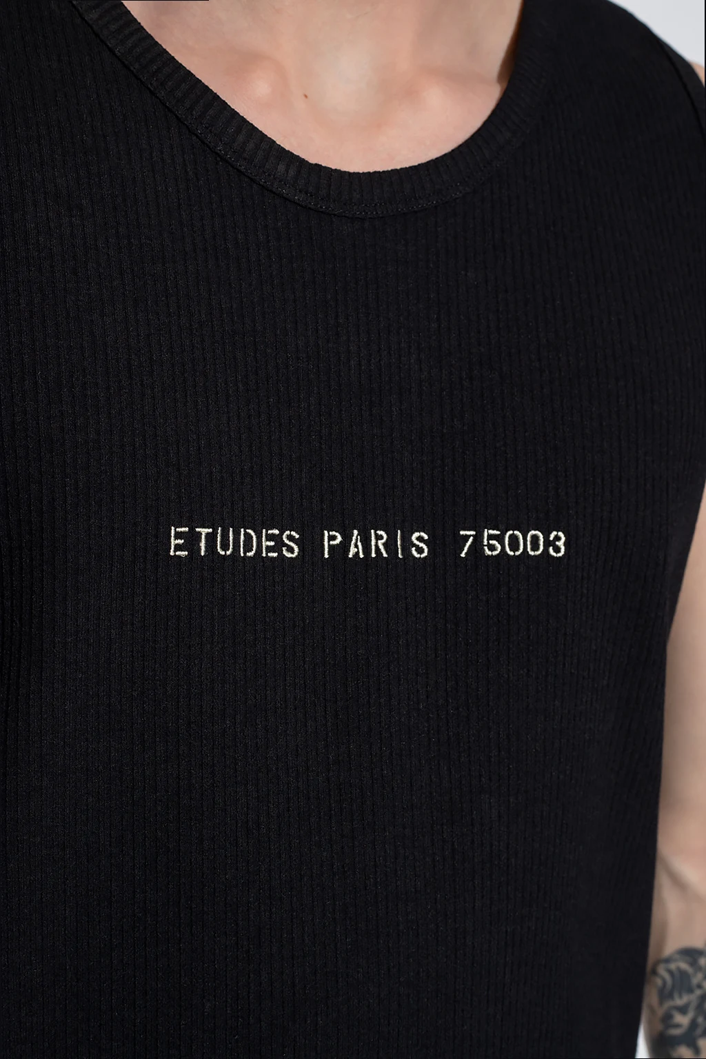 Czarny, prążkowany t-shirt bez rękawów Etudes. Z przodu ozdobiony białym, wyszytym logo. Okrągły dekolt.
