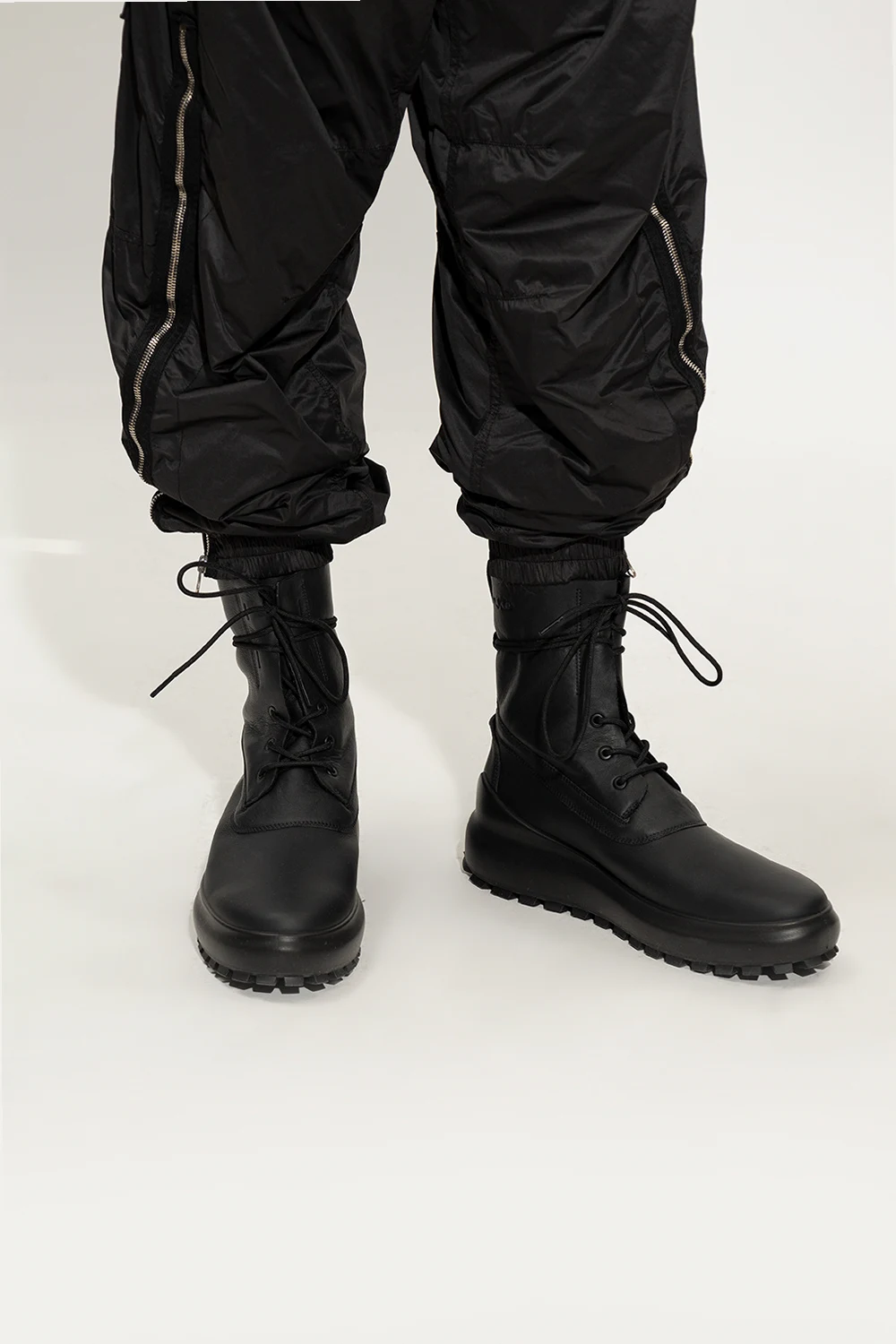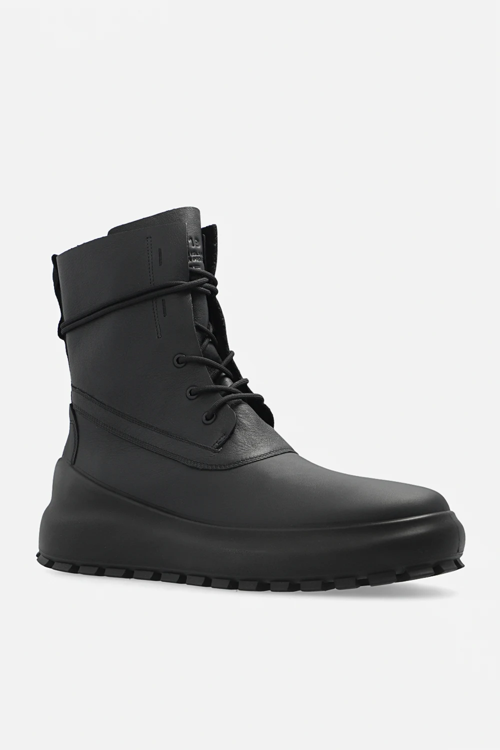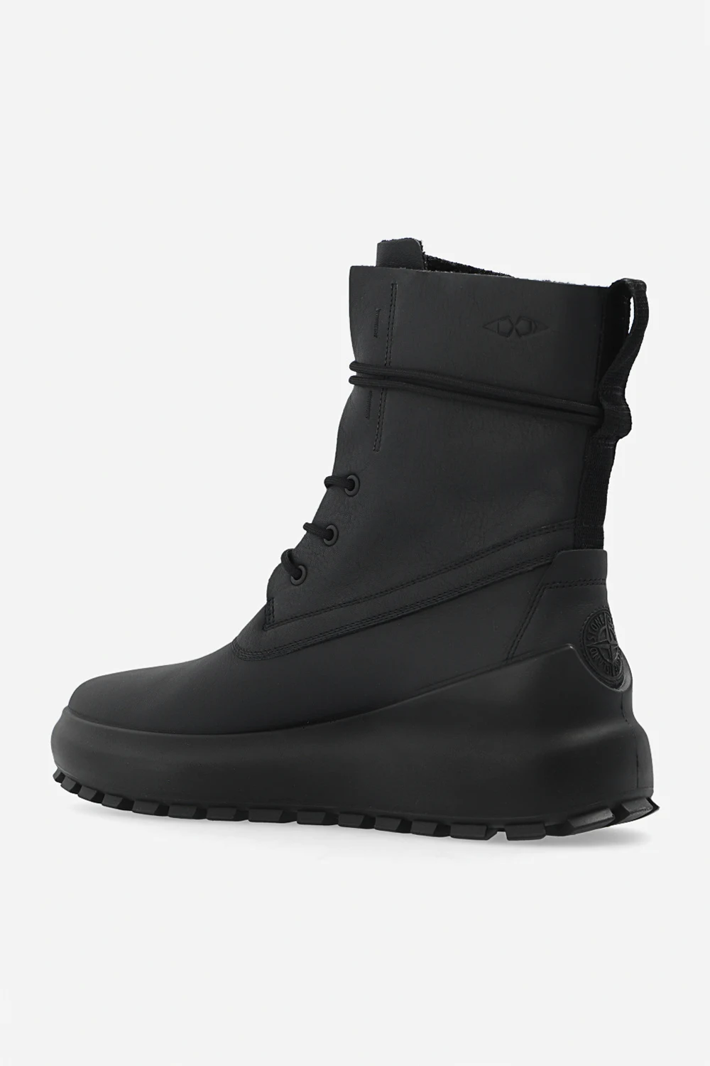 Czarne, sznurowane buty za kostkę Stone Island x Ecco. Wykonane ze skóry. Lekko ocieplane. Z tyłu ozdobione czarnym logo. Czarna, gumowa podeszwa.