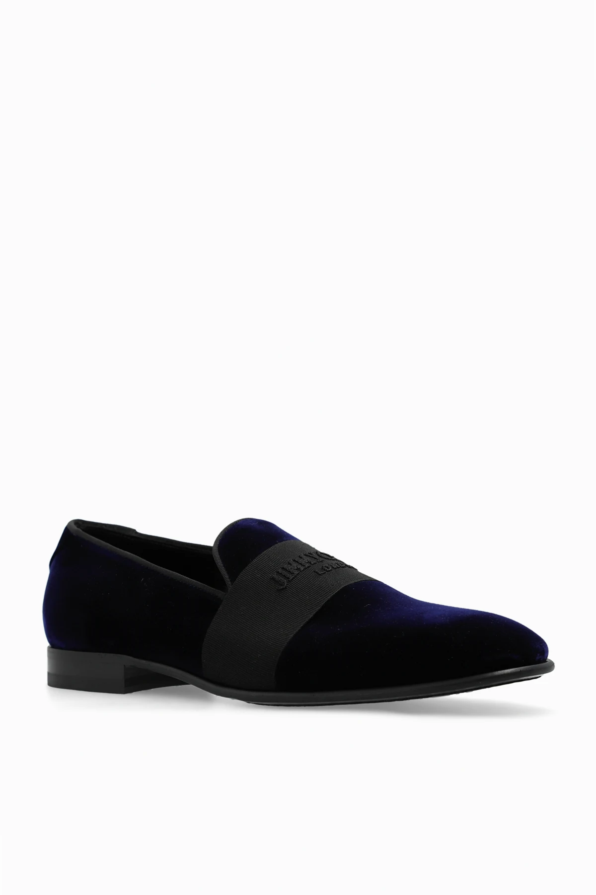 Granatowe buty typu ‘loafers’, model ‘Thame’ Jimmy Choo. Wykonane z weluru. Z przodu rypsowy pasek z wyszytym logo. Czarna, skórzana podeszwa.