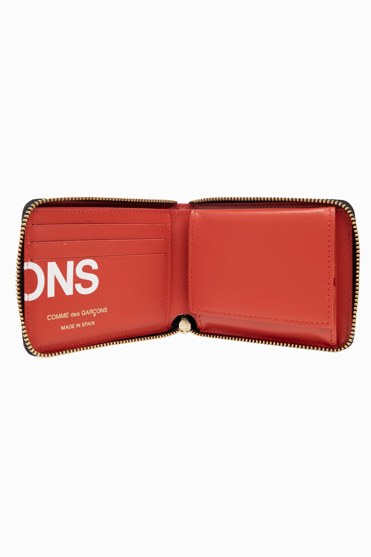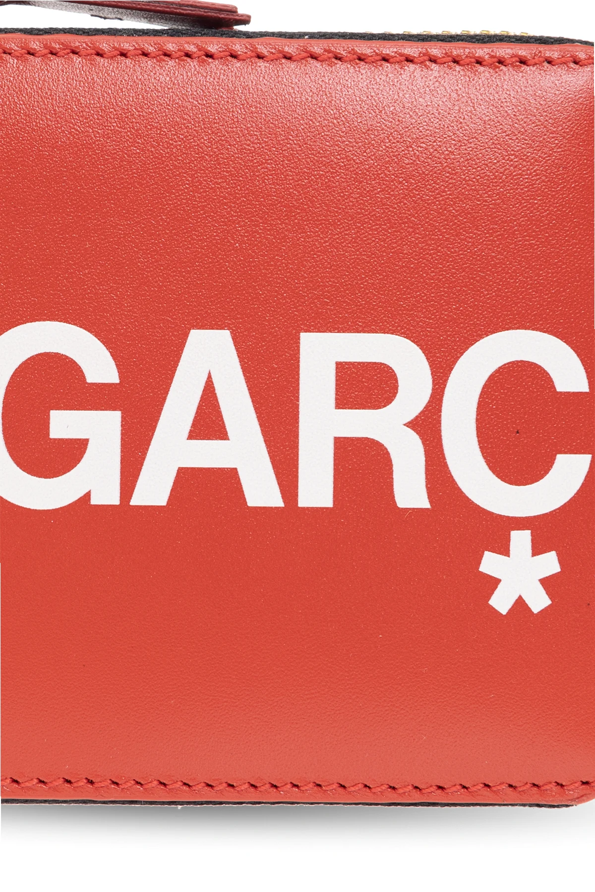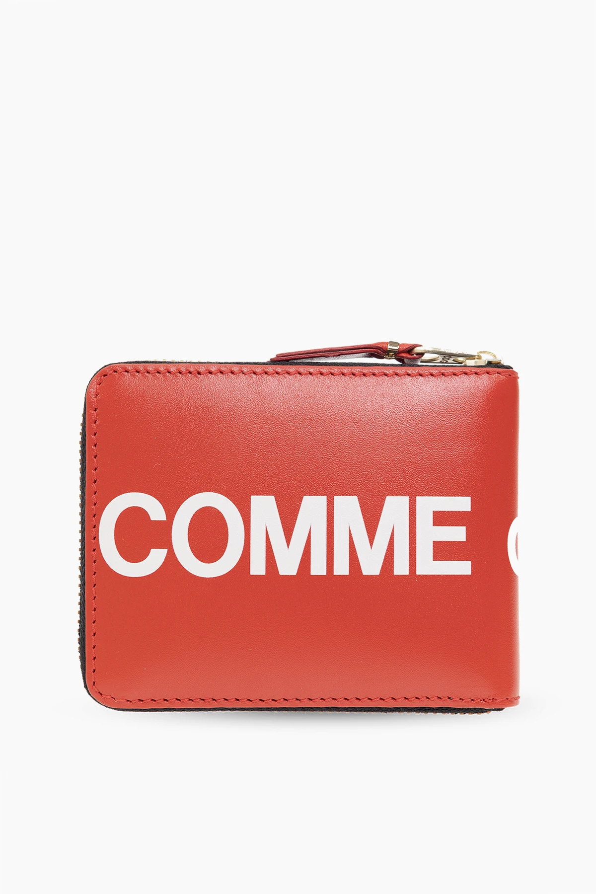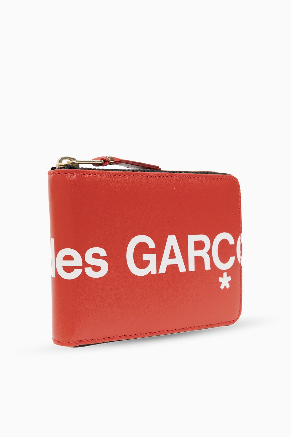 Czerwony portfel Comme des Garcons. Wykonany ze skóry krowiej. Zapinany na zamek. Ozdobiony nadrukiem z logo w kolorze białym. Wewnątrz trzy miejsca na karty, wsuwana kieszeń, miejsce na banknoty oraz na monety. Metalowe wykończenie w kolorze złotym.