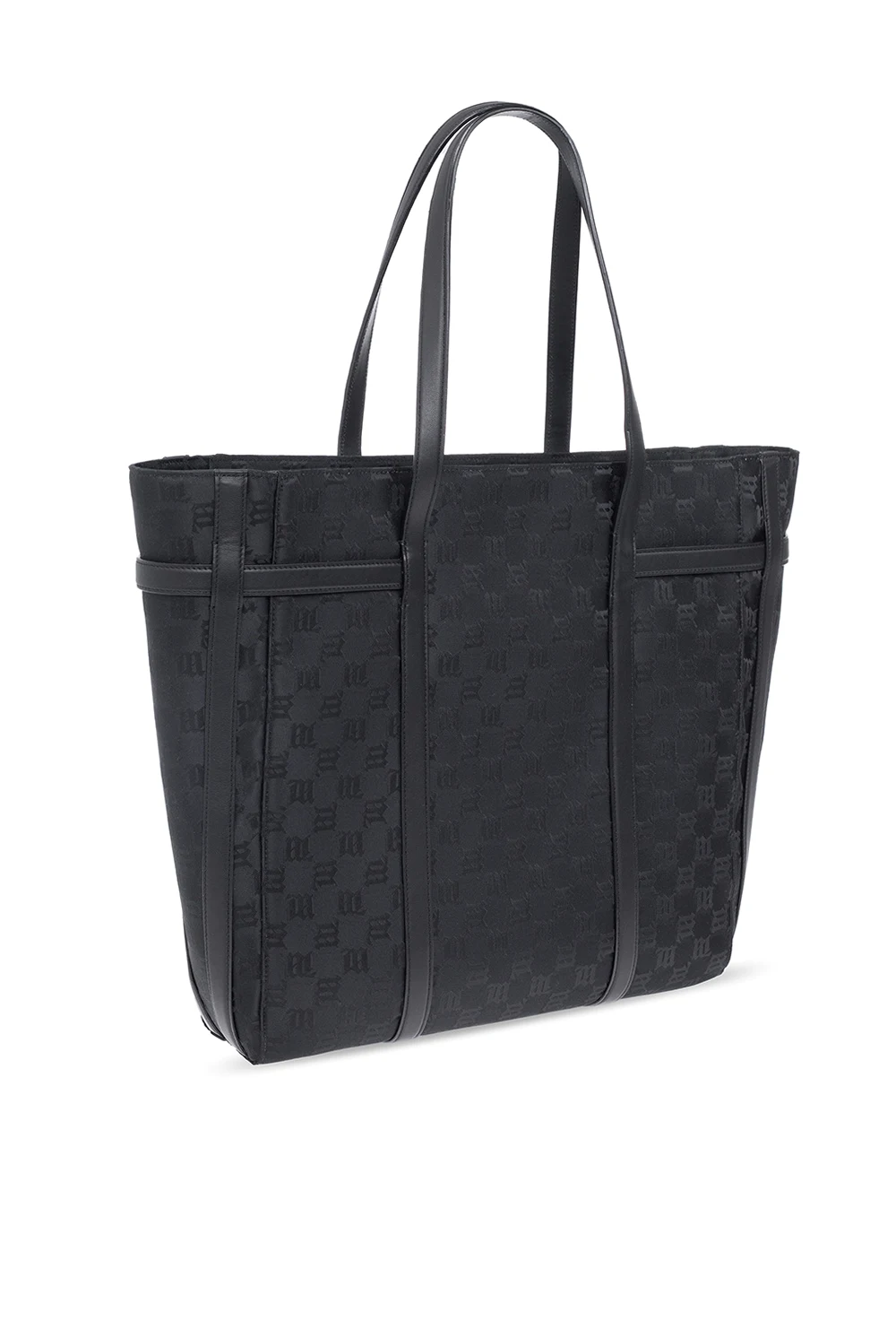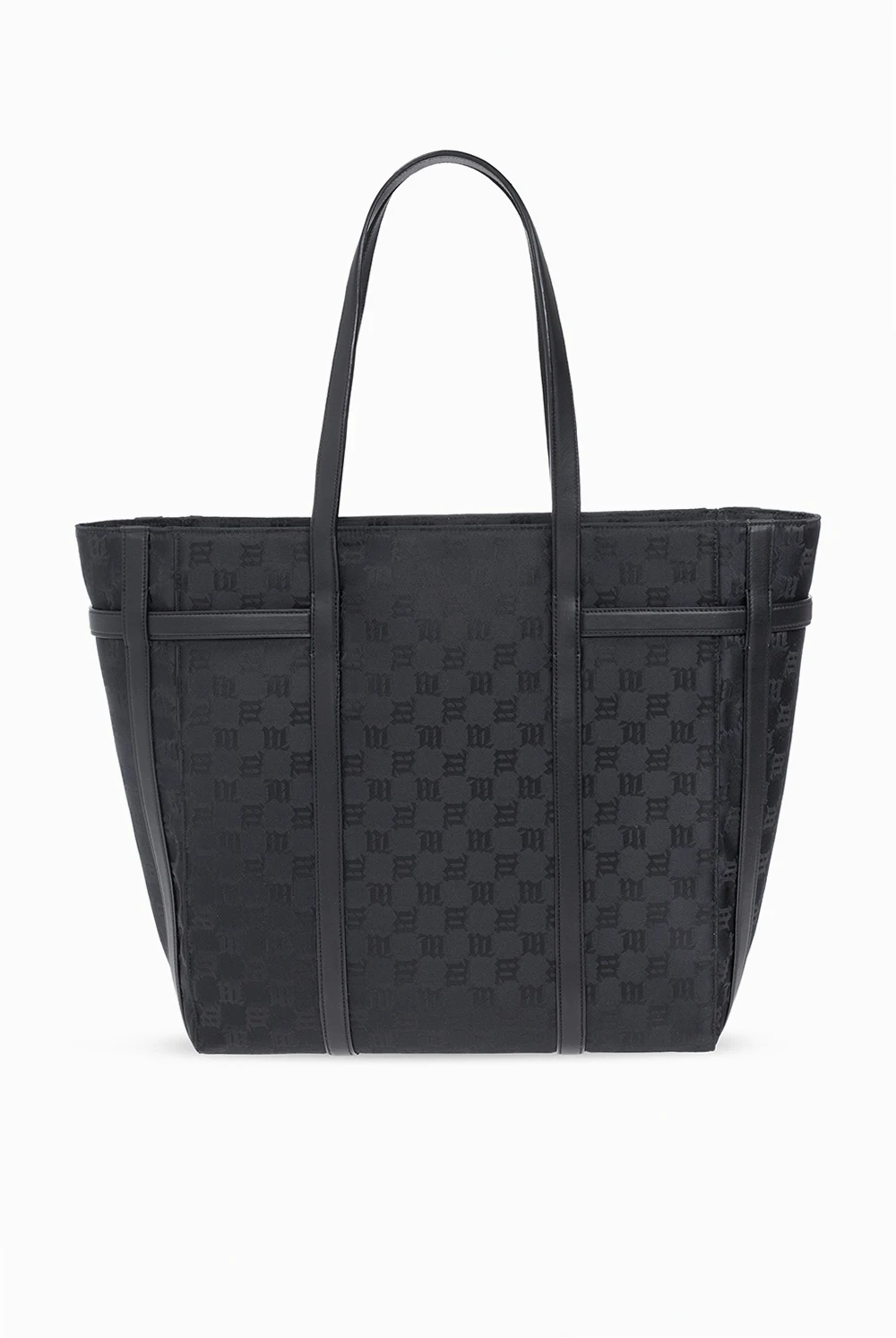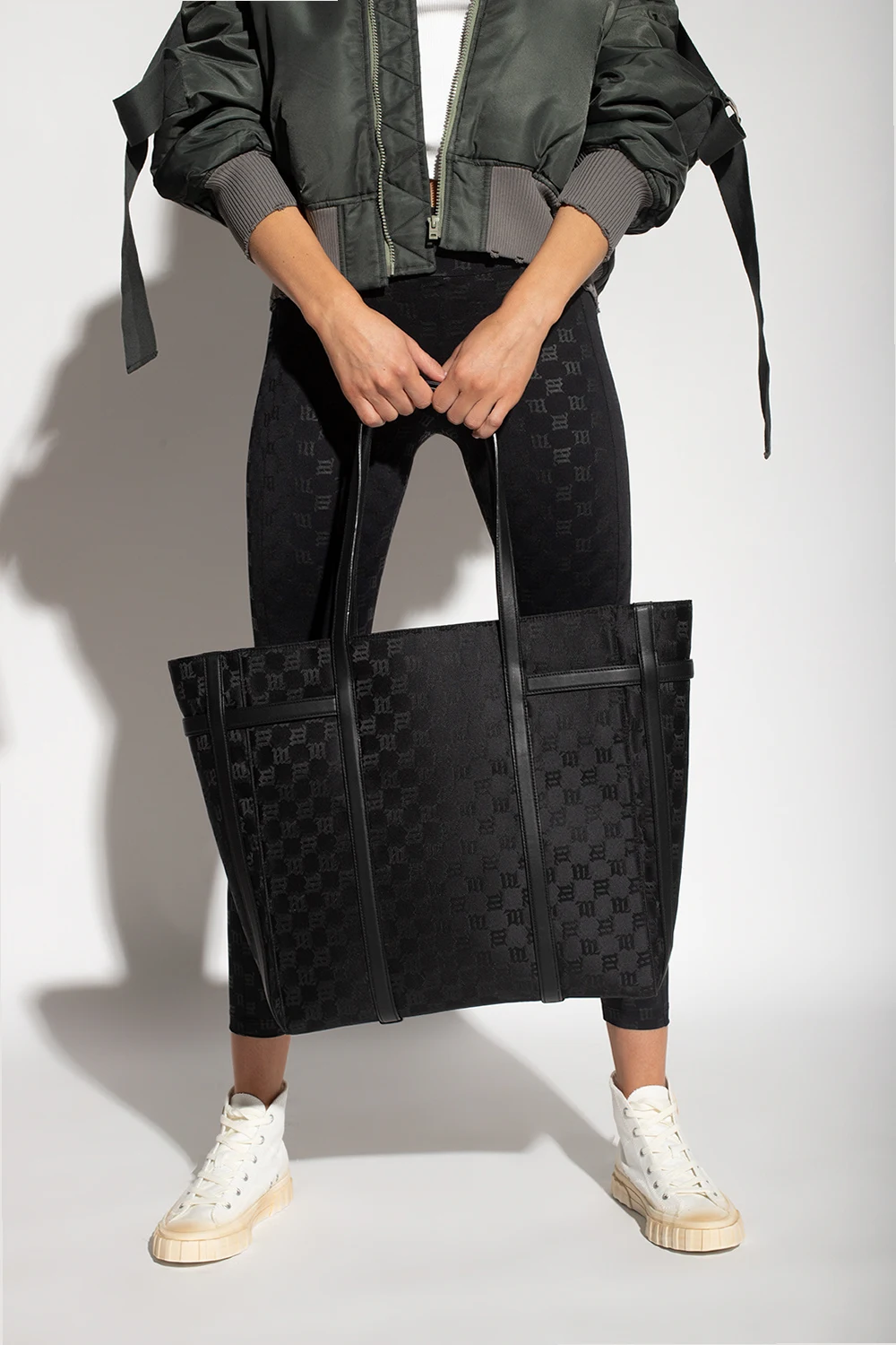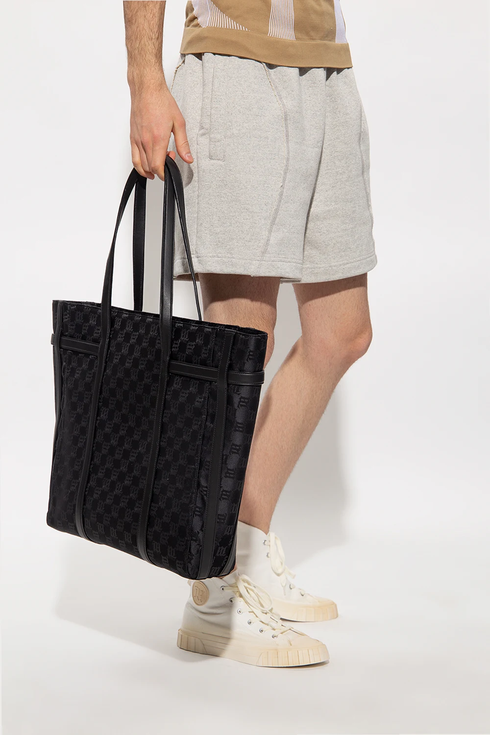 Czarna torba typu ‘shopper’ MISBHV. Zamykana na zamek. Ozdobiona wzorem z monogramem ‘M’. Dwie półokrągłe rączki. Wewnątrz komora oraz trzy kieszenie: dwie wsuwane i zamykana na zamek. Metalowe wykończenie w kolorze srebrnym.