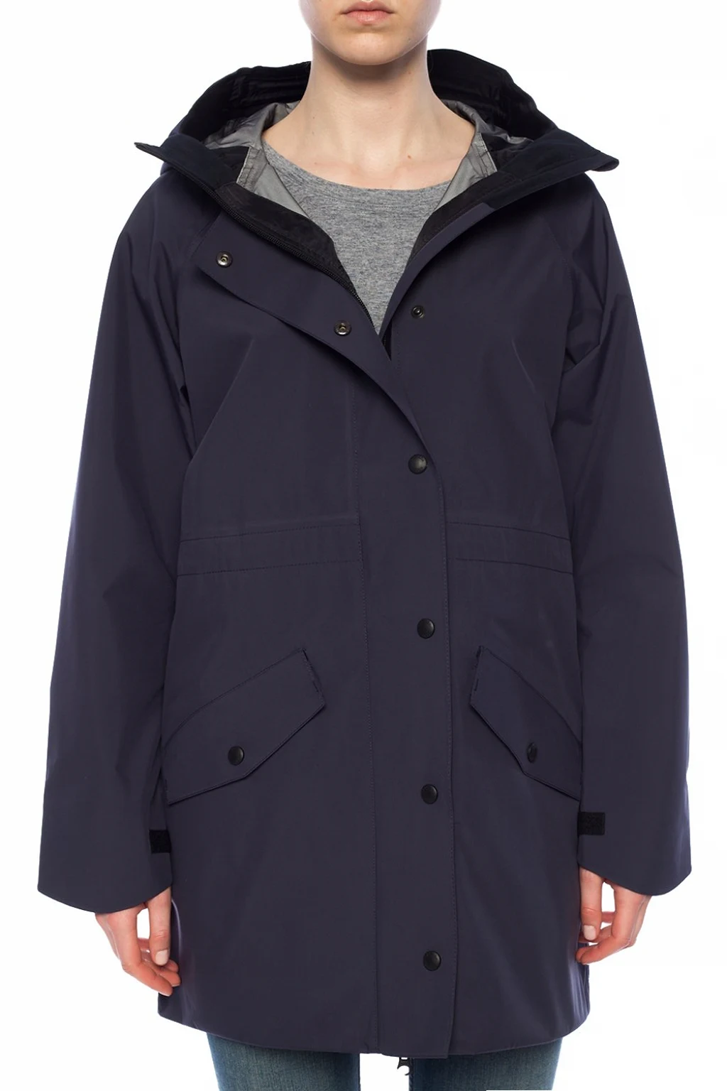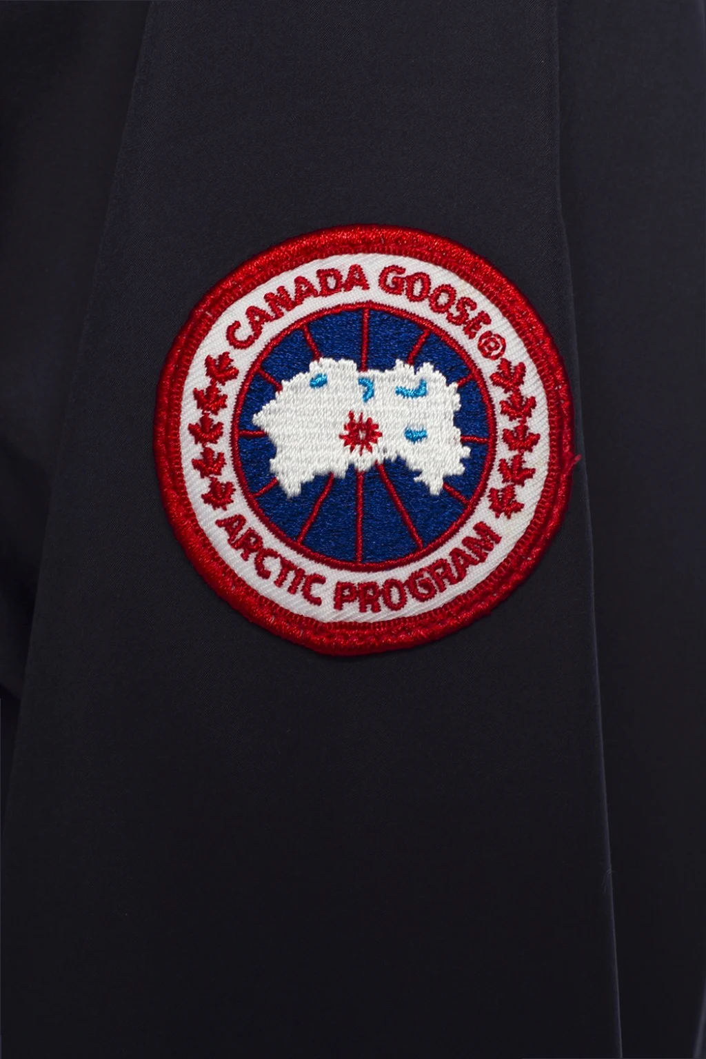 Granatowa kurtka z kapturem ściąganym trokami, model 'Trinity' Canada Goose. Zapinana na dwubiegunowy zamek i zatrzaski. Ozdobiona kolorowymi naszywkami z logo. Z przodu dwie kieszenie z patką zapinane na zatrzaski. W rękawach od wewnętrznej strony wszyte zamki umożliwiające swobodny przepływ powietrza. Ściągana trokami. Długie rękawy zapinane na rzepy. Metalowe elementy w kolorze ciemnoszarym.