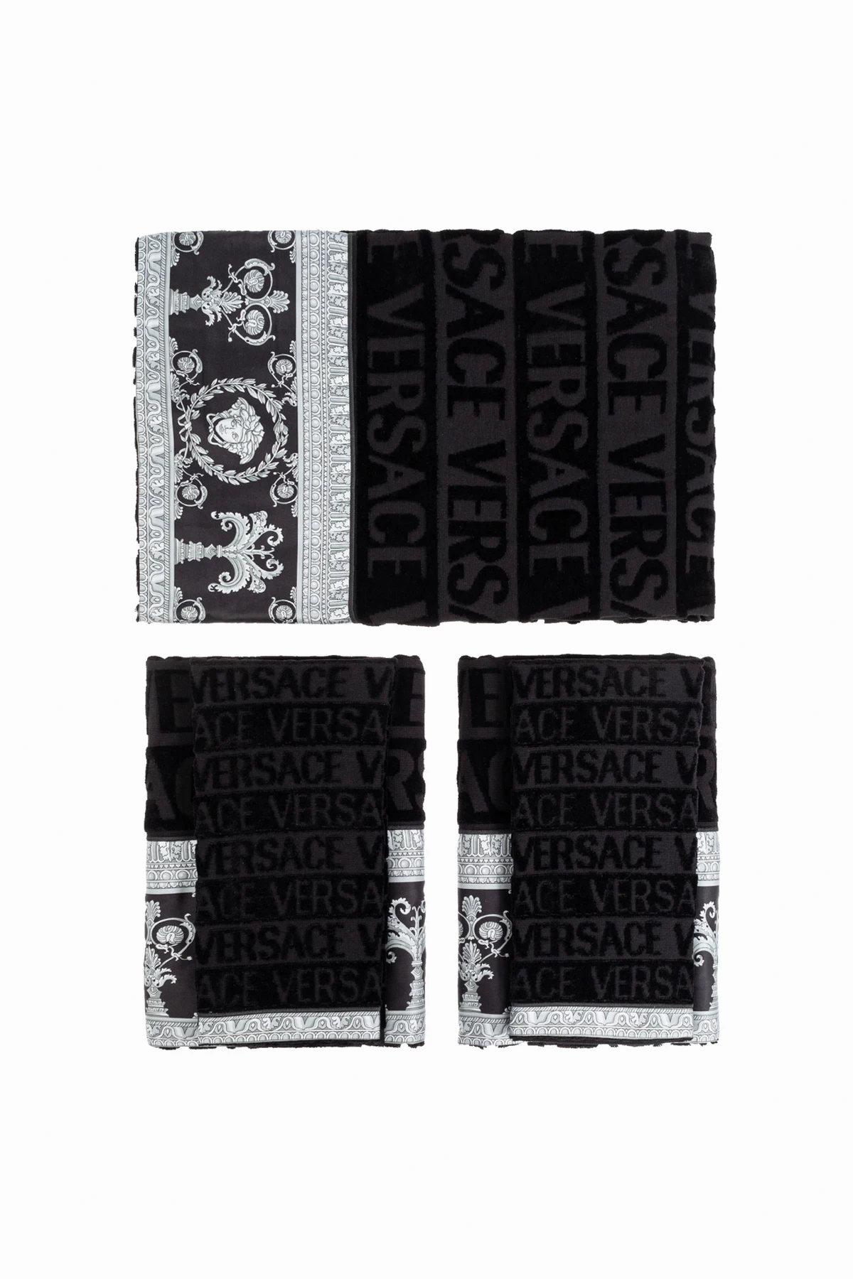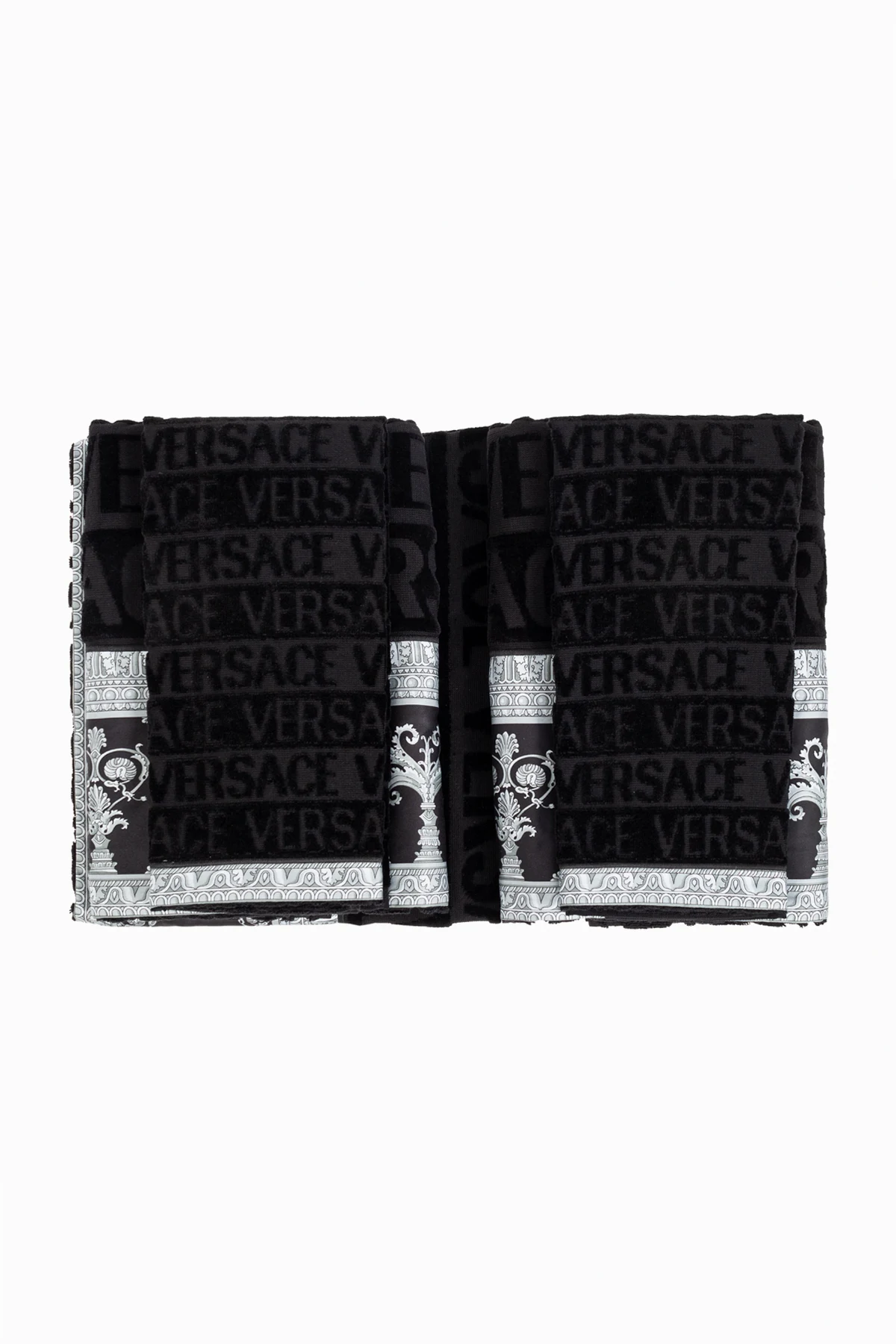 Na ręcznikach dumnie prezentuje się majestatyczny napis "VERSACE", powtarzający się poziomo, a ozdobny pas na końcu każdego ręcznika zdobi kultowy motyw Meduzy, otoczony finezyjnymi ornamentami. Te detale są świadectwem mistrzowskiego kunsztu i dbałości o szczegóły.
