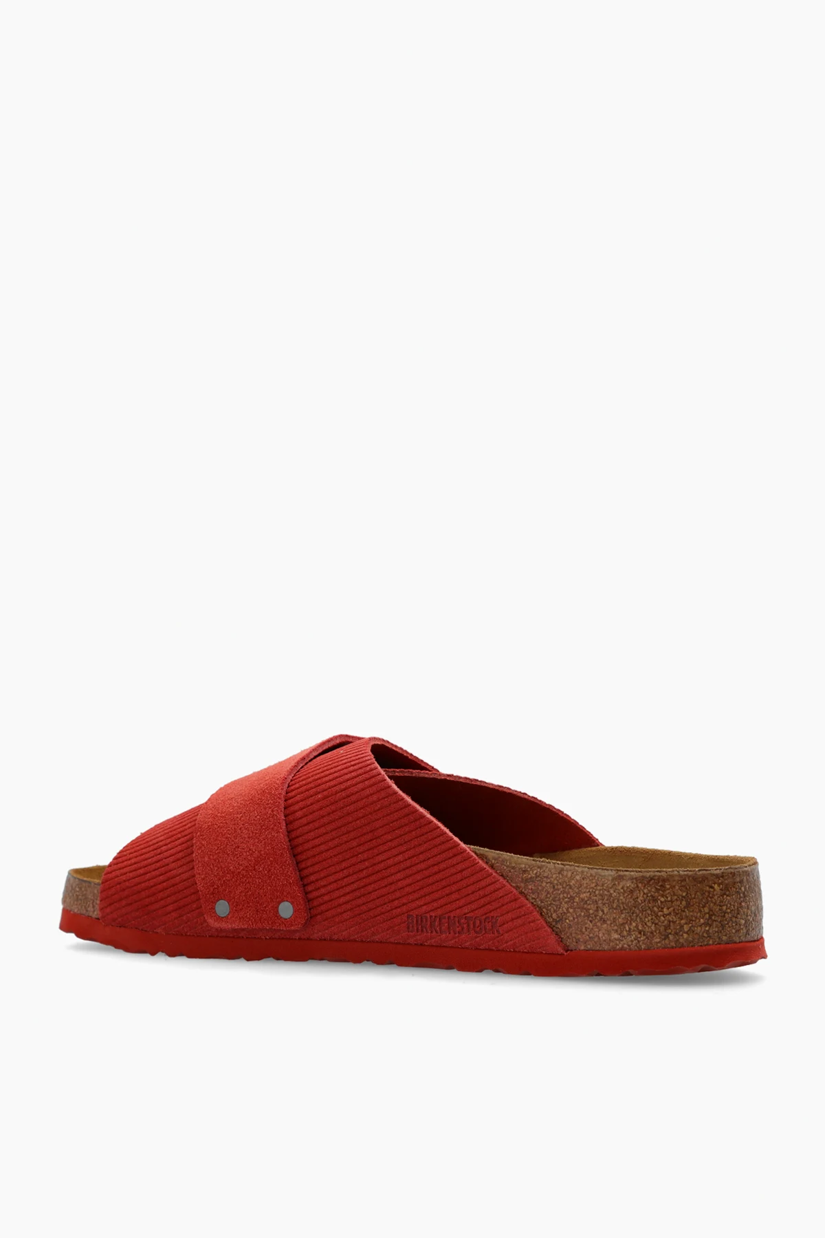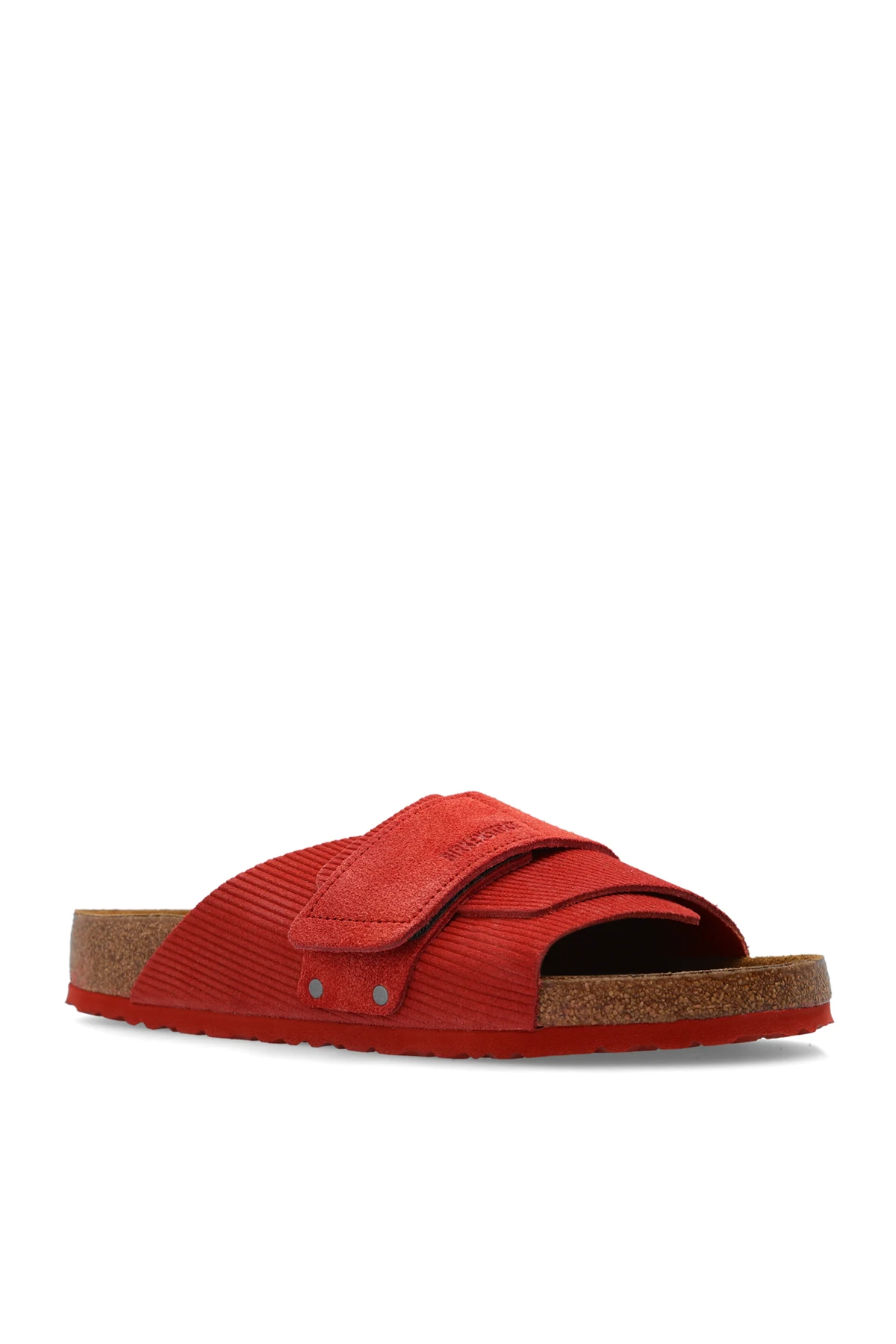 Czerwone klapki, model ‘Kyoto’ Birkenstock. Wykonane z prążkowanego zamszu. Cholewka o regularnej szerokości. Zapinane na rzepy. Ozdobione wytłoczonym logo. Czerwona podeszwa wykonana z naturalnego korka oraz pianki EVA.
