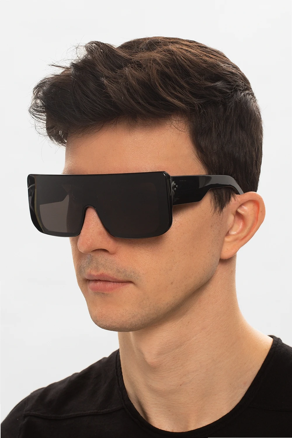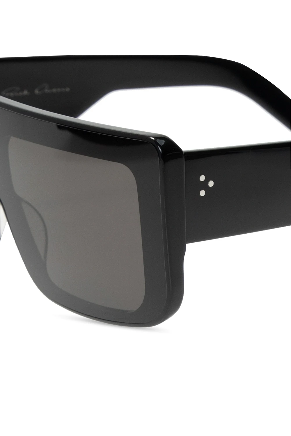 Czarne okulary przeciwsłoneczne, model ‘Shielding’ Rick Owens. Czarne, certyfikowane soczewki 100% UVA/UVB. Dołączone etui.