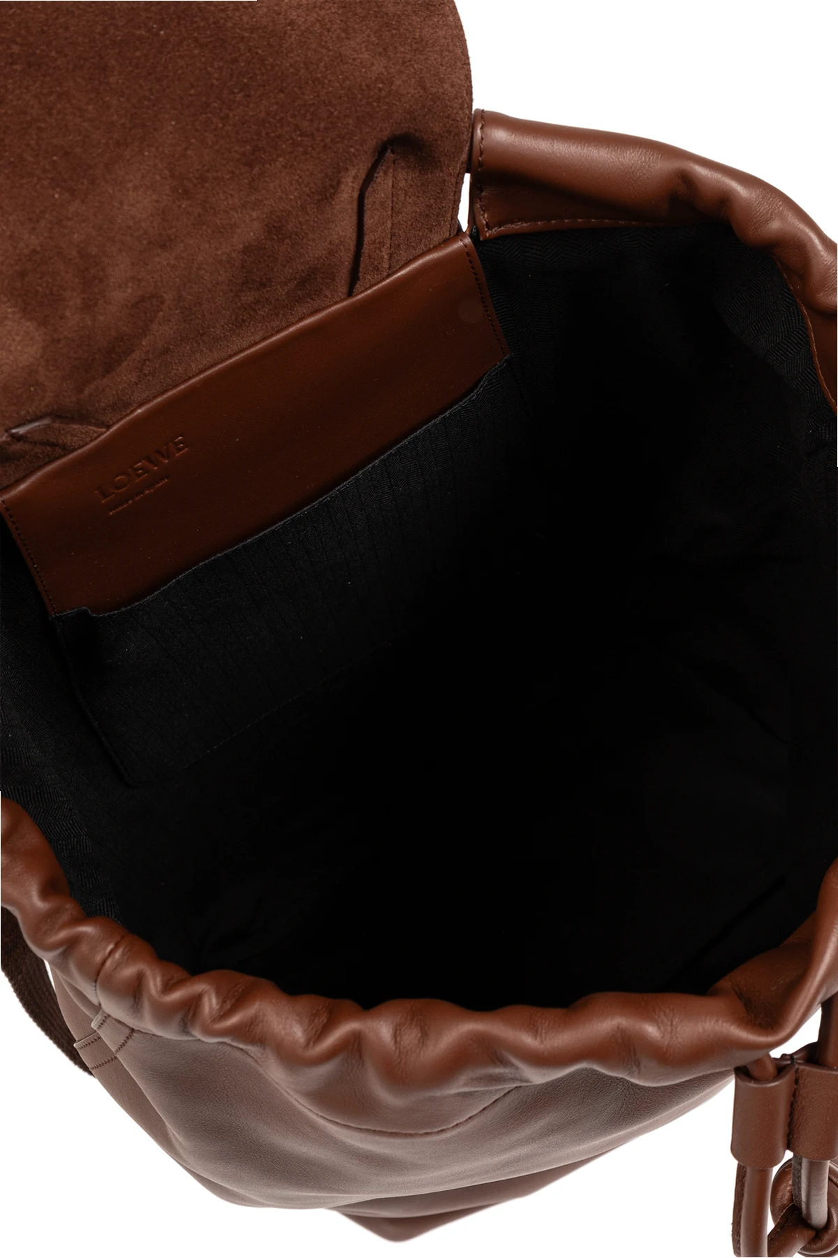 Plecak wyposażony jest w klapę z zamknięciem na sznurek, zakończonym ozdobnym węzłem. Wewnątrz znajduje się komora oraz wsuwana kieszeń z napisem "LOEWE".