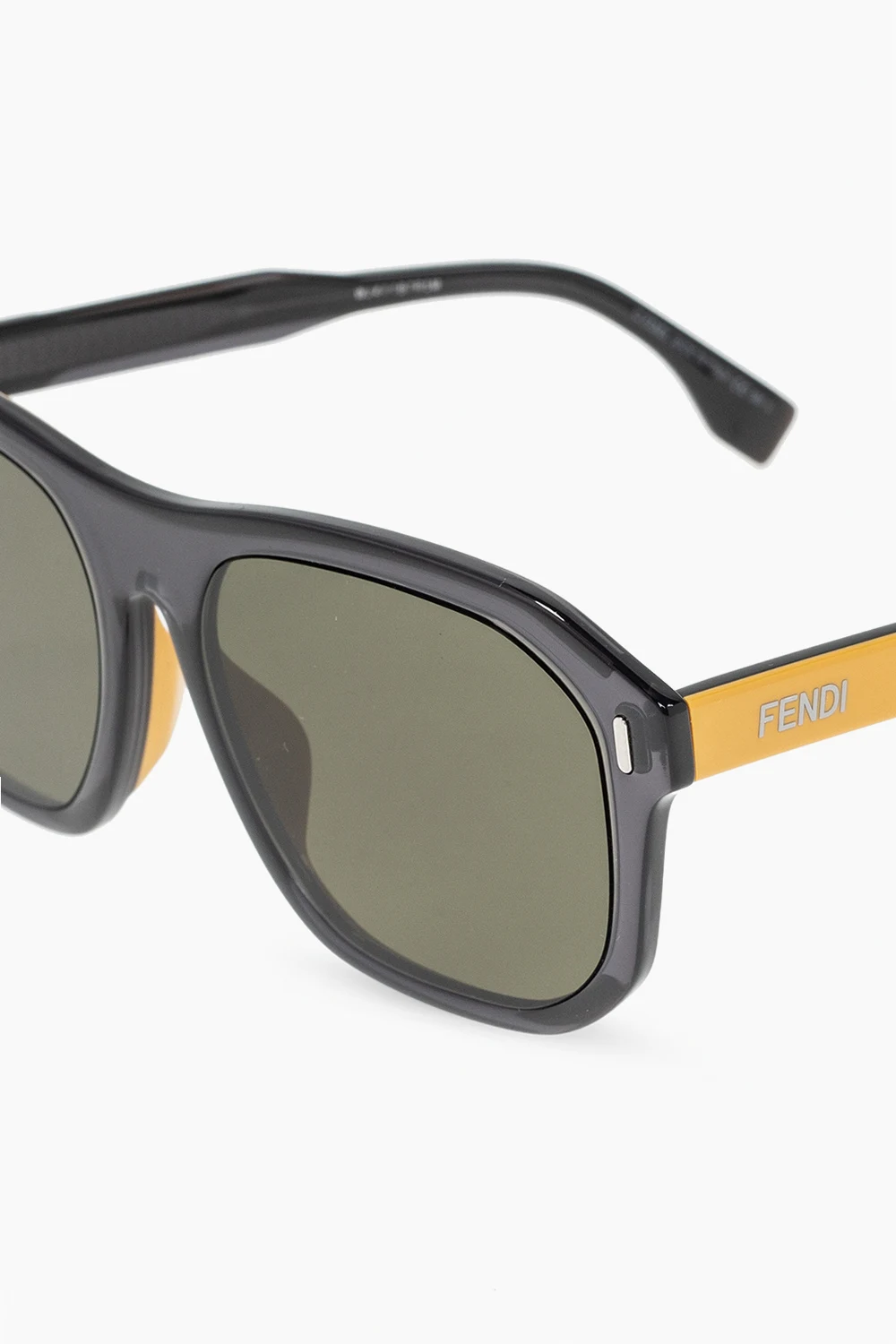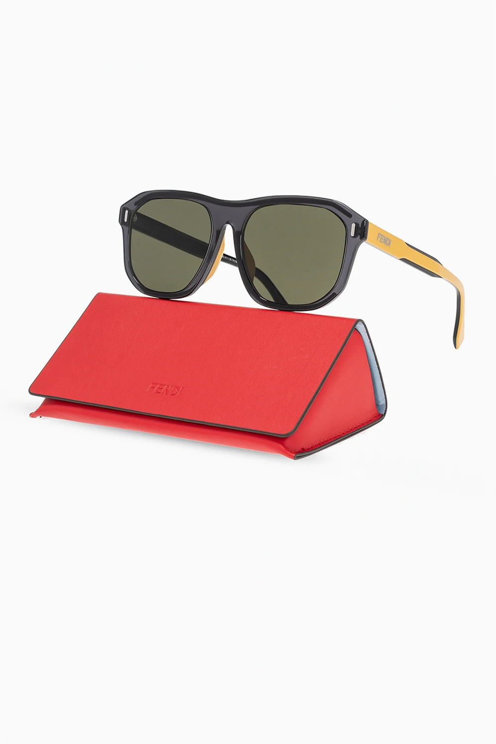 Czarno-żółte okulary przeciwsłoneczne Fendi. Ozdobione logo. Certyfikowane soczewki 100% UVA/UVB. Dołączone etui w kolorze czerwonym.