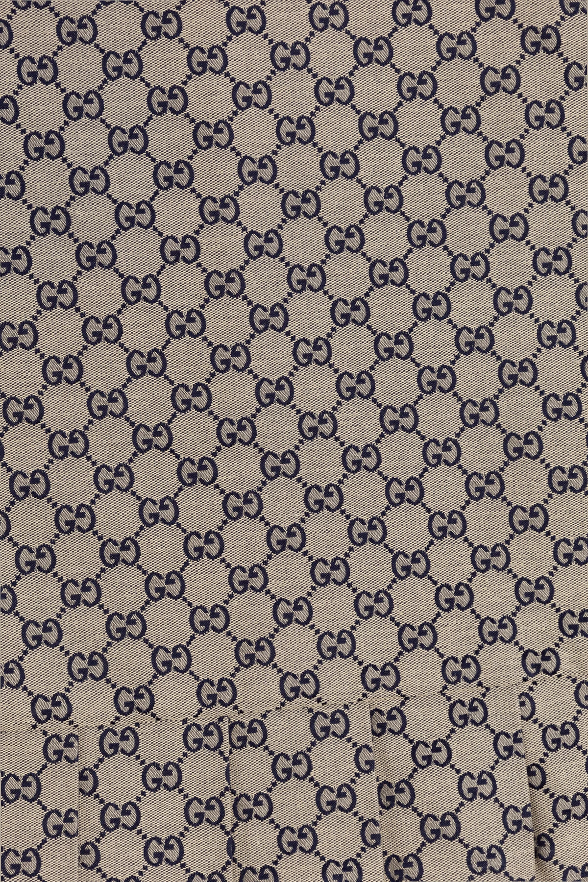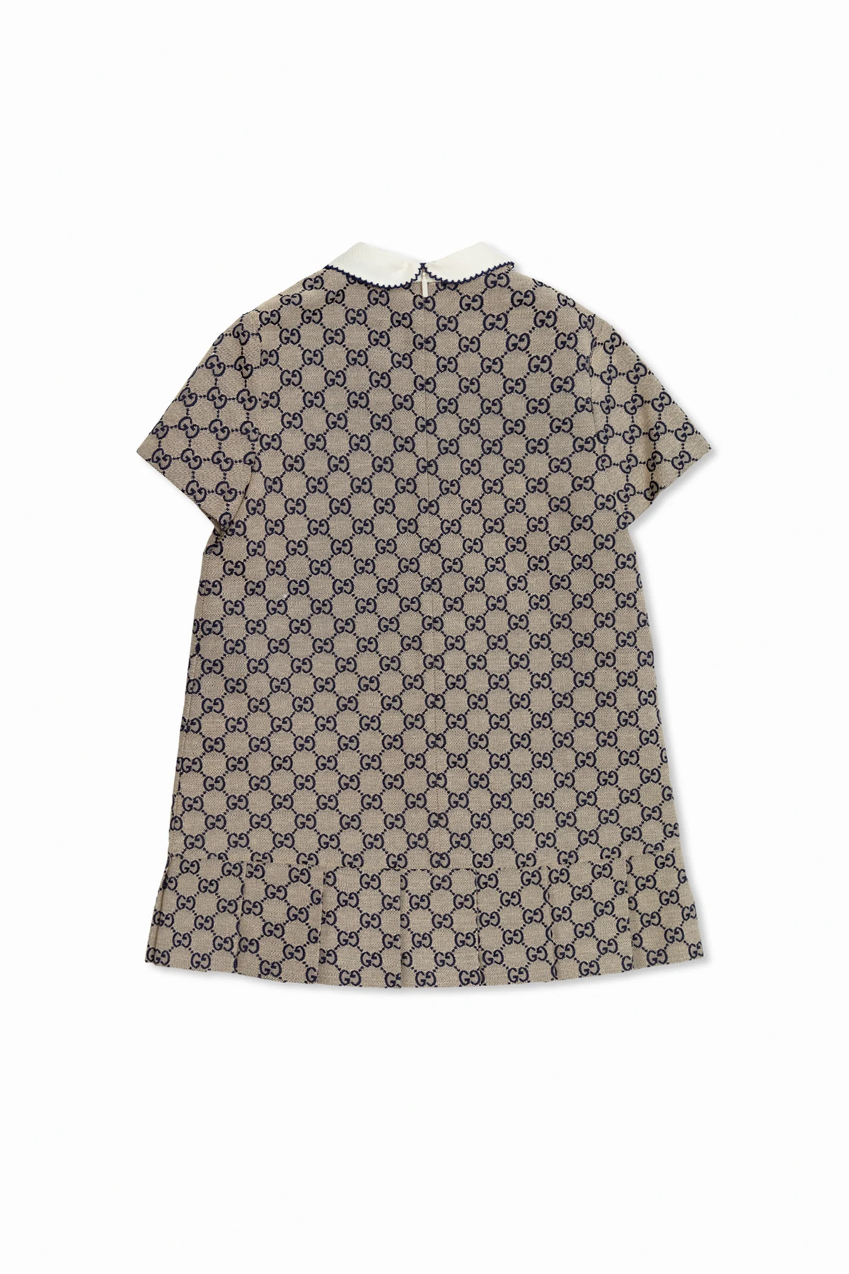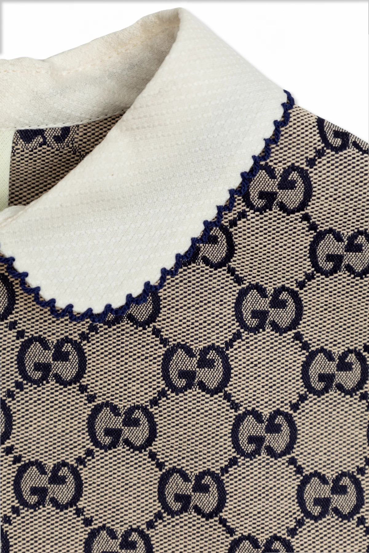 Wykonana z wysokiej jakości materiałów, beżowo-granatowa sukienka ozdobiona jest charakterystycznym monogramem 'GG', który dodaje jej wyrafinowanego charakteru. Biały kołnierzyk typu Peter Pan, z granatowym obszyciem, podkreśla elegancję i klasyczny wygląd tego wyjątkowego stroju.