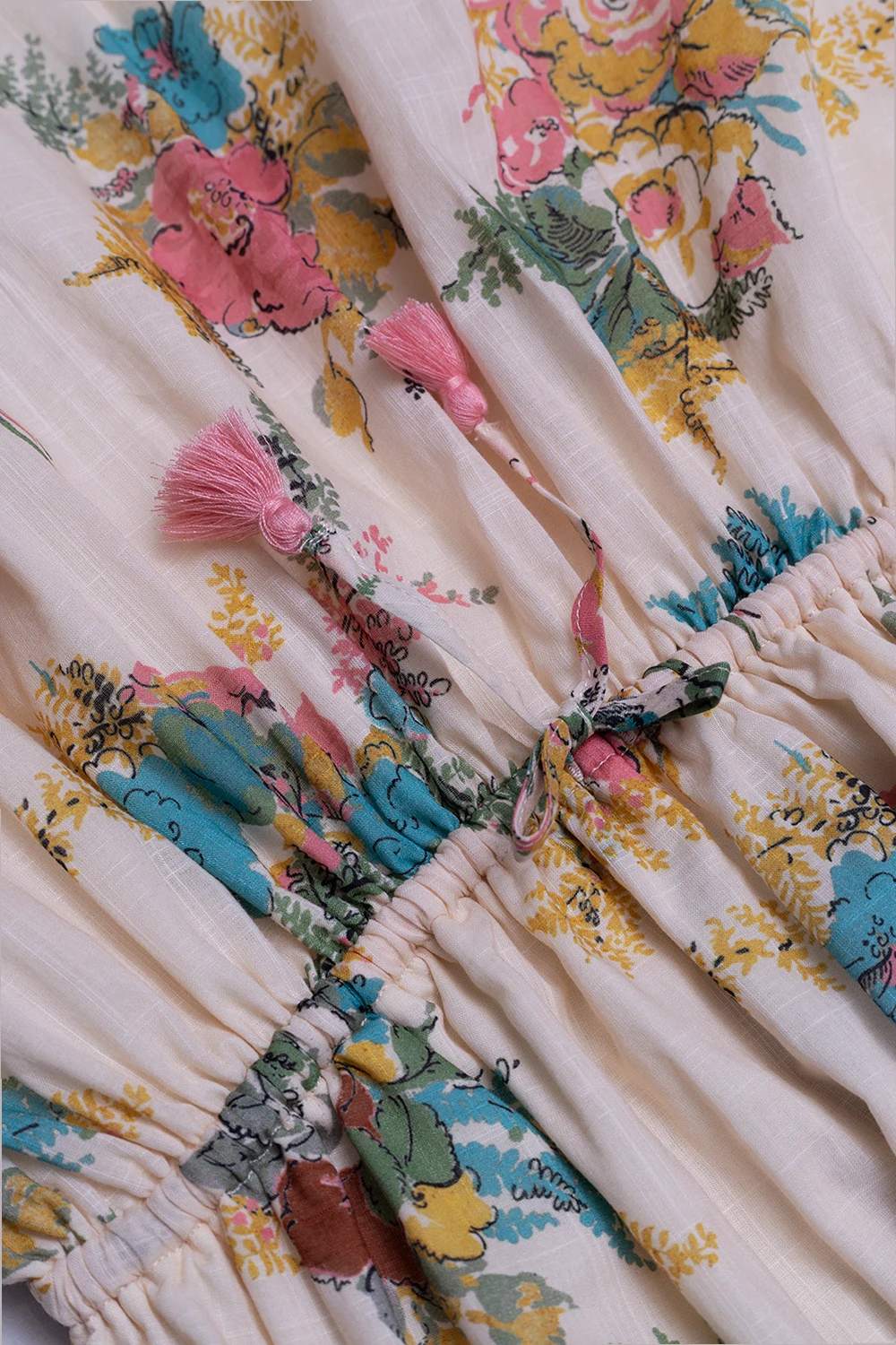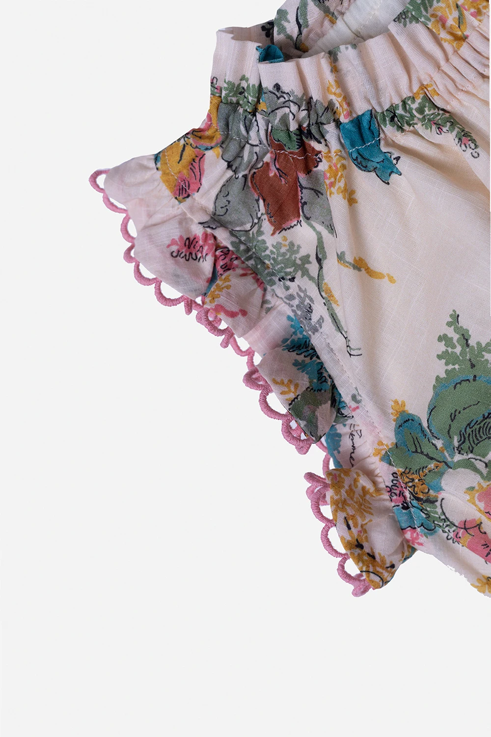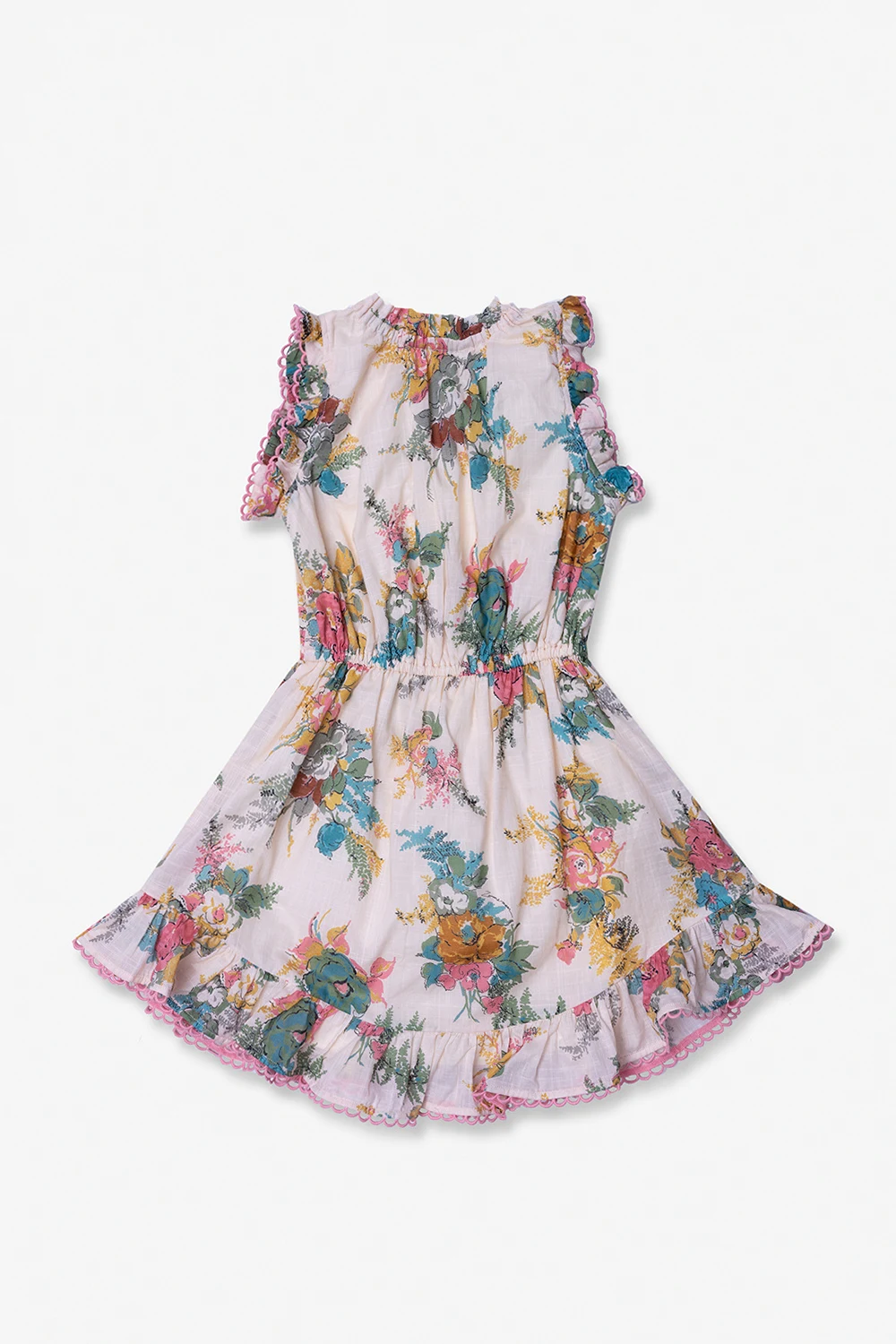 Kremowa, bawełniana sukienka bez rękawów Zimmermann Kids. Ozdobiona kolorowym nadrukiem z motywem kwiatowym. W talii wiązana trokami. Dekoracyjne falbany i różowe koronkowe wykończenie. Okrągły dekolt.