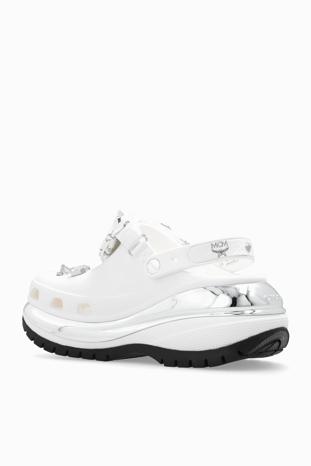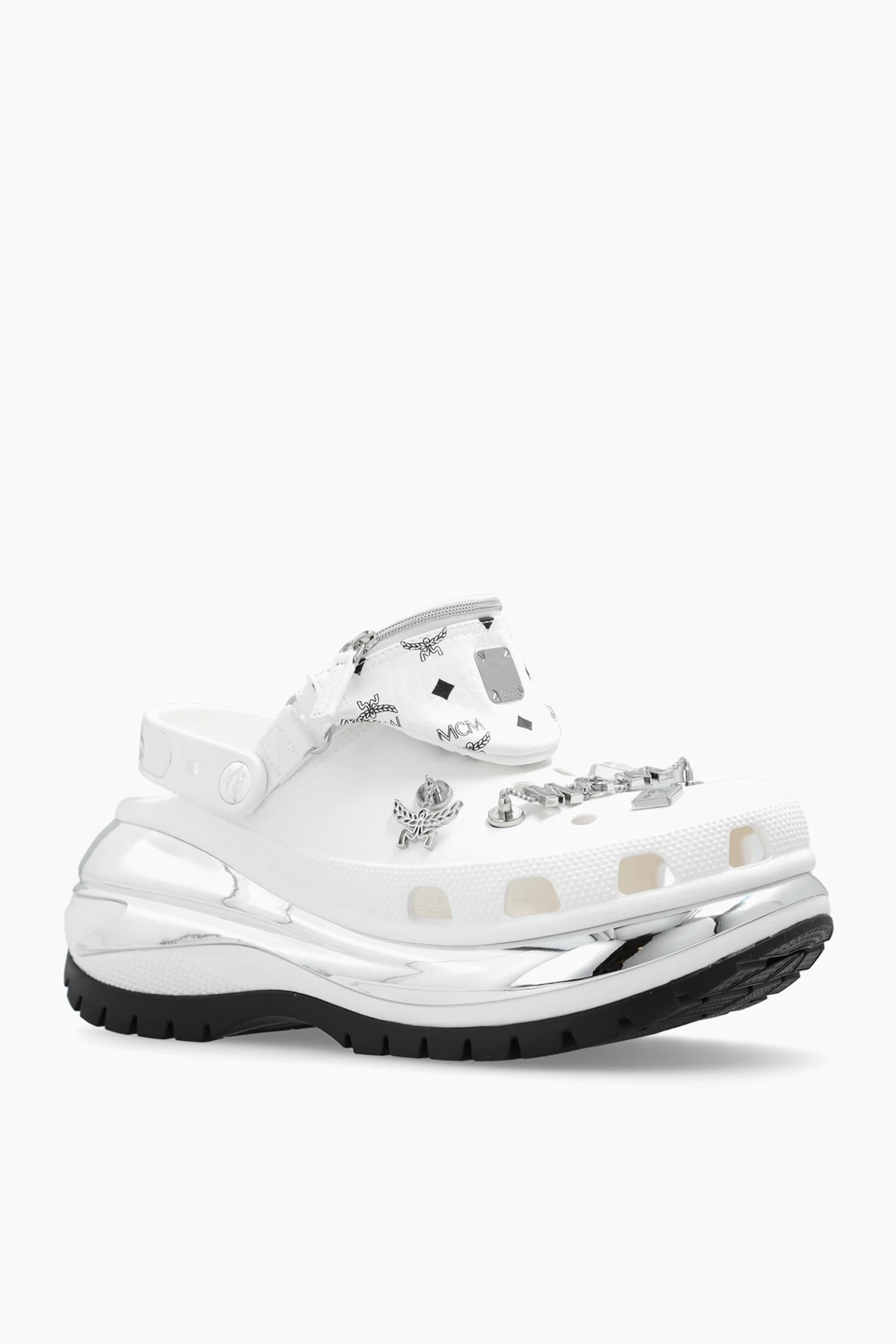Białe klapki na platformie MCM x Crocs™. Ozdobione metalowymi aplikacjami w kolorze srebrnym oraz perforacjami. Z tyłu nadrukowane logo w kolorze czarnym. Dekoracyjna, odpinana saszetka z zamknięciem na zamek. Czarna, gumowa podeszwa.