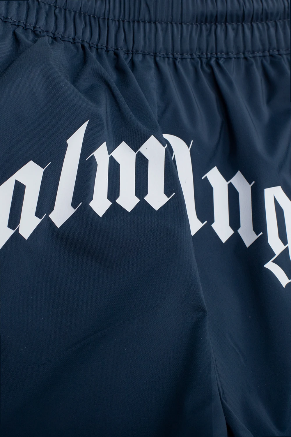 Granatowe szorty kąpielowe Palm Angels Kids. W pasie ściągane białymi trokami. Z przodu nadrukowane białe logo. Trzy kieszenie: dwie z przodu i jedna z tyłu patką.