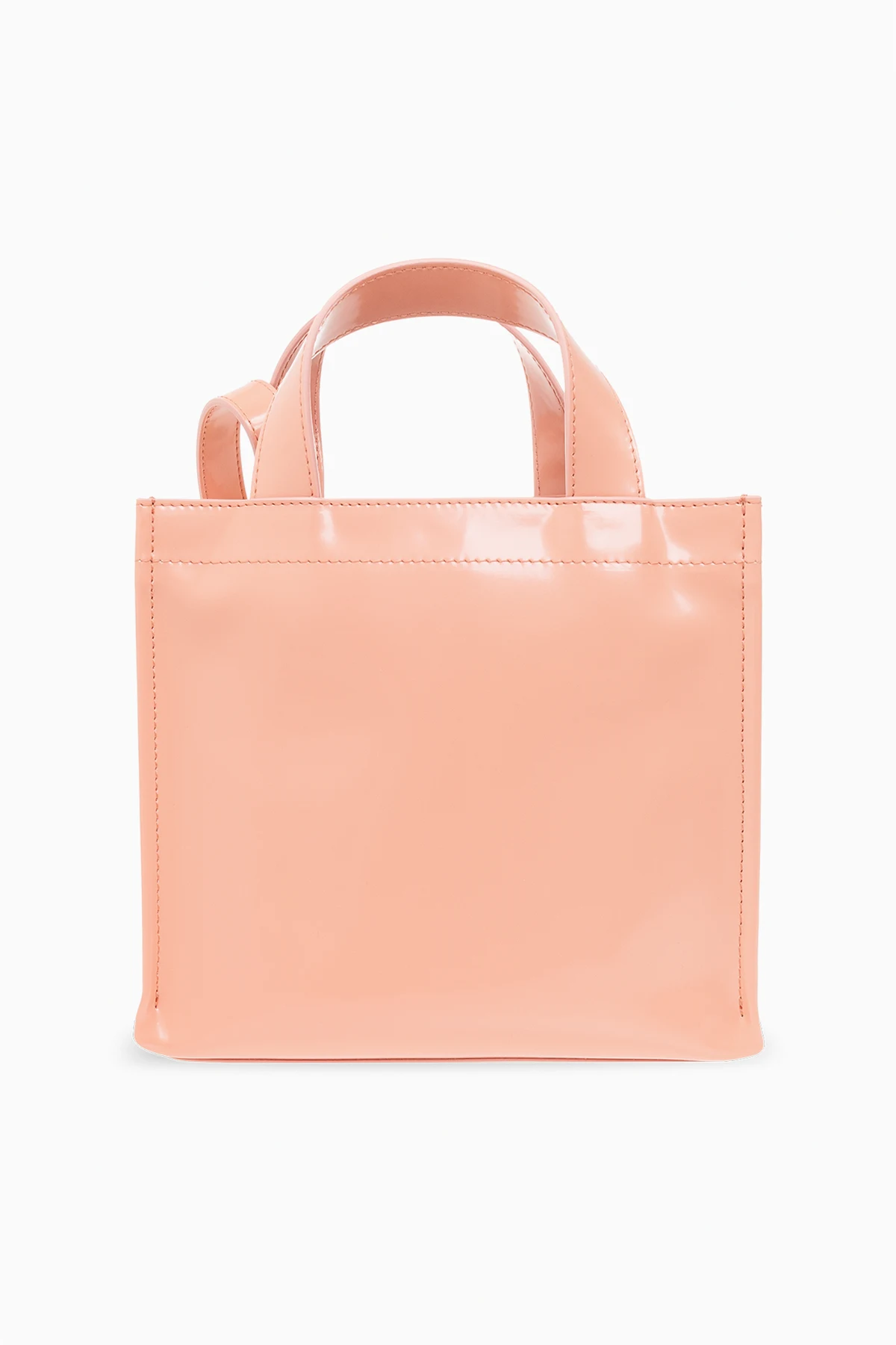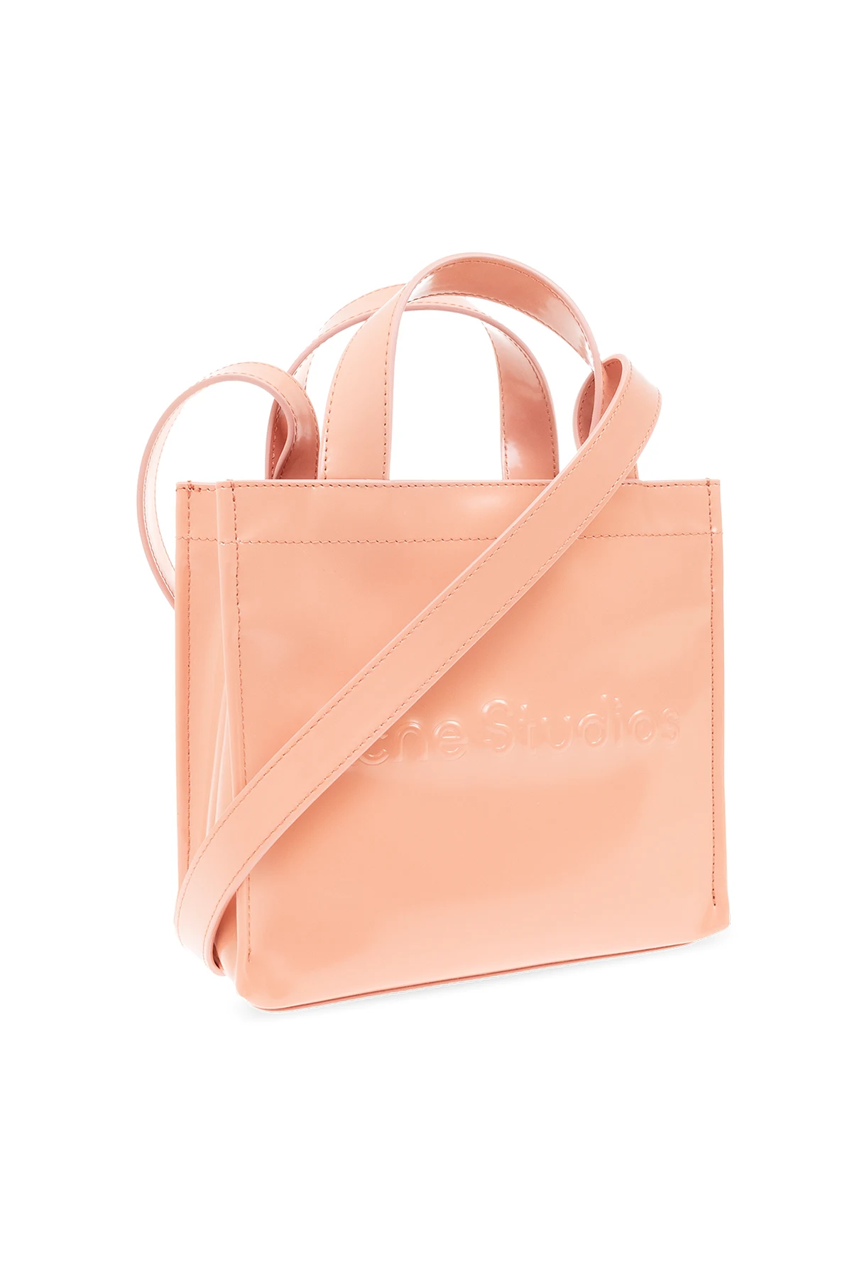 Różowa, lekko połyskująca torba na ramię Acne Studios. Zamykana na zatrzask. Z przodu wypukłe logo. Dwie półokrągłe rączki i pas na ramię. Wewnątrz komora z dwiema kieszeniami: wsuwaną oraz zamykaną na zamek.