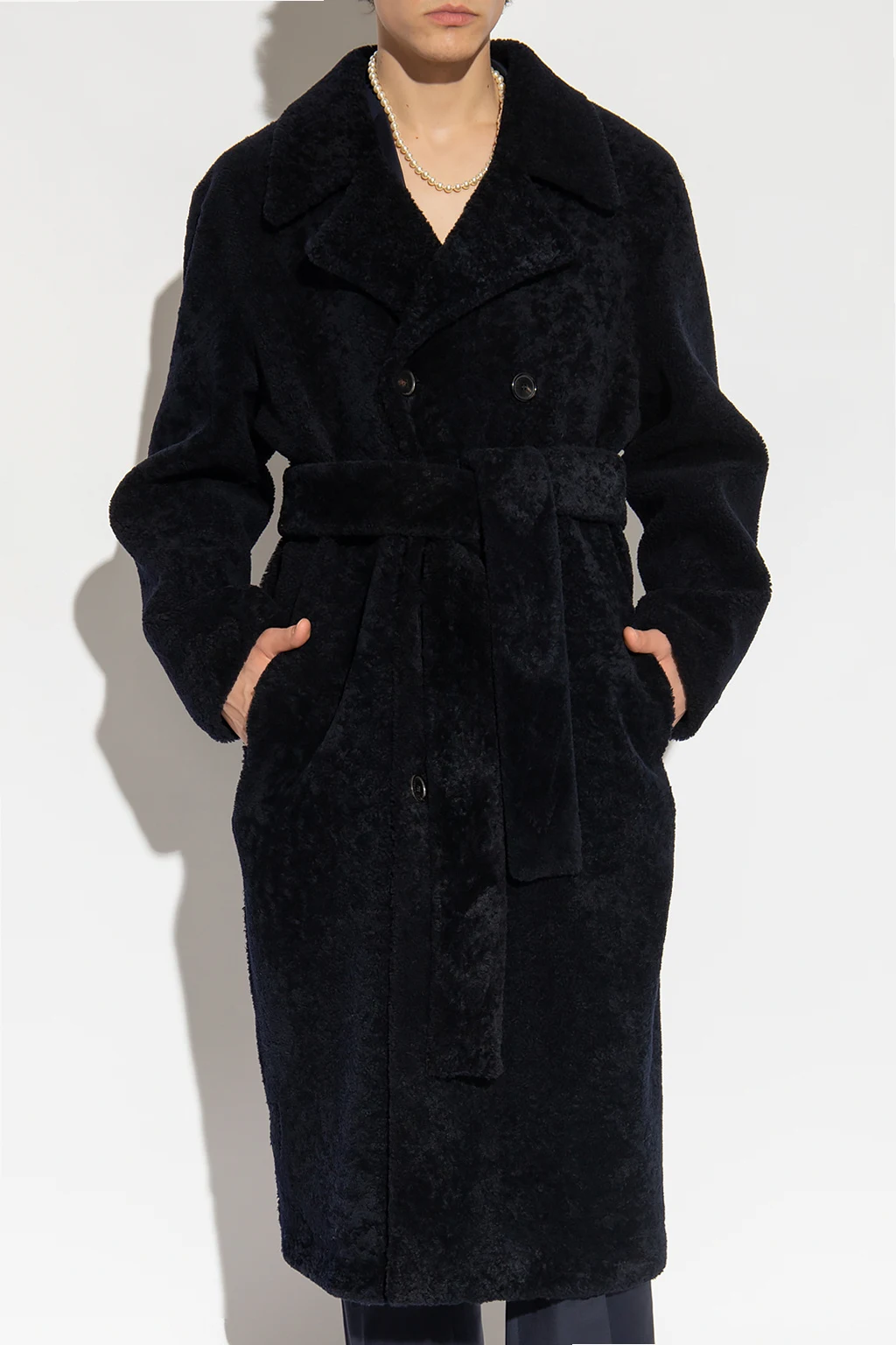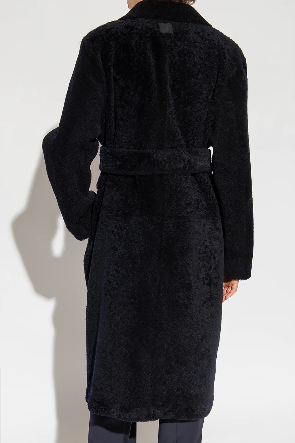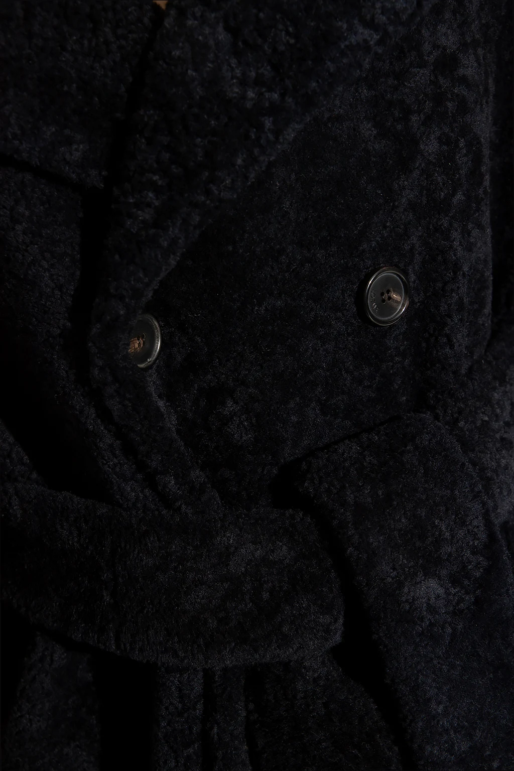 Granatowo-czarny, futrzany płaszcz Loewe. Wykonany ze skóry jagnięcej. Dwurzędowe zapięcie na guziki oraz wiązanie w pasie. Dwie kieszenie wsuwane. Otwarte klapy. Długie rękawy.