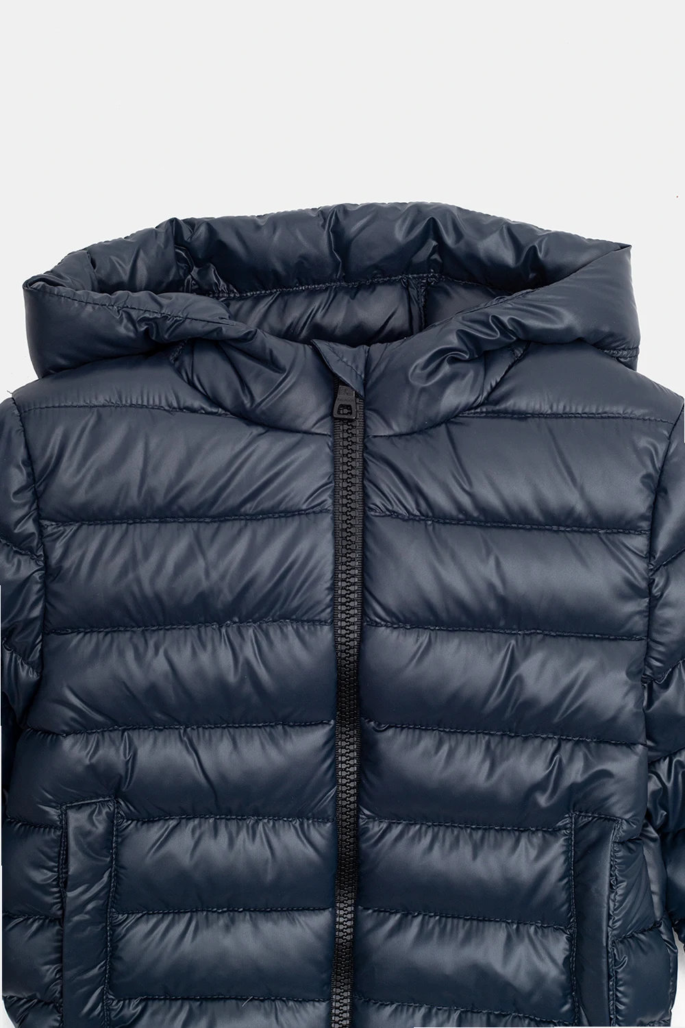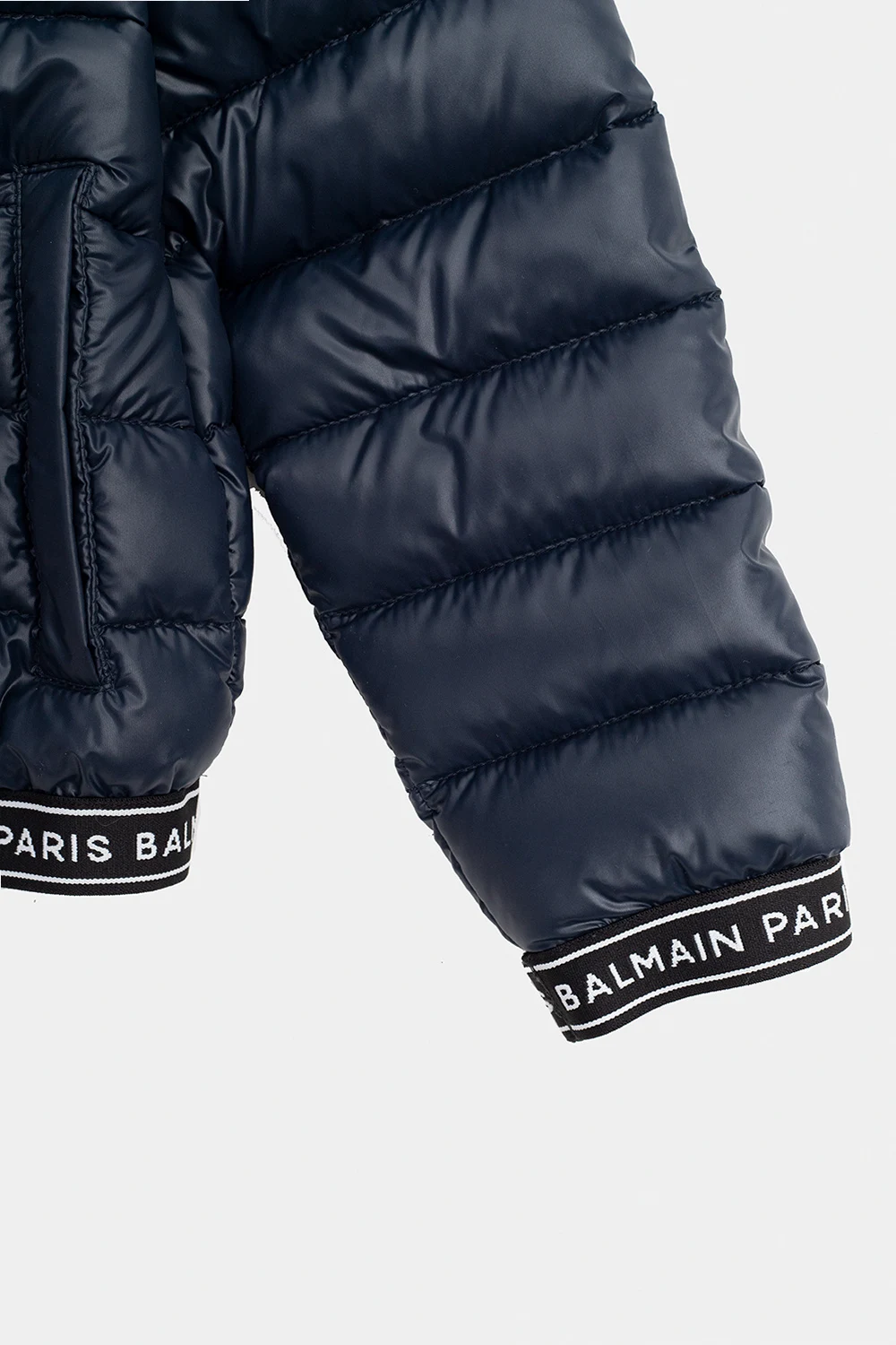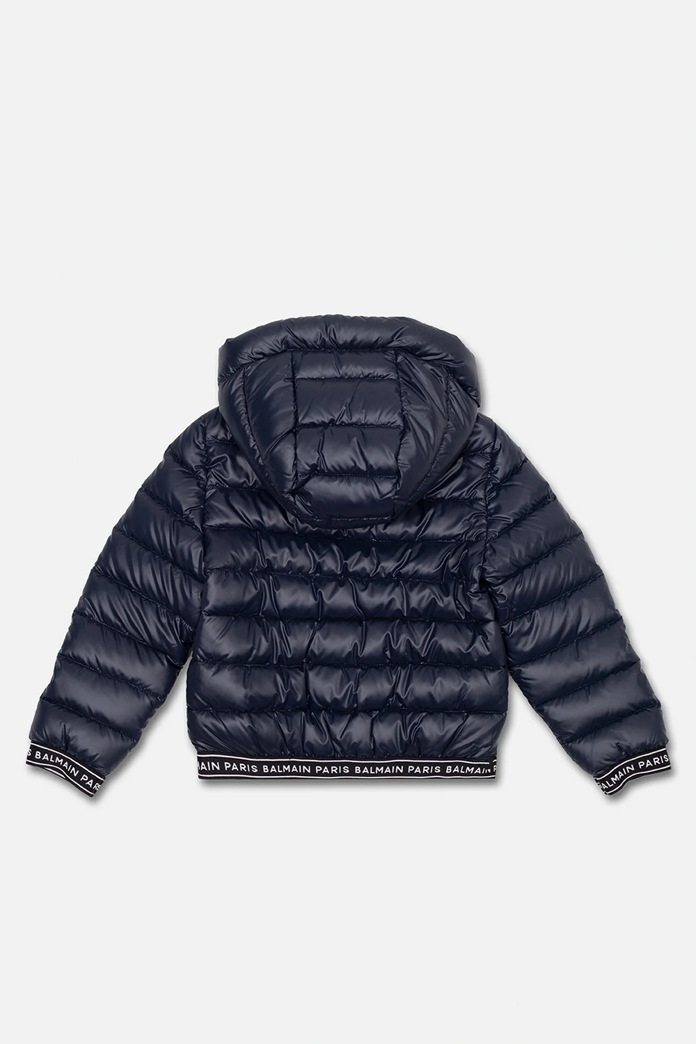 Granatowa, pikowana kurtka puchowa z kapturem Balmain Kids. Zapinana na zamek. Dwie wsuwane kieszenie. Długie rękawy oraz dół wykończone czarnym ściągaczem z wyszytym białą nicią, powtarzającym się logo.
