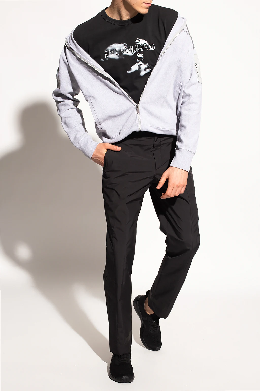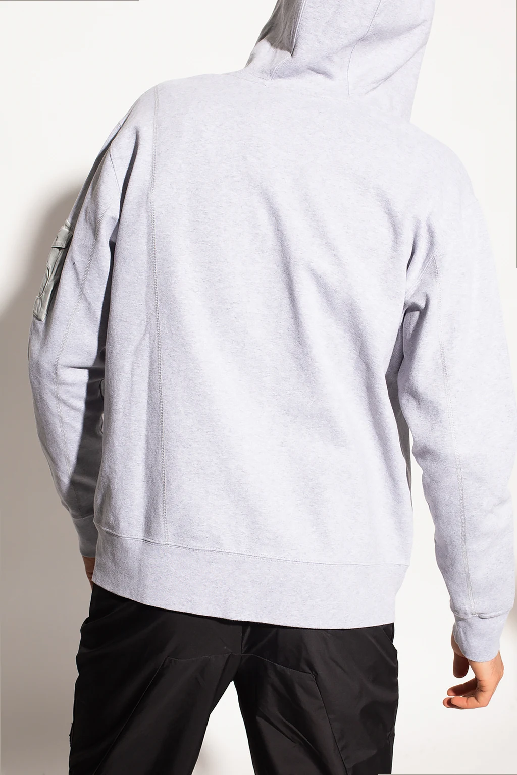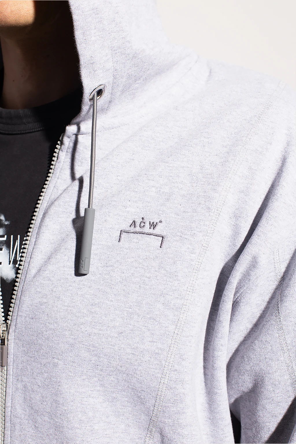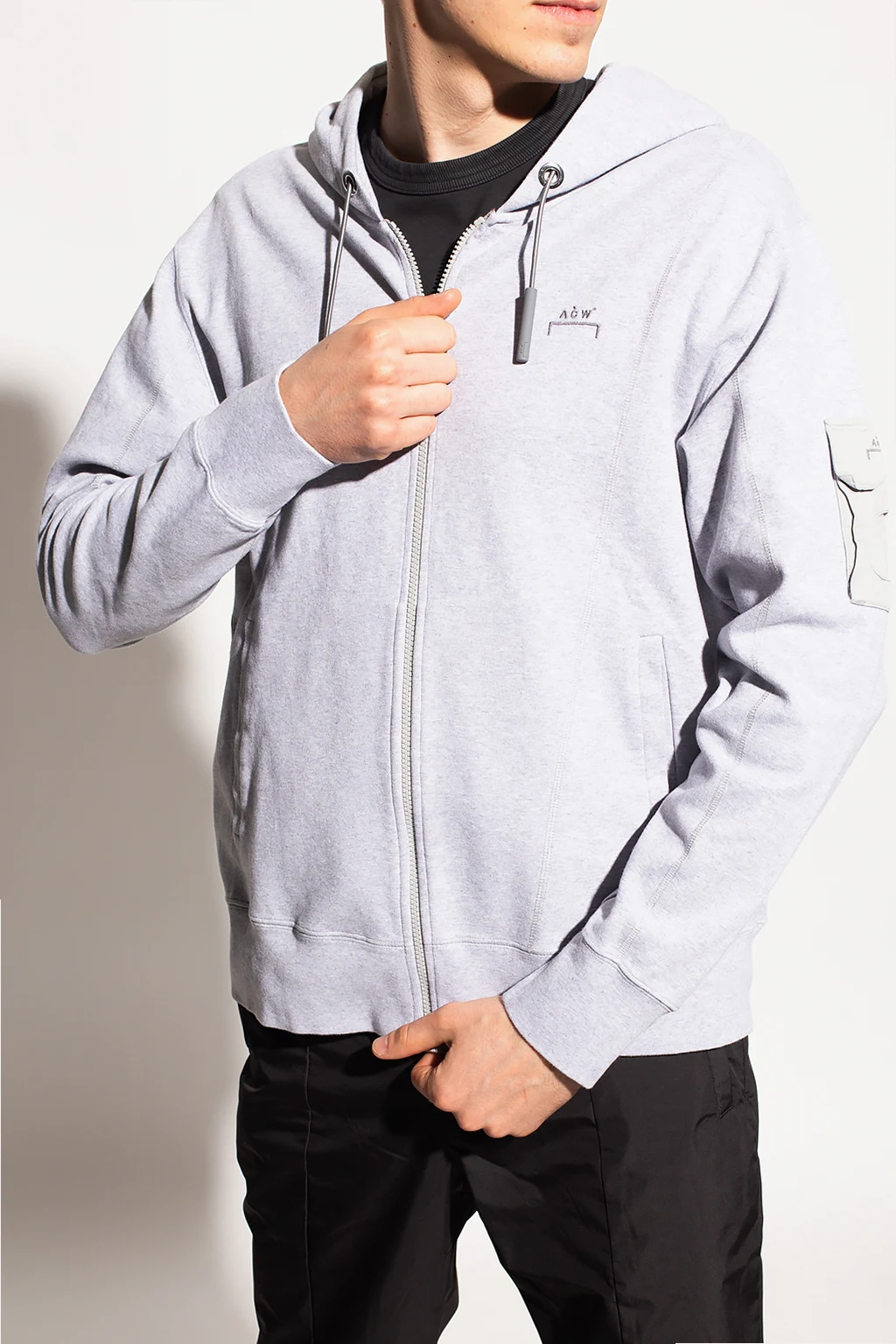 Szara, bawełniana bluza A-Cold-Wall. Zapinana na zamek. Kaptur ściągany trokami. Ozdobiona wyszytym logo. Z przodu dwie kieszenie. Długie rękawy i dół bluzy zakończone ściągaczem. Na rękawie kieszeń z patką zapinana na rzep.