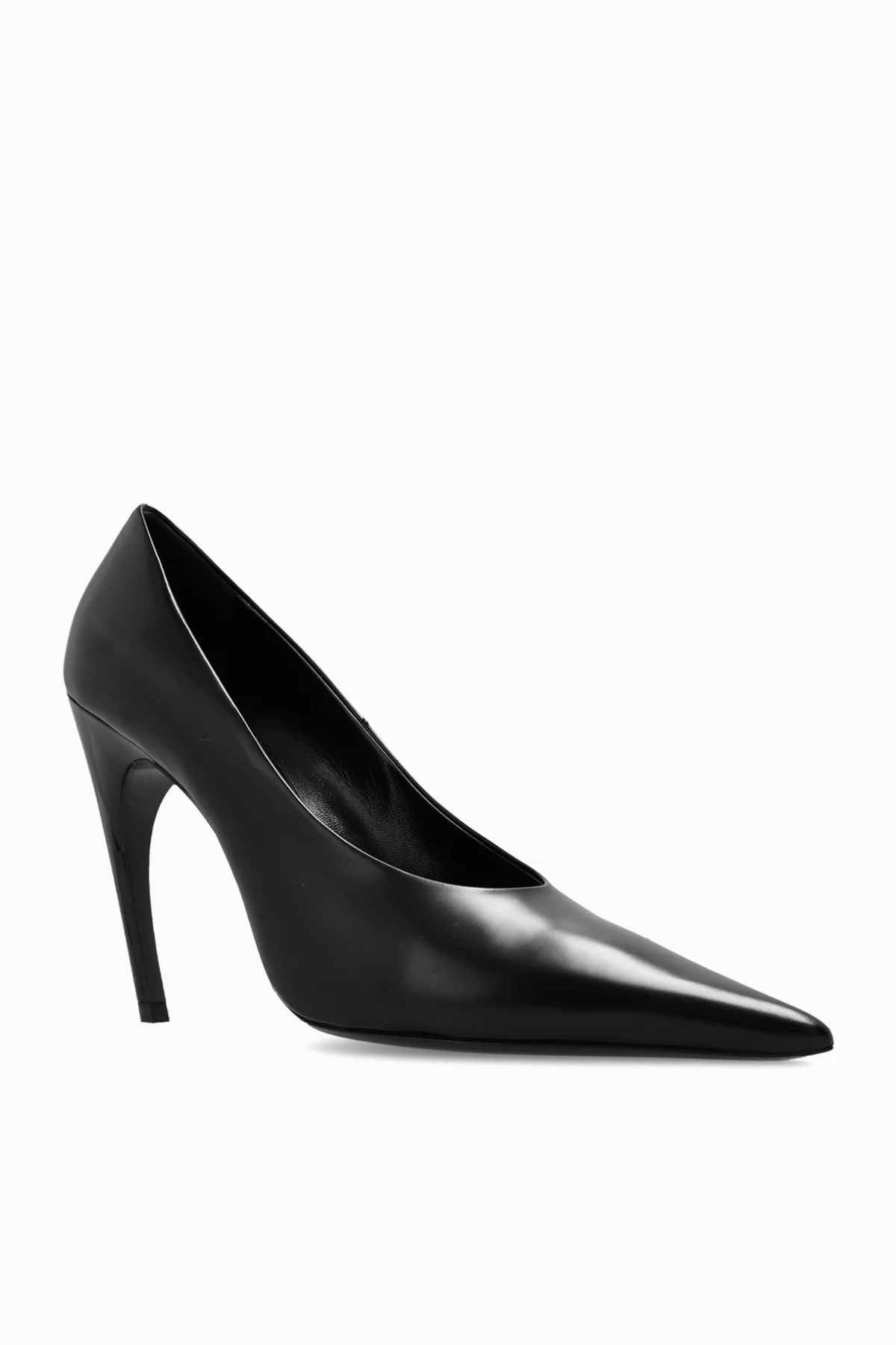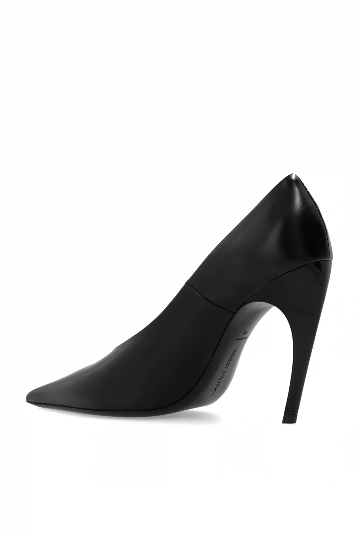 Czarne szpilki Nensi Dojaka. Wykonane ze skóry. Nosek w szpic. Dekoracyjnie zakrzywiony obcas. Czarna, skórzana podeszwa.