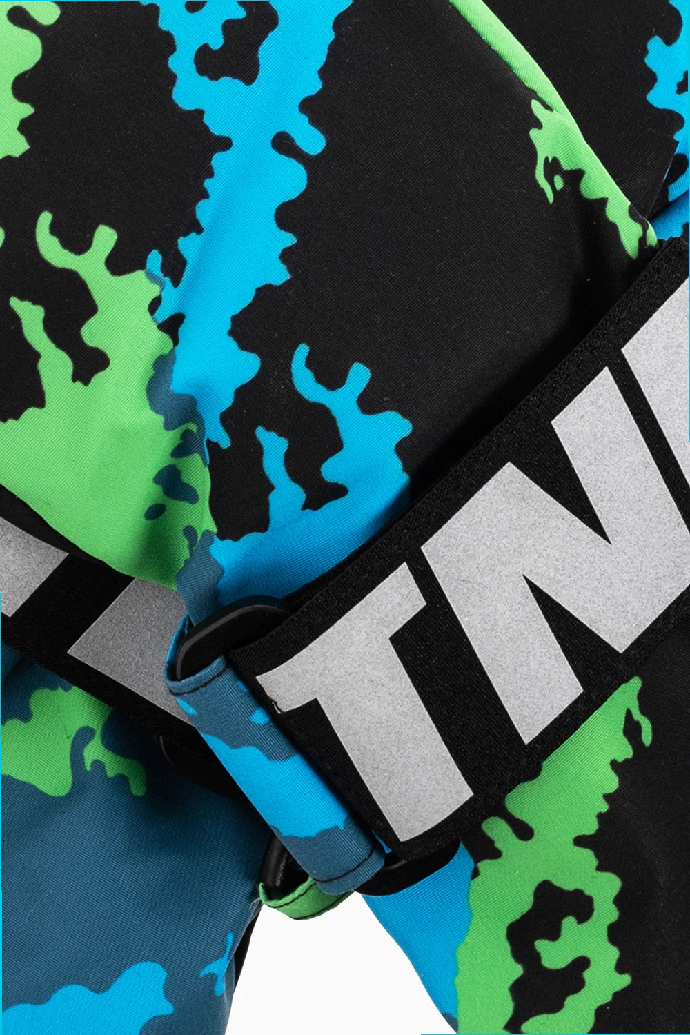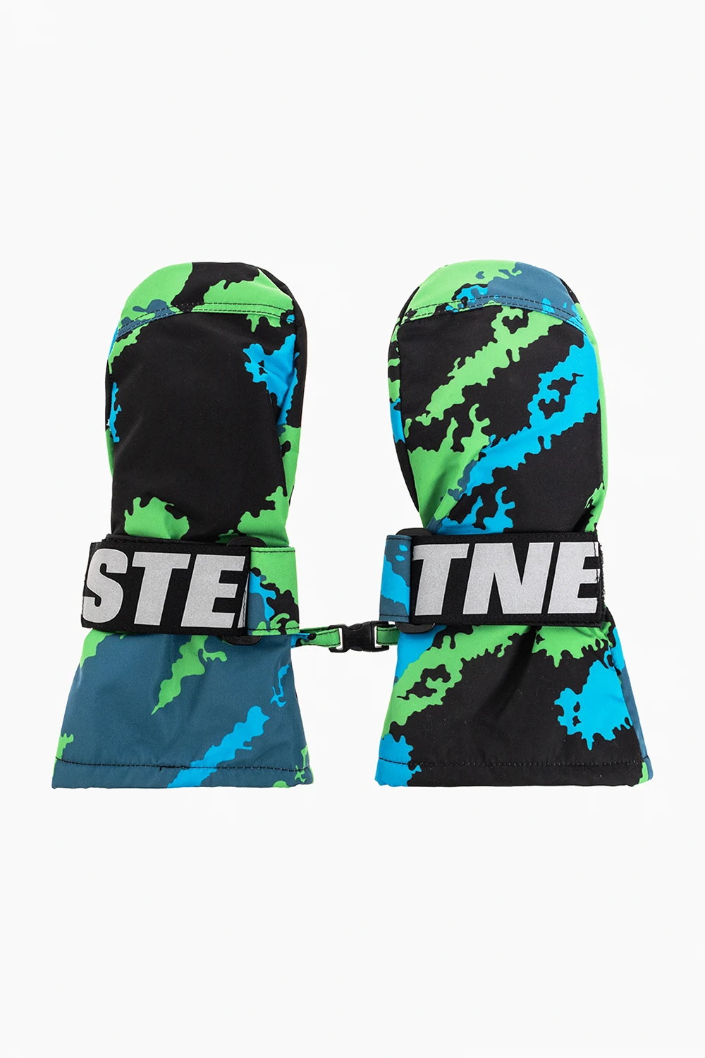 Czarno-niebiesko-zielone rękawice Stella McCartney Kids. Wykonane z materiału pochodzącego z recyklingu. Ocieplane izolacją THERMOLITE ® CORE. Zapinane na szerokie rzepy z nadrukowanym, odblaskowym logo. Ozdobione wzorem z motywem ‘moro’. Spodnia warstwa wykonana z imitacji skóry.