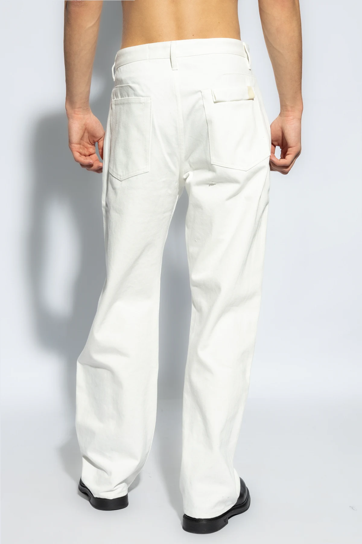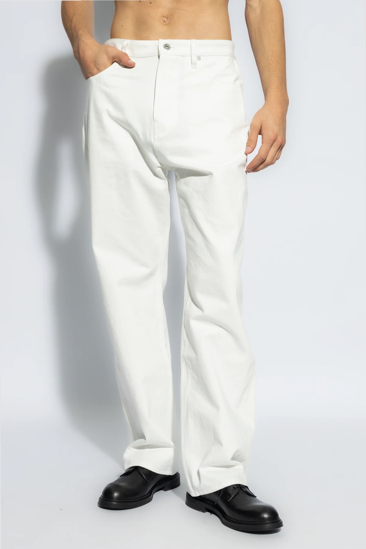 Białe jeansy o luźnym kroju JIL SANDER. Zapinane na guziki. Ozdobione logo. Pięć wsuwanych kieszeni. Długie nogawki o prostym kroju.
