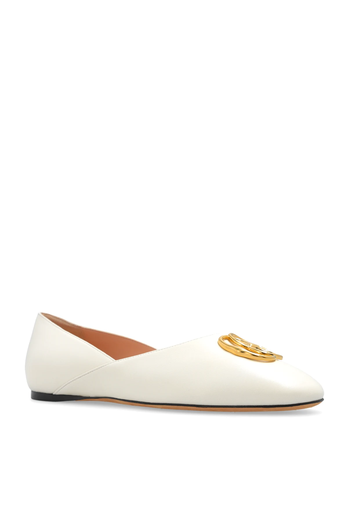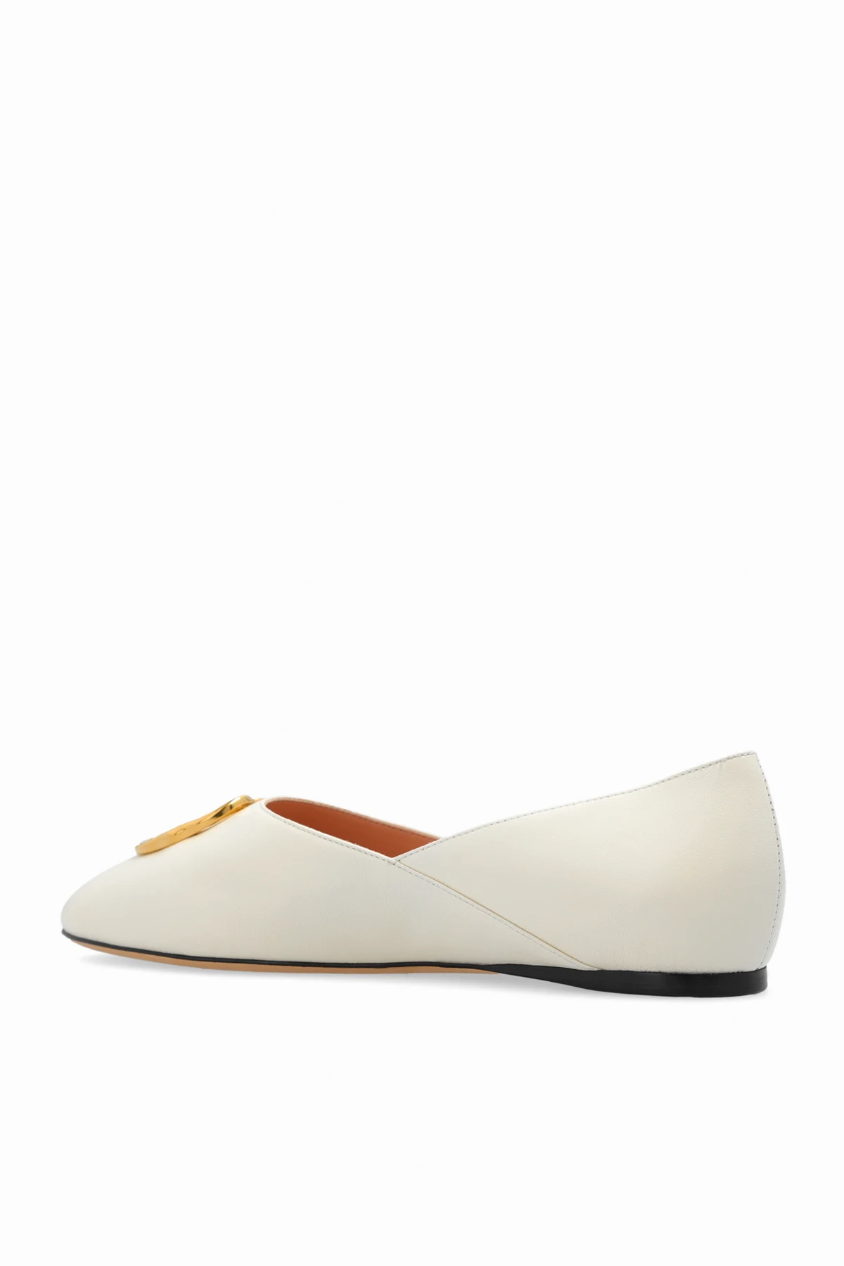 Kremowe baleriny, model ‘Gerry’ Bally. Wykonane ze skóry jagnięcej. Ozdobione metalową aplikacją w kształcie logo w kolorze złotym. Zaokrąglony nosek. Beżowo-czarna, skórzana podeszwa.