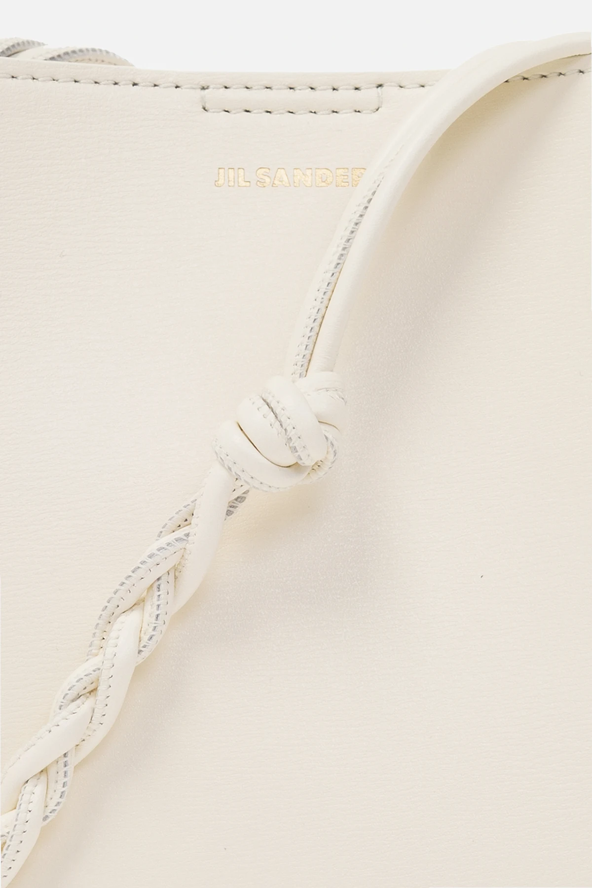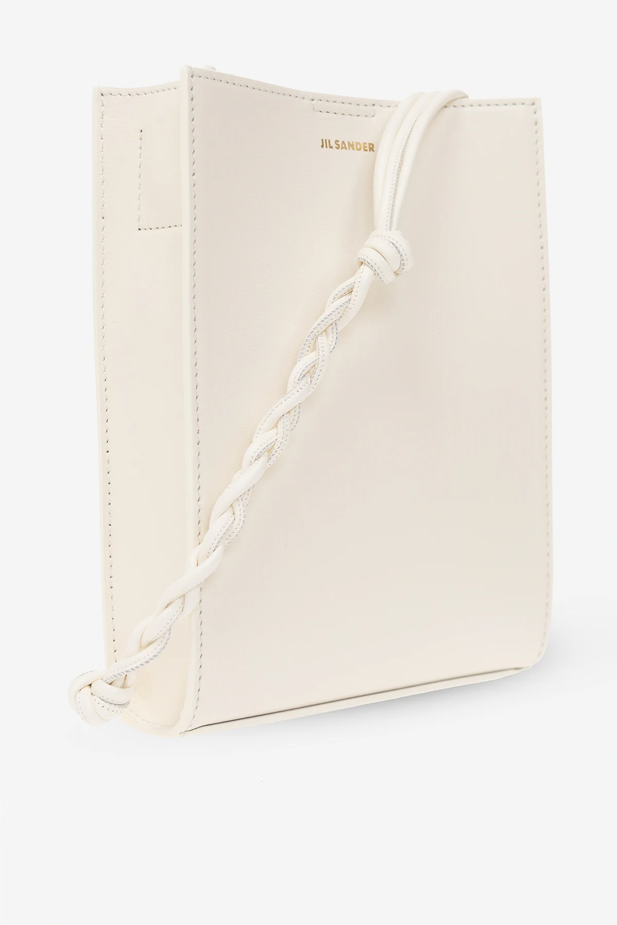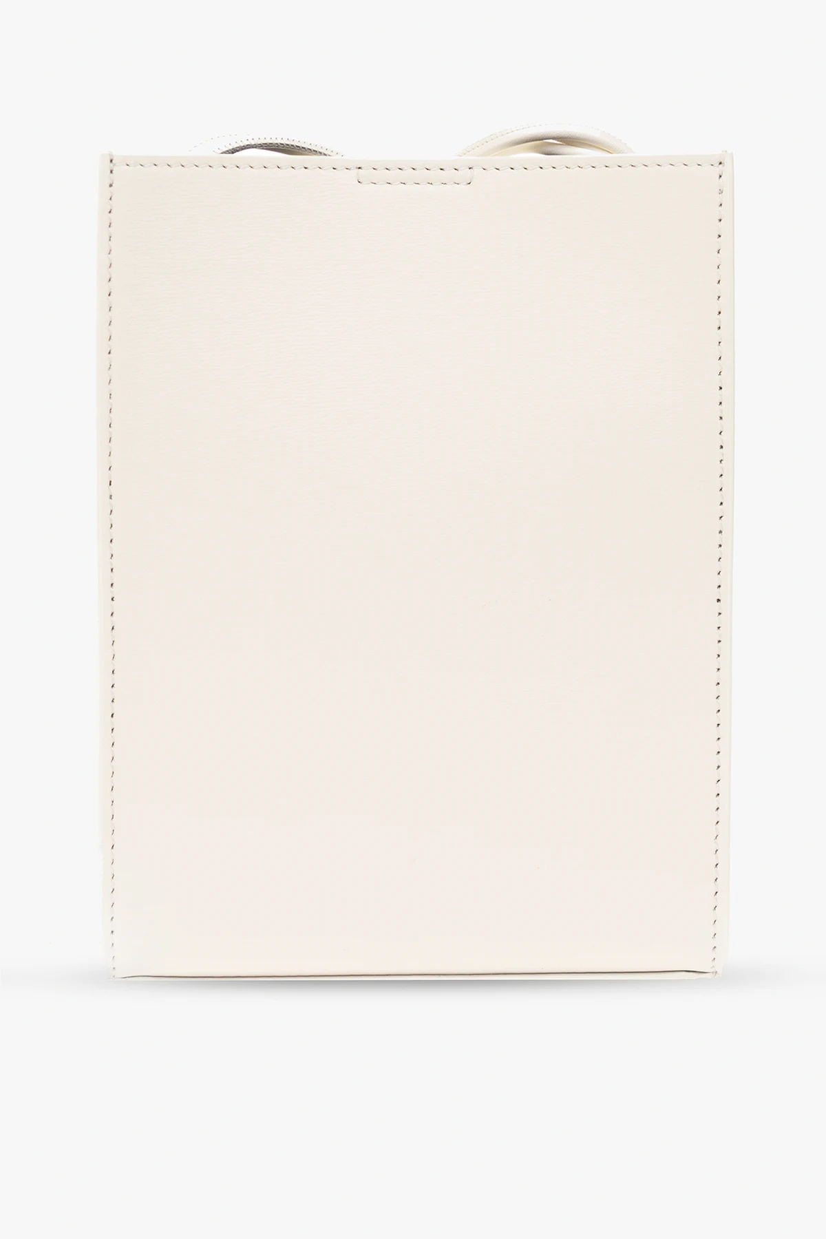 Kremowe etui na telefon, model ‘Tangle Small’ JIL SANDER. Wykonane ze skóry. Zamykane na magnetyczny zatrzask. Z przodu nadrukowane logo w kolorze złotym. Ręcznie pleciony pasek na ramię. Wewnątrz komora. Metalowe elementy w kolorze złotym.