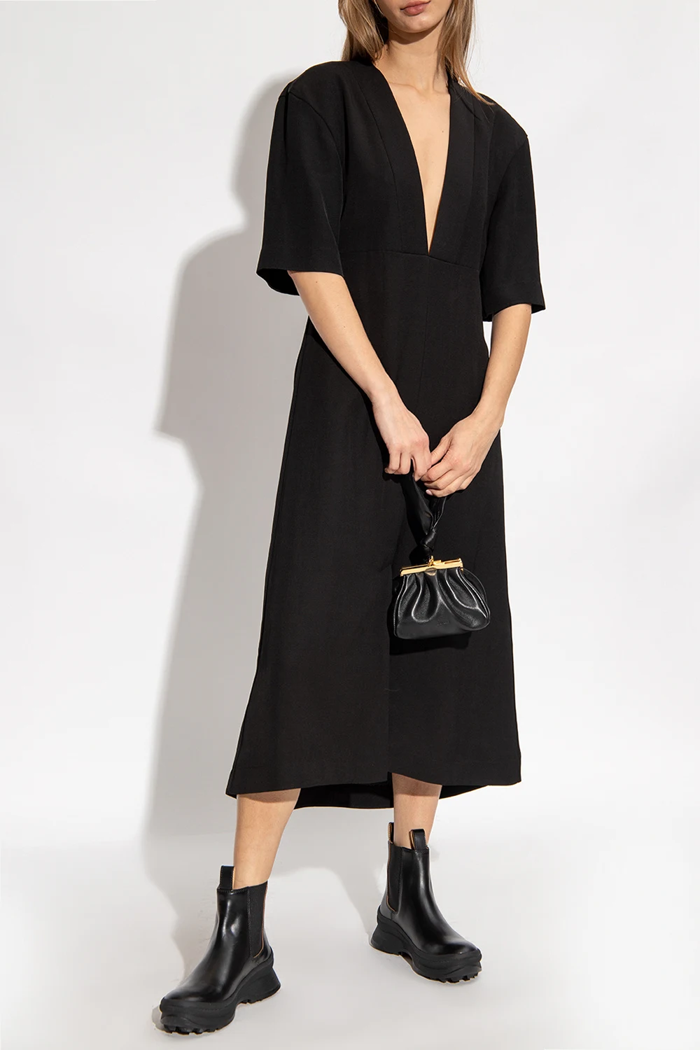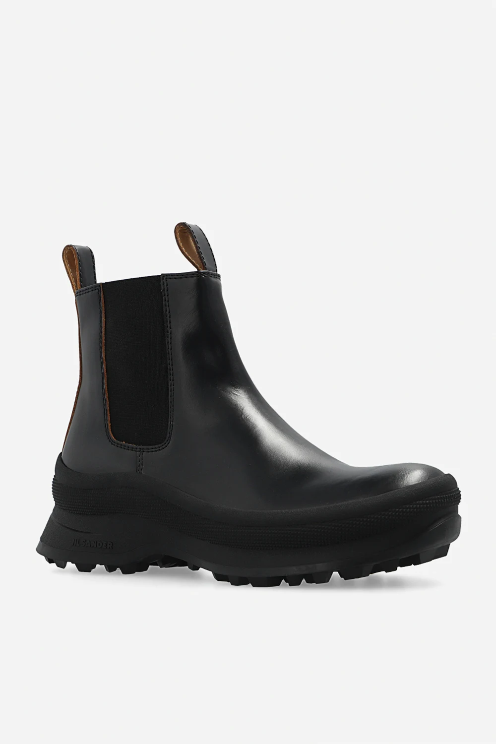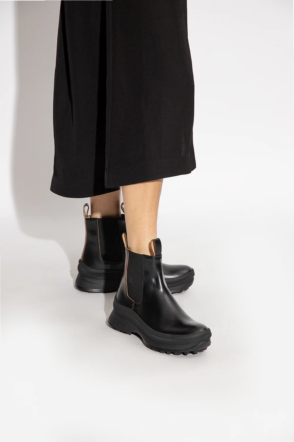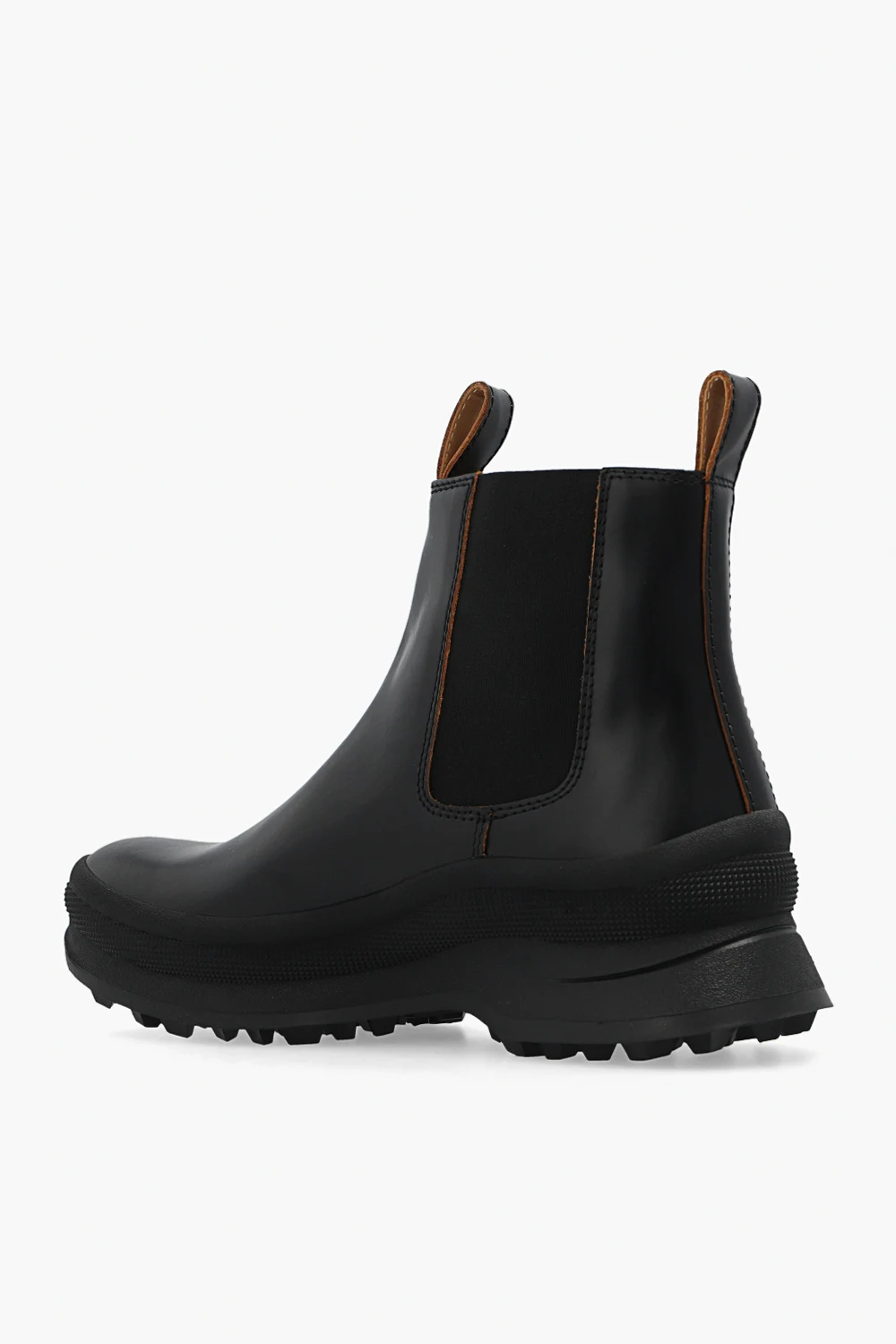 Czarne sztyblety Jil Sander. Wykonane z cielęcej skóry. Po bokach wszyta taśma elastyczna. Czarna, gumowa podeszwa ‘Vibram’.