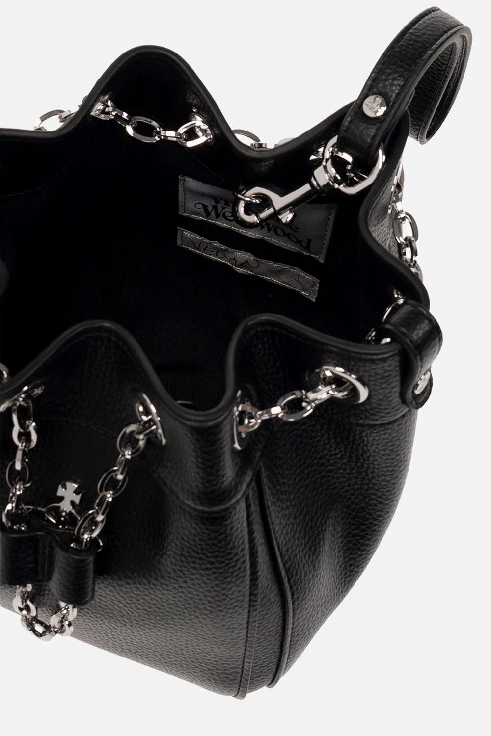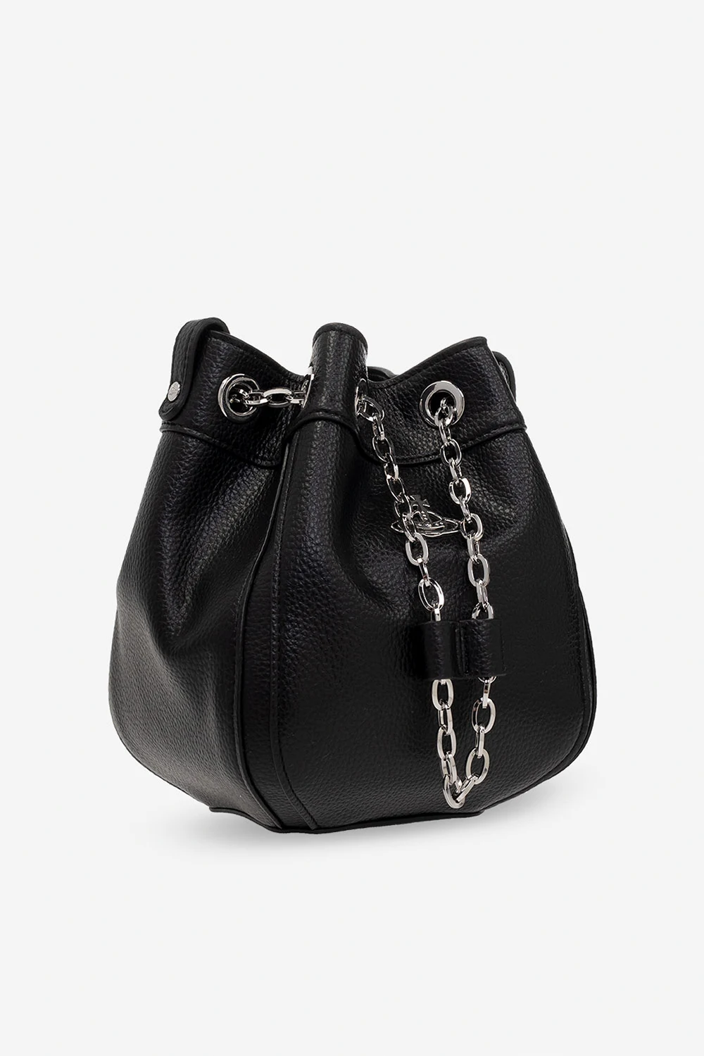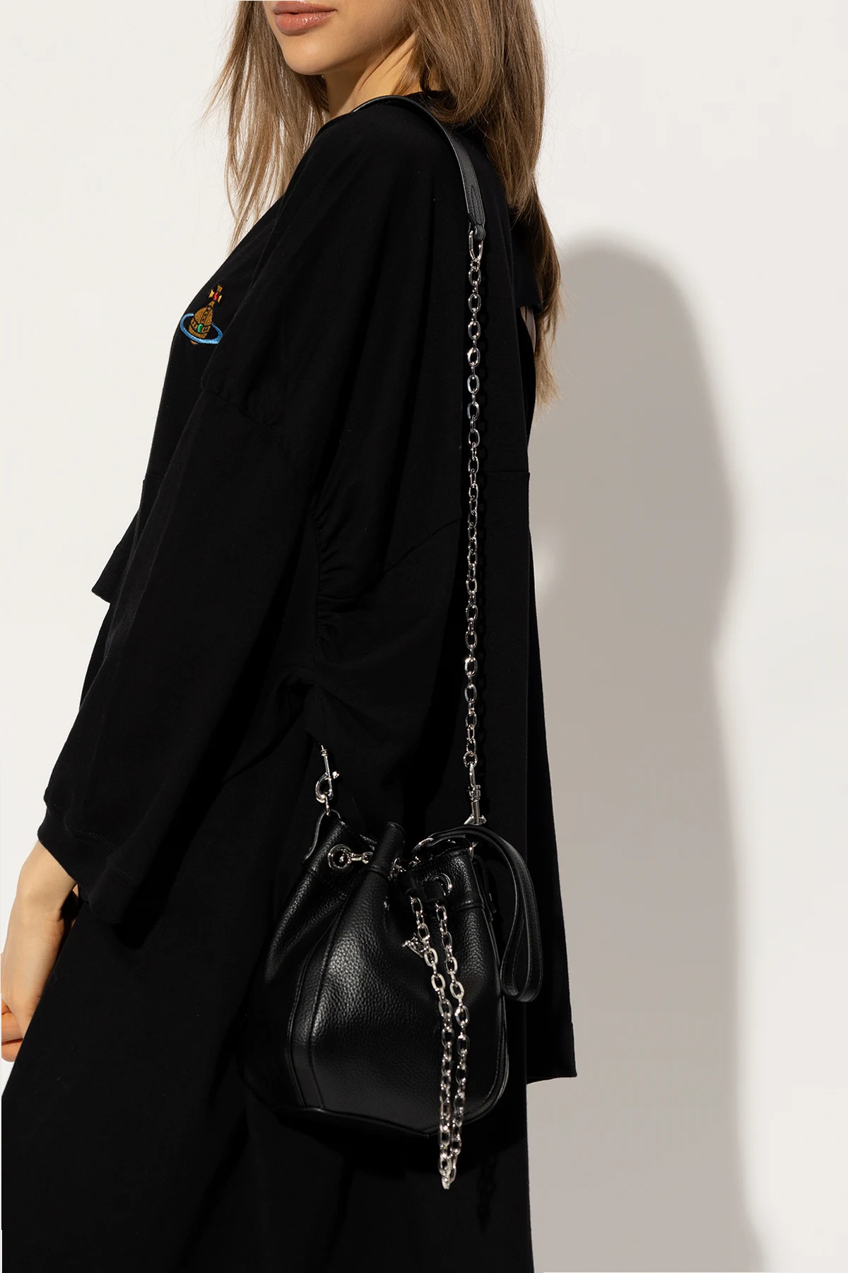 Czarna torba na ramię, model 'Chrissy Small' Vivienne Westwood. Wykonana z materiału imitującego skórę. Ozdobiona aplikacją z logo. Pas na ramię. Wewnątrz komora. Metalowe wykończenie w kolorze srebrnym.